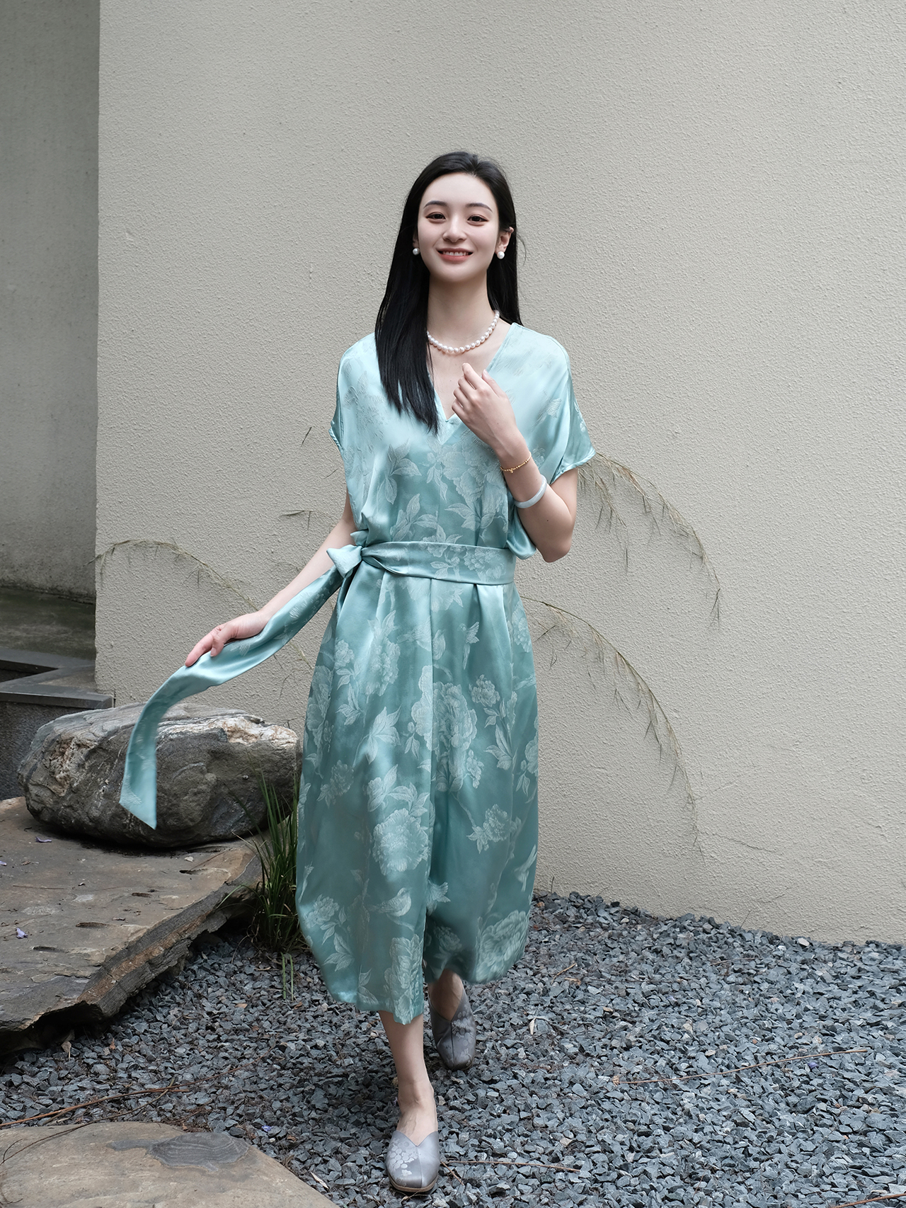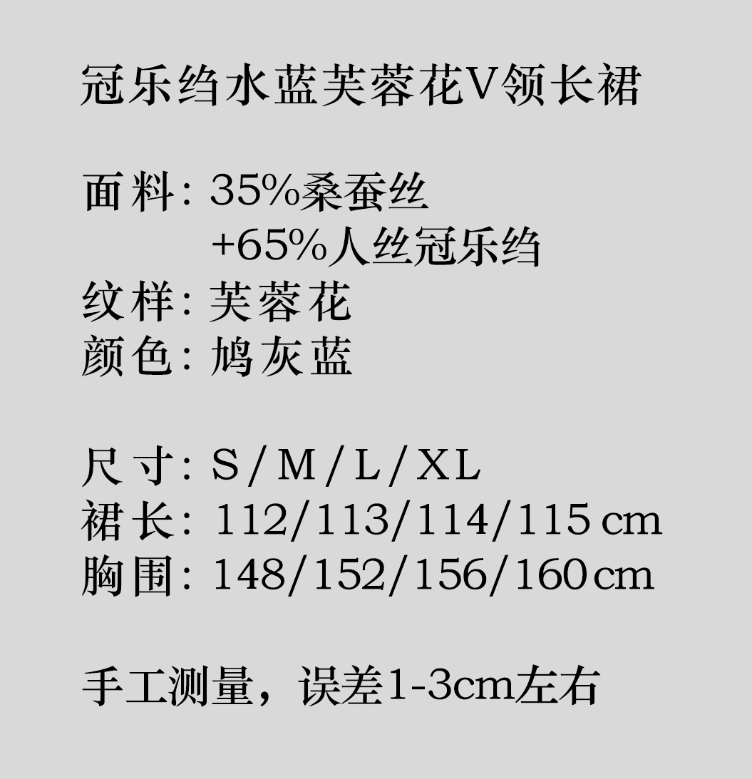 瑕疵|盛唐牡丹 |冠乐绉水蓝芙蓉花V领长裙(配腰带 )[特价品]](特殊商品不退不换)