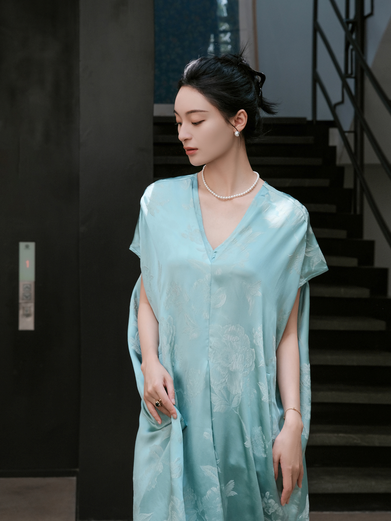 盛唐牡丹 |孔雀蓝双面穿菊花纹提花真丝外套