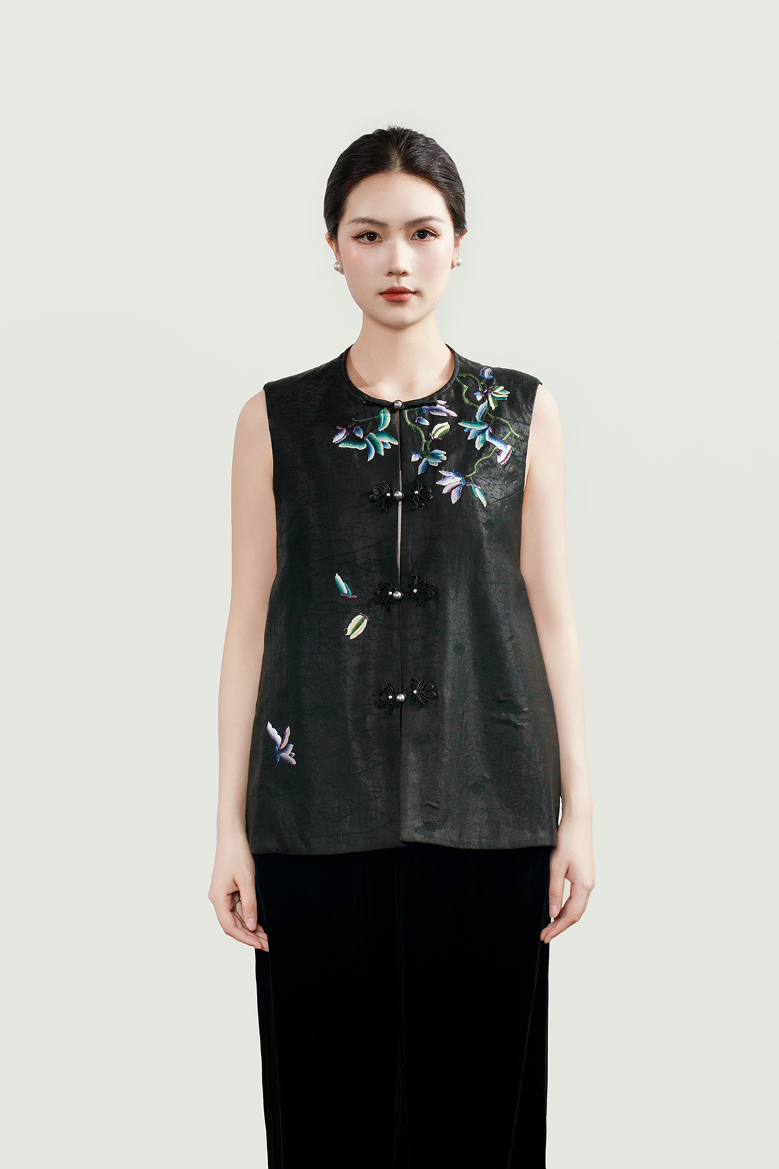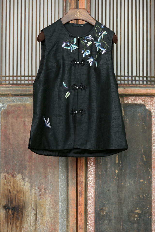 盛唐牡丹大师系列 | 真丝香云纱手绣薄棉马甲 (盛唐牡丹与非遗传承人王小潇联名系列)
