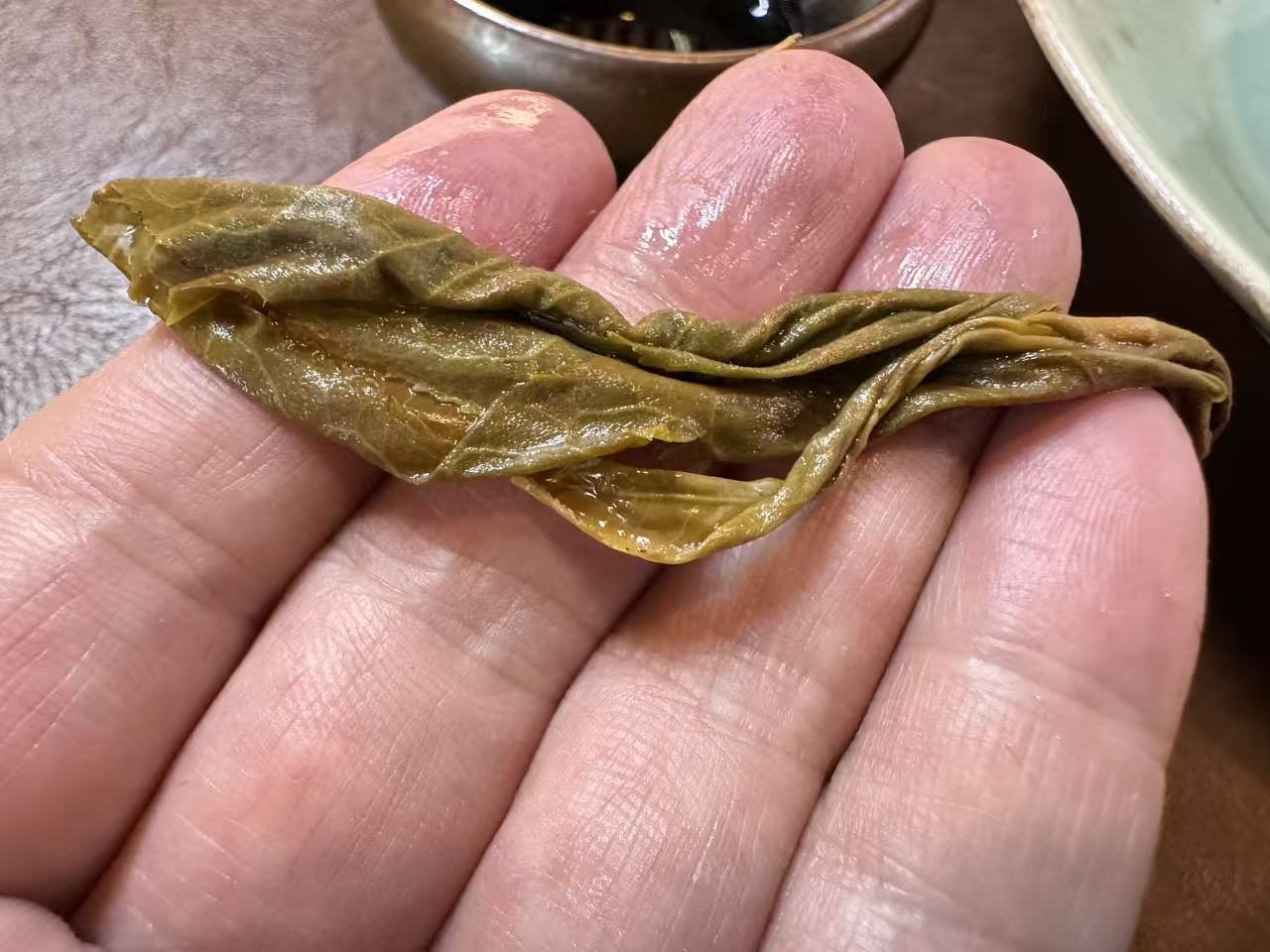第五道,叶底完全伸展开后,大家仔细看茶叶的脉络、有很好的革质感,但嫩度还非常高,即使叶片大一些的部分,也是非常嫩,这就是森林茶特有的高持嫩度,持嫩度高的茶自然就会有更丰富的内质,茶最怕的的粗老木质化,那就会空淡寡,咱们在任何一款茶的选料上,都会避开这样的缺点。