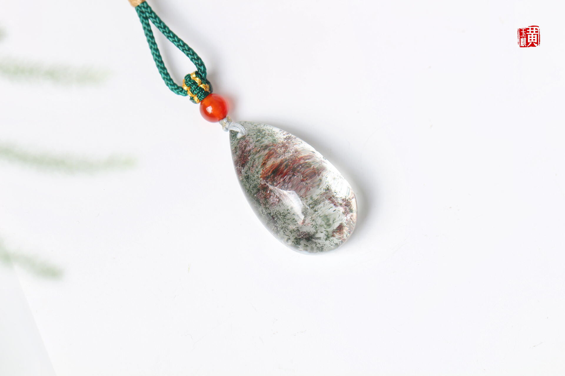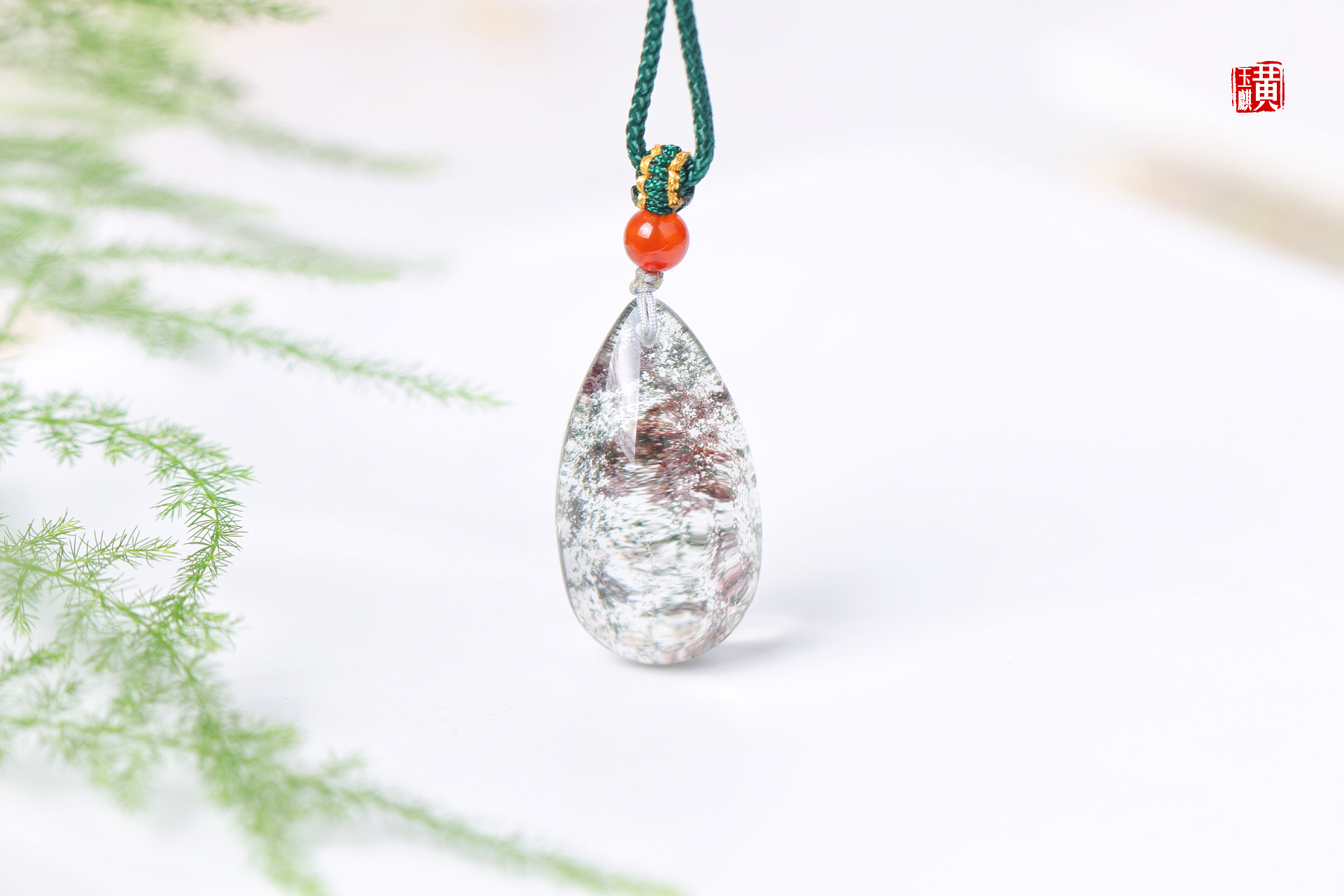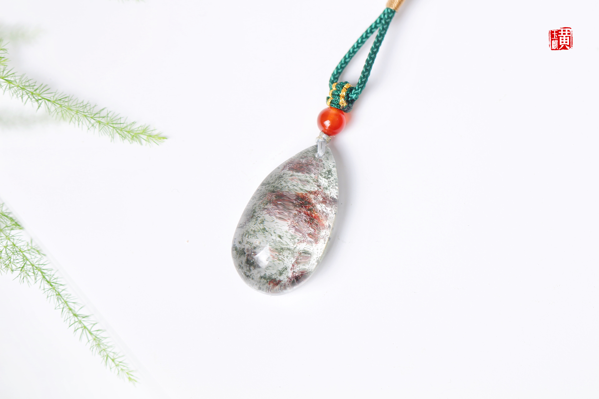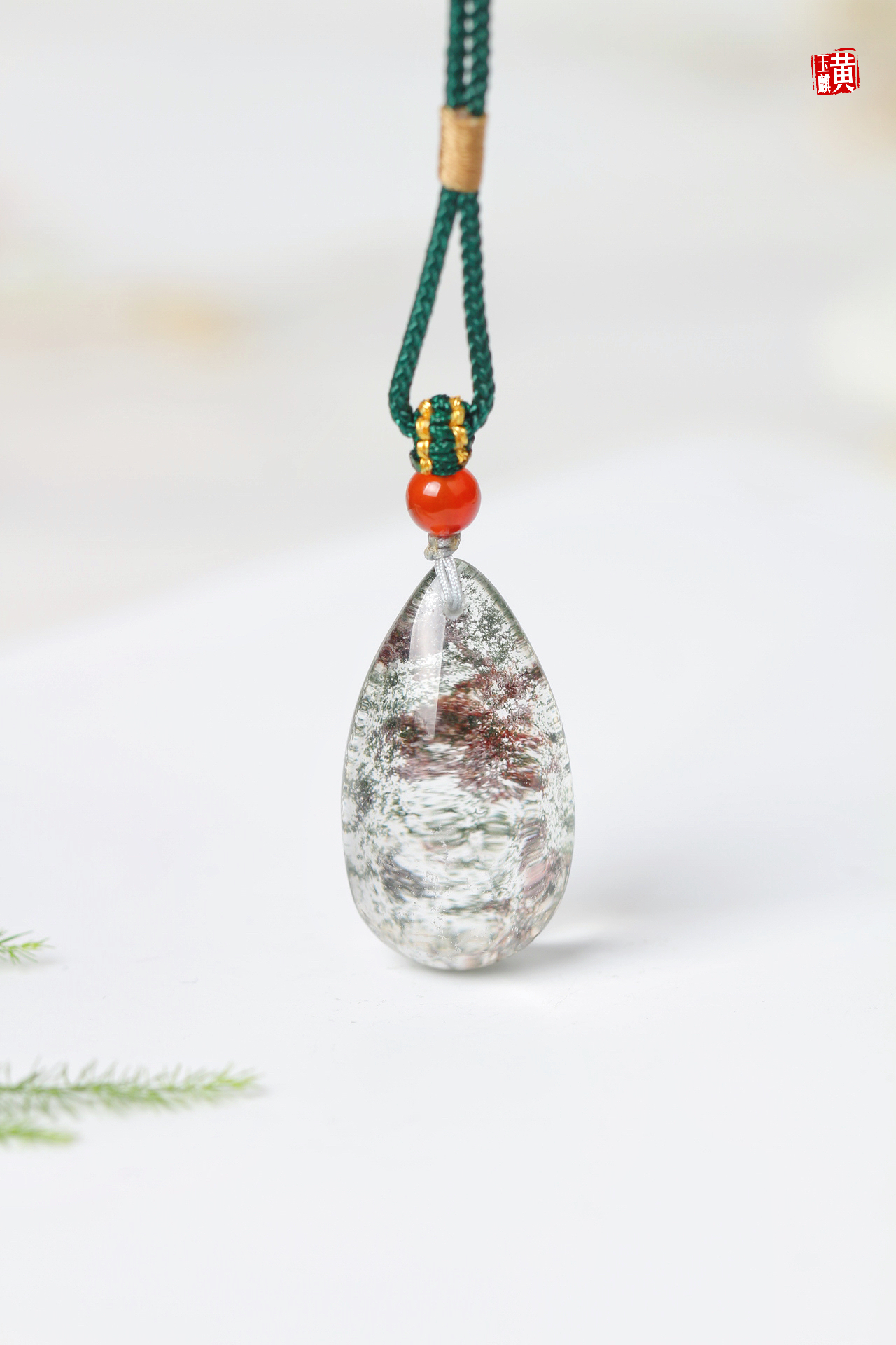 绿幽灵水晶吊坠,饱满的水滴形,晶莹剔透,内含绿幽灵和红幽灵形成了一幅山水泼墨画,漫山绿林中出现一片红枫,蔚为壮观,寓意财富汇聚。