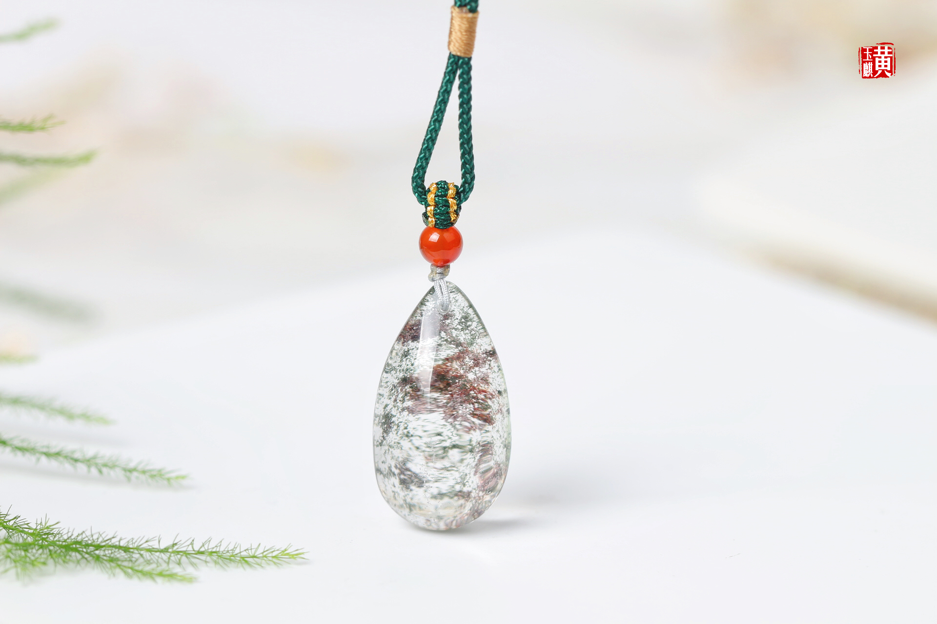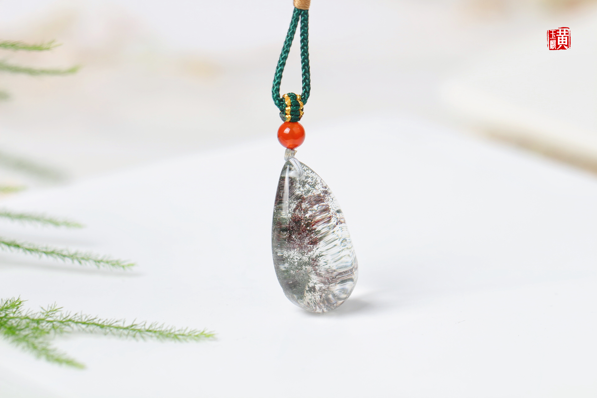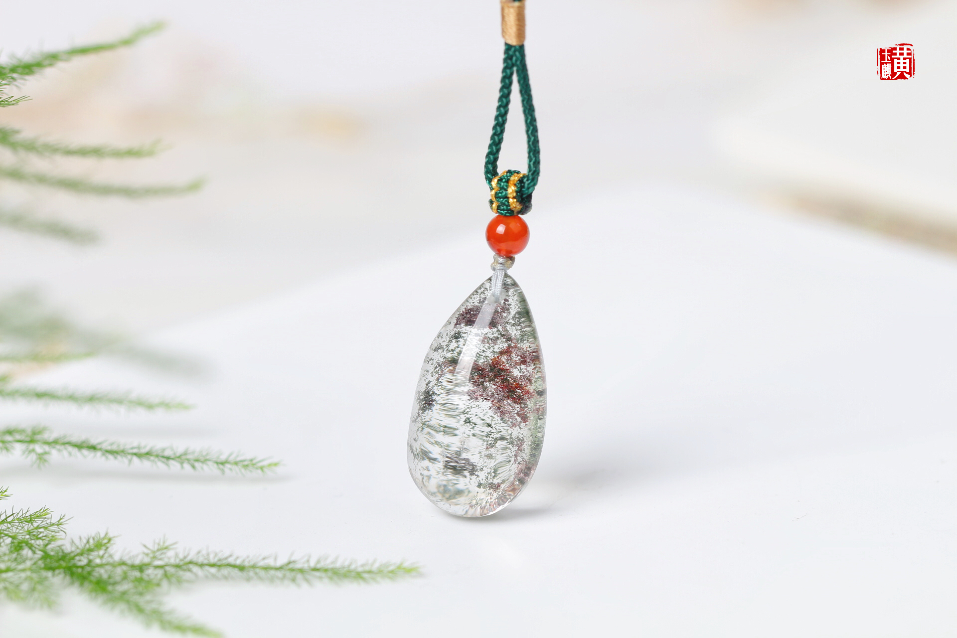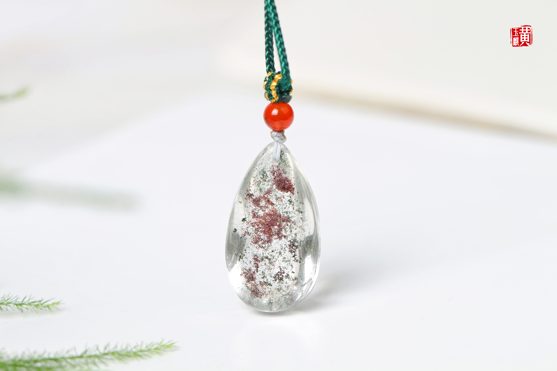 绿幽灵水晶吊坠,饱满的水滴形,晶莹剔透,内含绿幽灵和红幽灵形成了一幅山水泼墨画,漫山绿林中出现一片红枫,蔚为壮观,寓意财富汇聚。