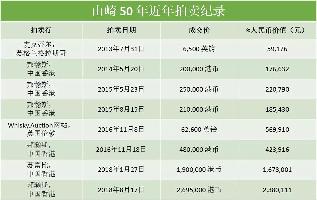 2018 年 1 月 27 日,在中国香港苏富比拍卖公司“珍稀佳酿”专场中,拍卖总成交额达 47,962,620 港元。而山崎 50 年单一麦芽威士忌 以 2,337,000 港元成交,逾高估价一倍,再次刷新威士忌世界拍卖纪录,成为拍卖史上“最贵日本威士忌”。
