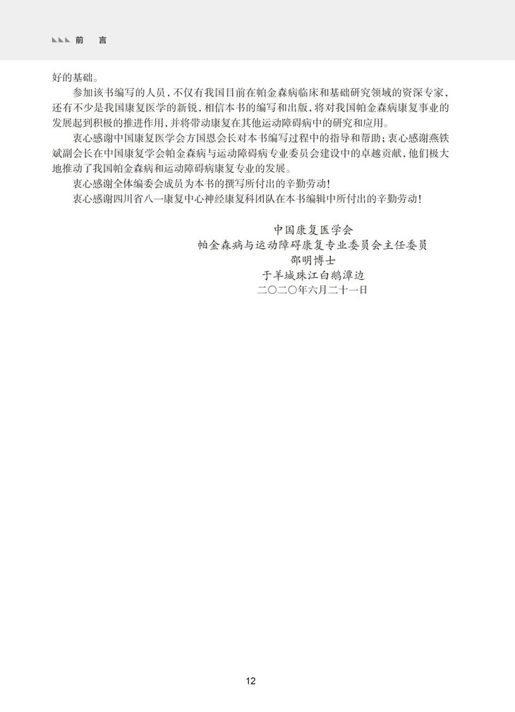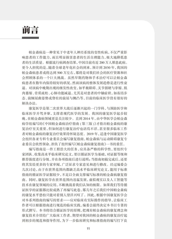 本书结合循证医学的原则,组织专家团队、收集高水平临床研究论文,以循证医学为基础,对证据等级和推荐强度进行分级,并在各项指南后进行说明;初稿完成后,将其发给更多的专家审阅,广泛征求专家意见和进行修改。经过编委会几次讨论,把现有帕金森病的康复理念和康复技术介绍给广大临床工作者,期望对我国的帕金森病的康复治疗起到初步的规范和指导作用,为下一步临床研究和标准指南的编写打下良好的基础。
