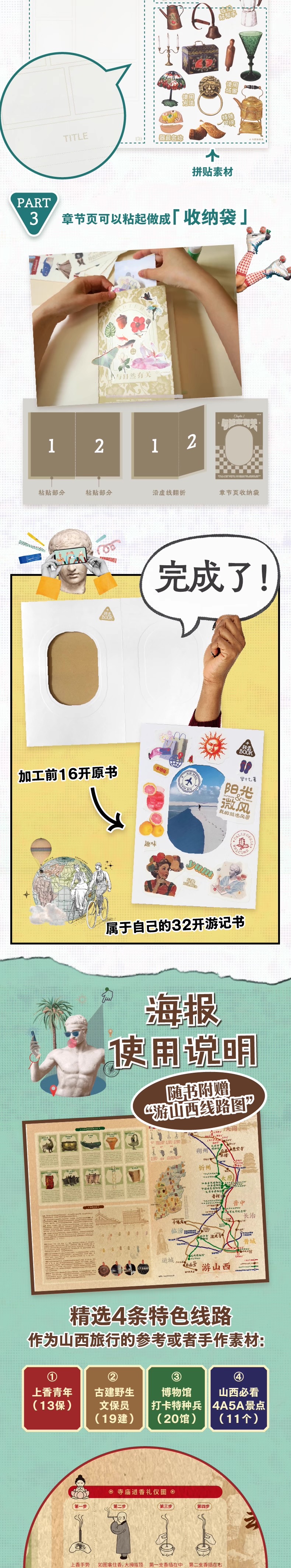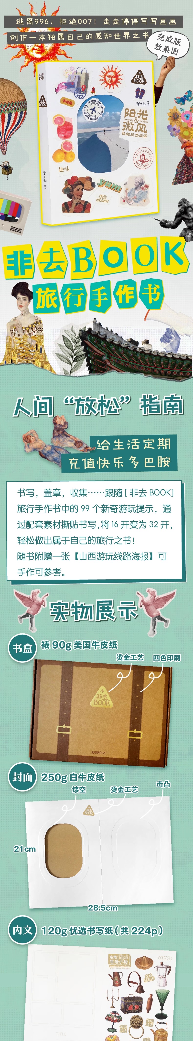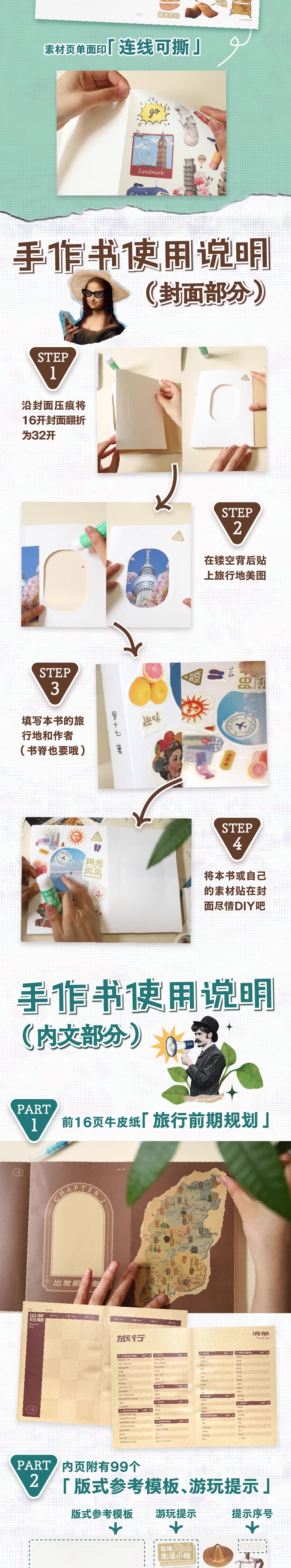 这是一本让你从“读者”变“作者”的手作旅行纪念书——通过深度参与创作,亲手定格每一段独家旅程。书中99个游玩提示贯穿城市探索、自然发现、民俗体验与自我对话,引导你用撕贴、书写等方式,一步步拼贴出独属于自己的游记故事。