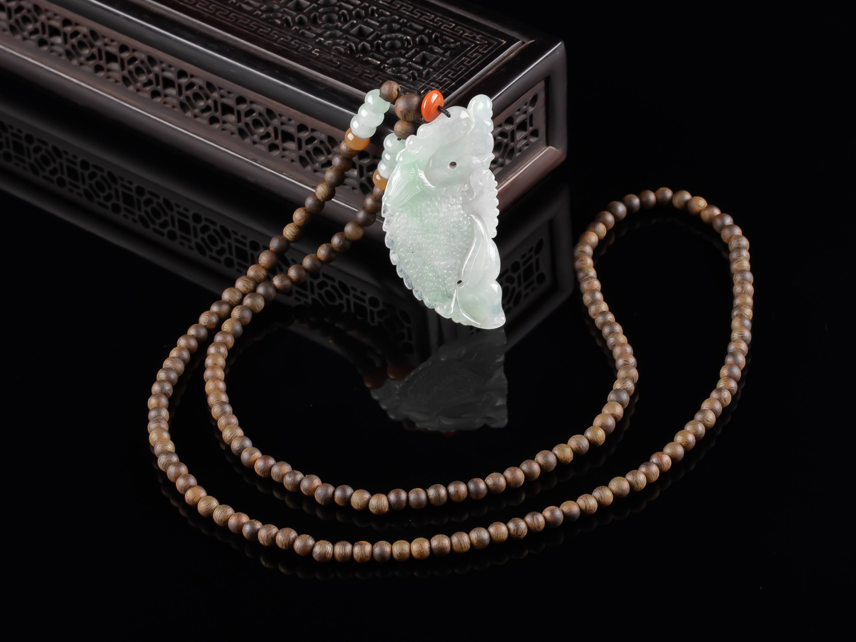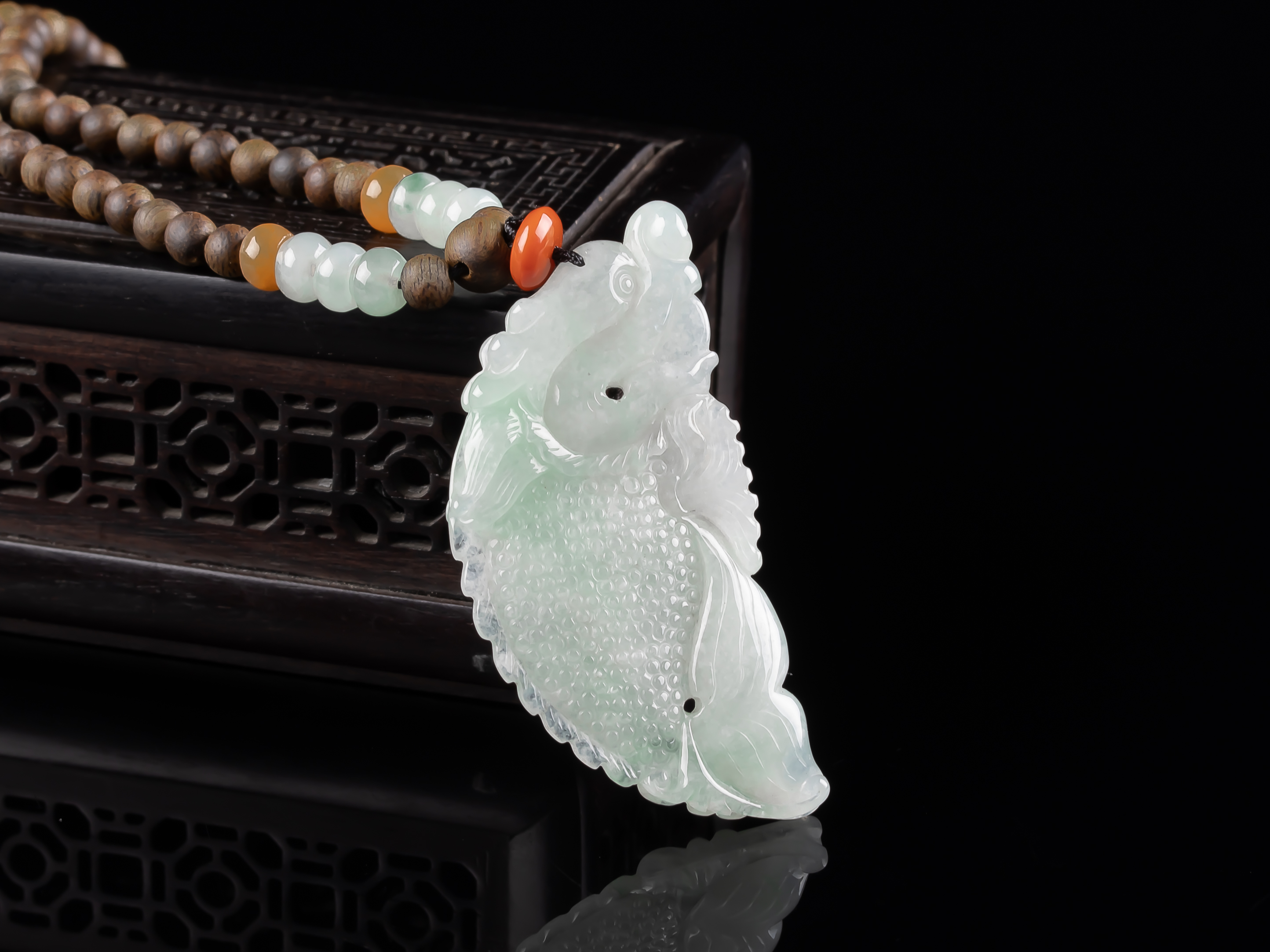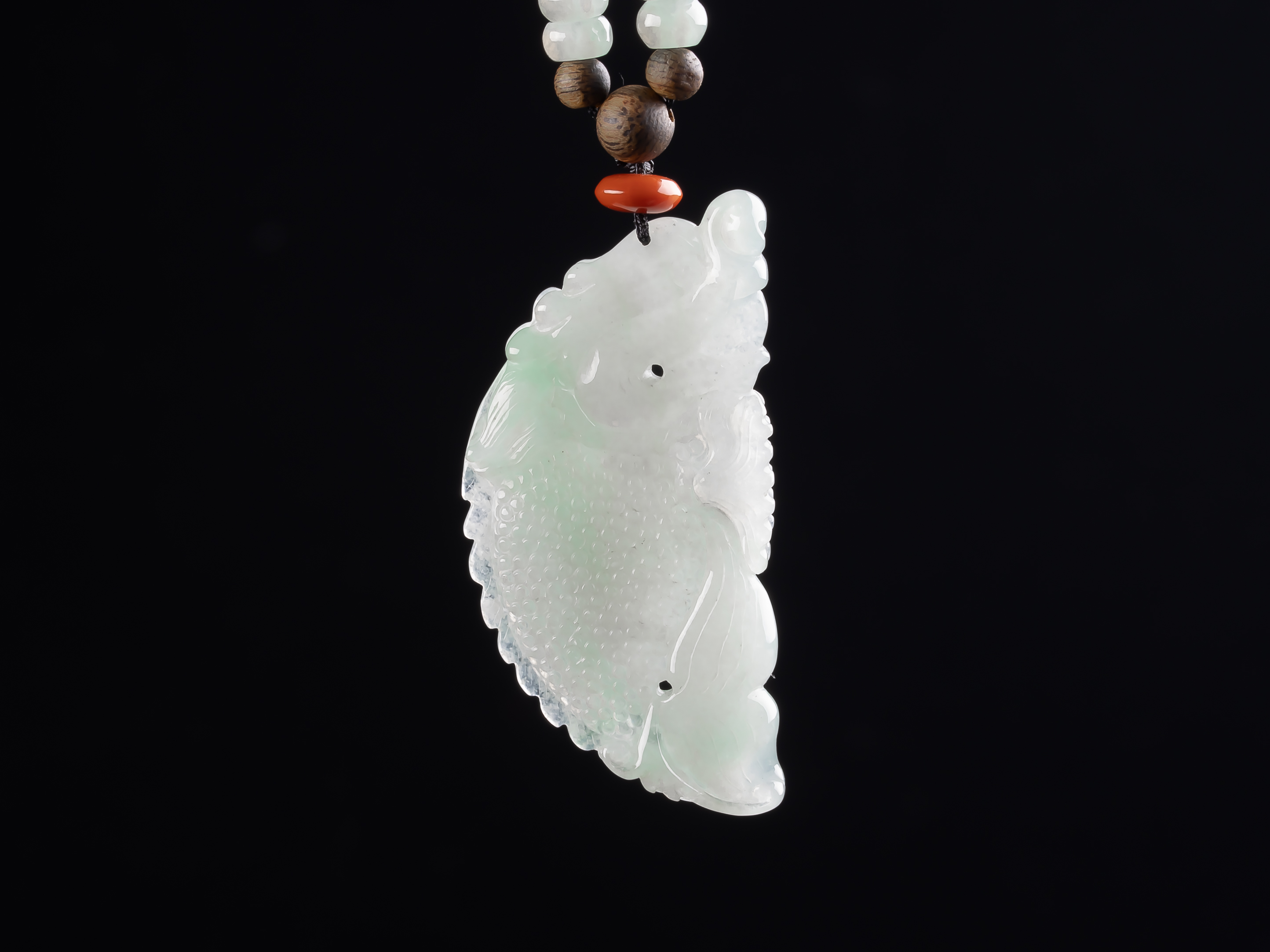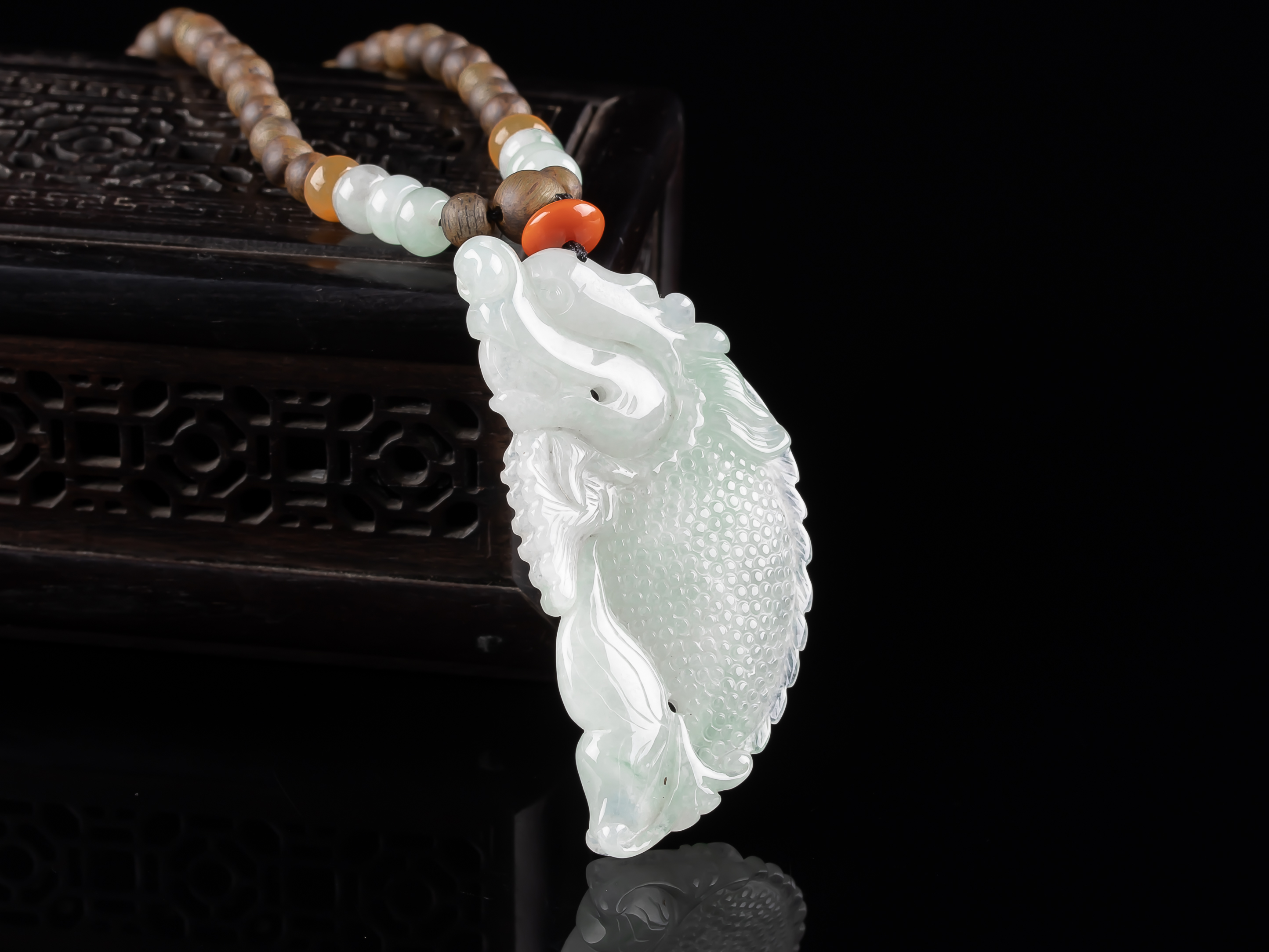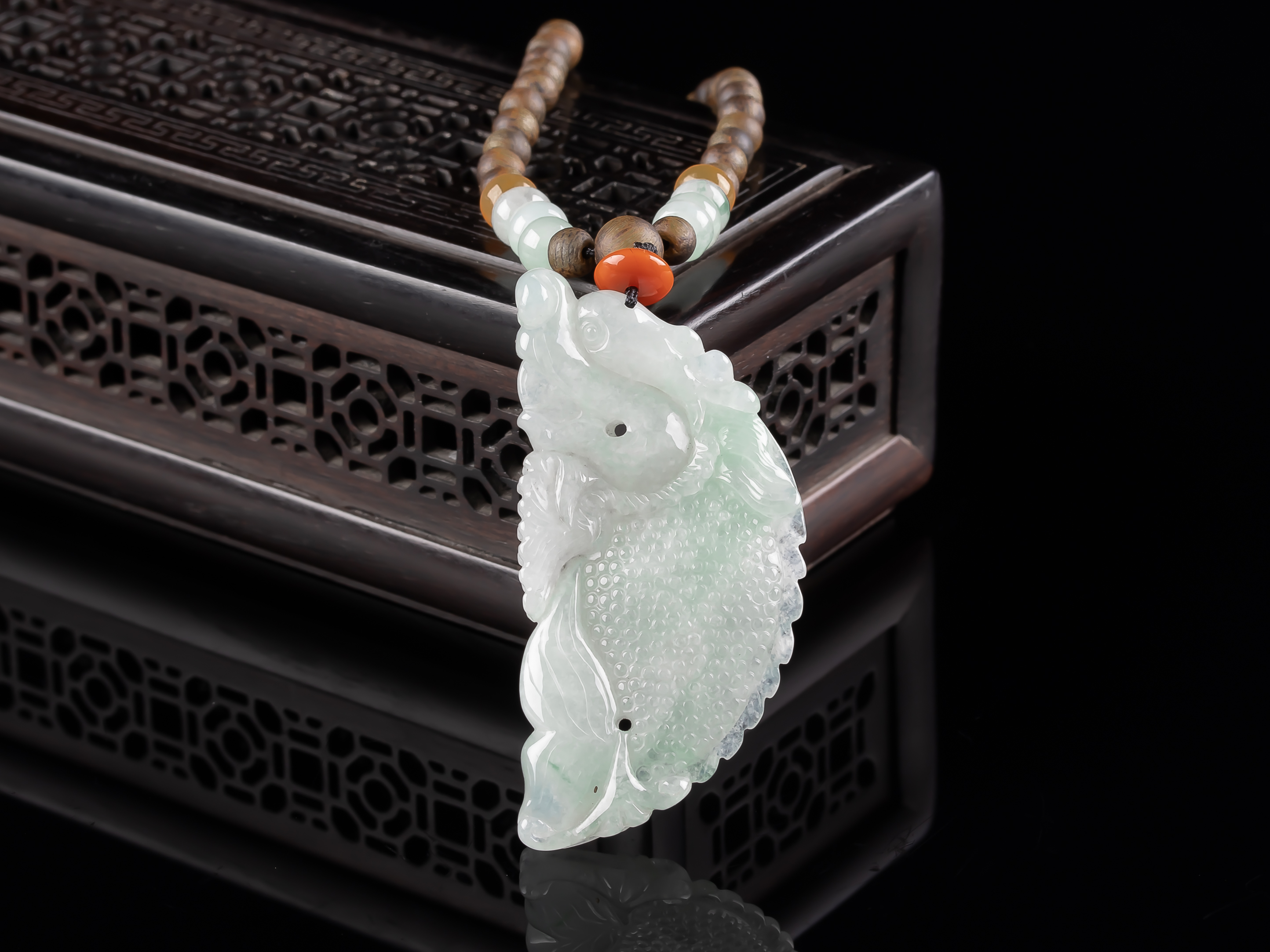 原创沉香+翡翠龙鱼挂件,天然沉香圆珠4.6mm,原色原味,香味自然清甜,配珠:翡翠。冰种带淡淡底色的翡翠龙鱼,54.8*27*5.6mm,质地细腻光泽,雕刻精细,完美无瑕。