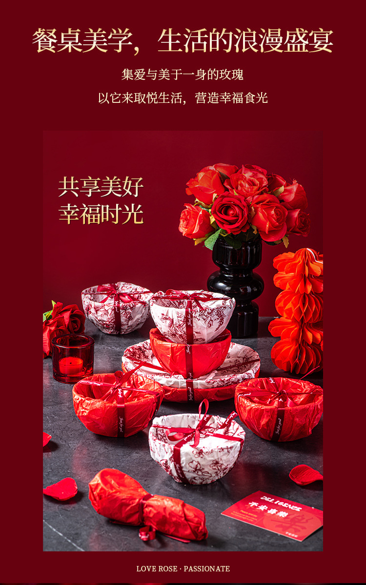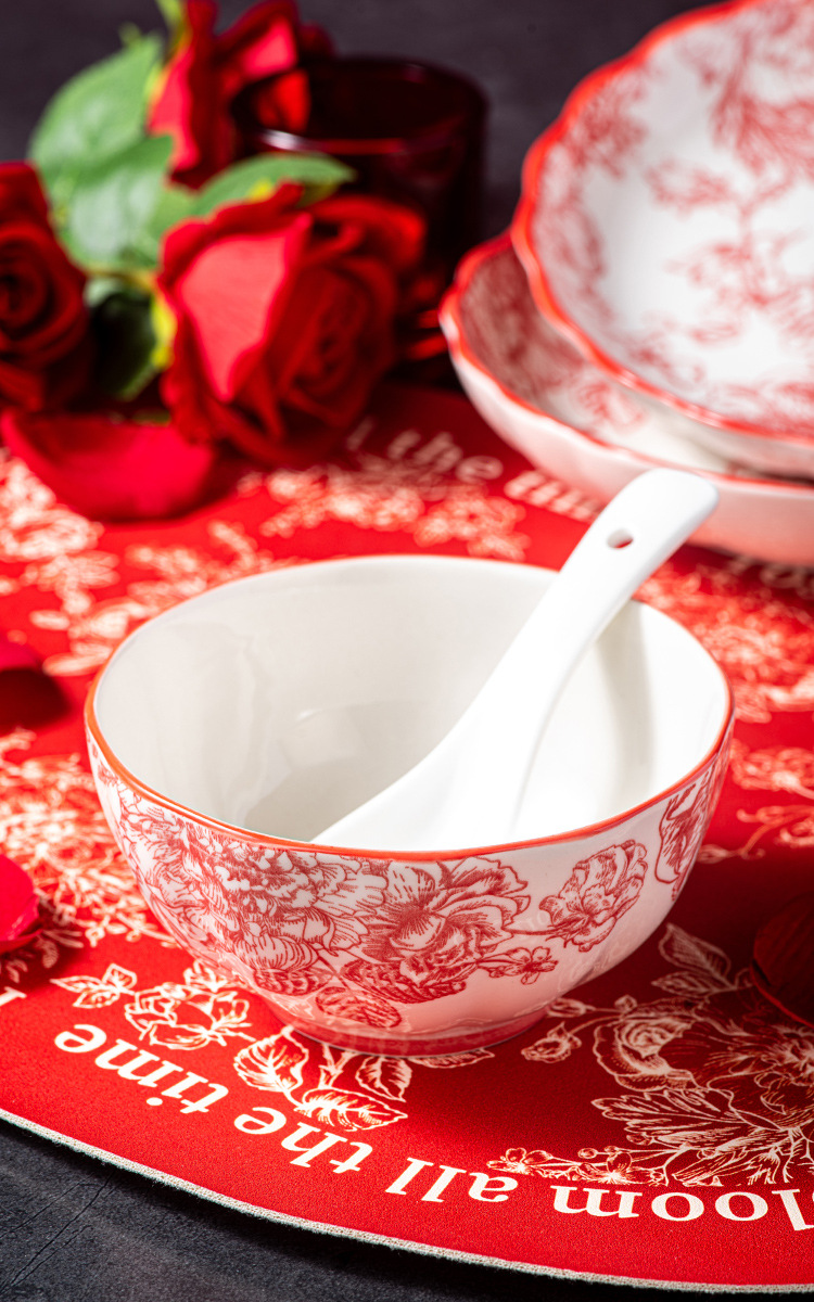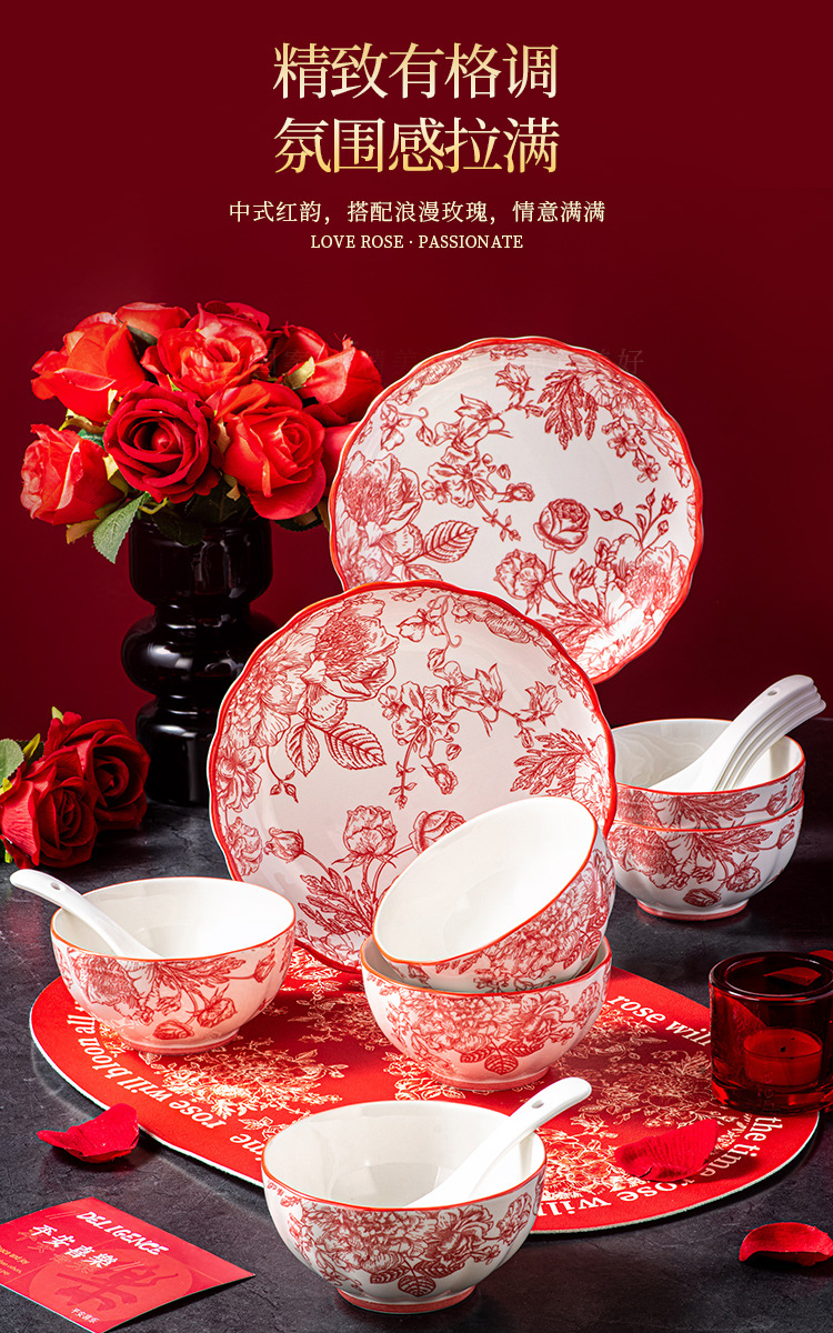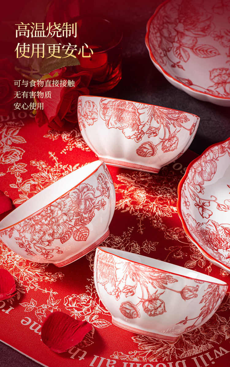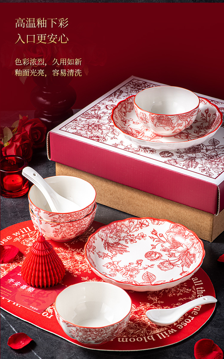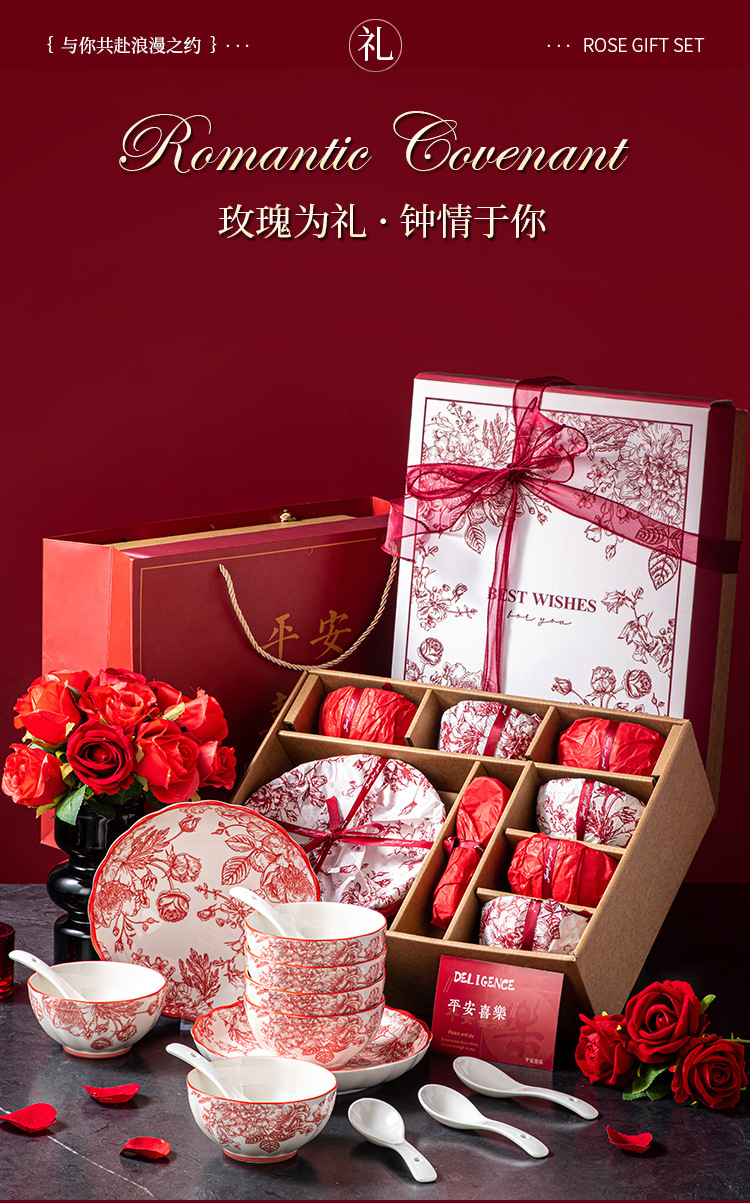 【平安喜乐❗️轻奢碗盘勺套装】中式红韵,搭配浪漫玫瑰,情意满满,新年结婚礼盒陶瓷餐具送礼乔迁礼品婚宴伴手礼