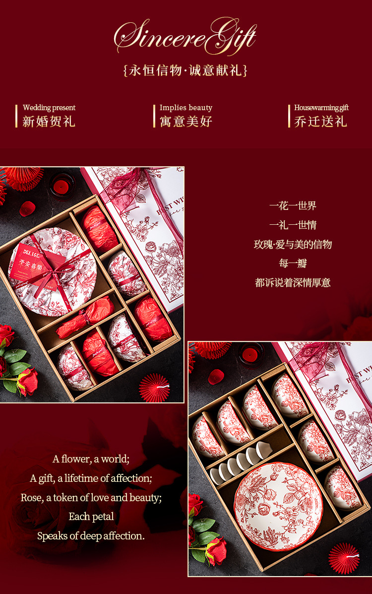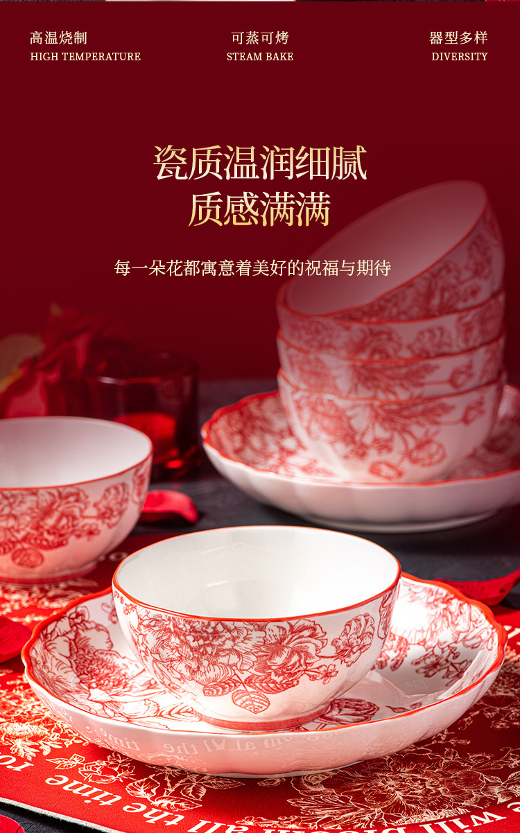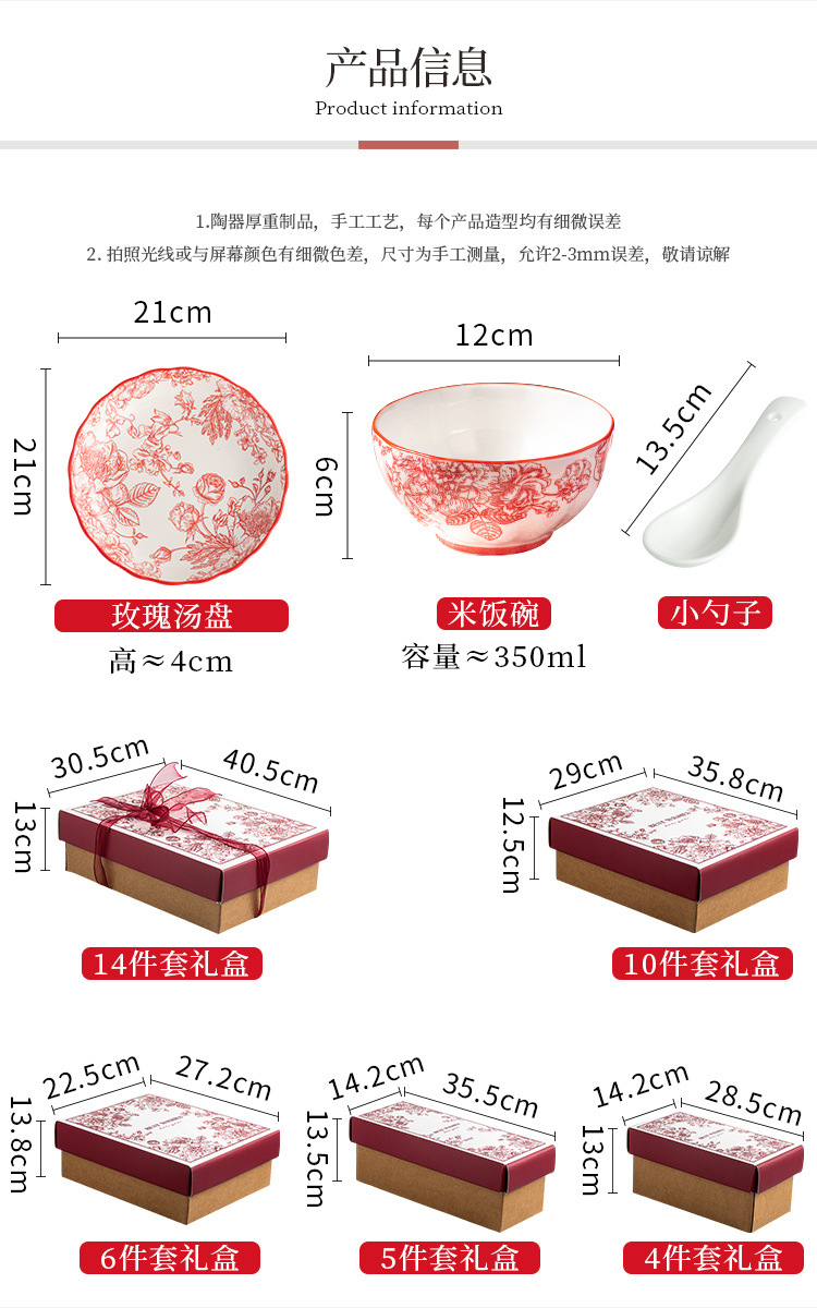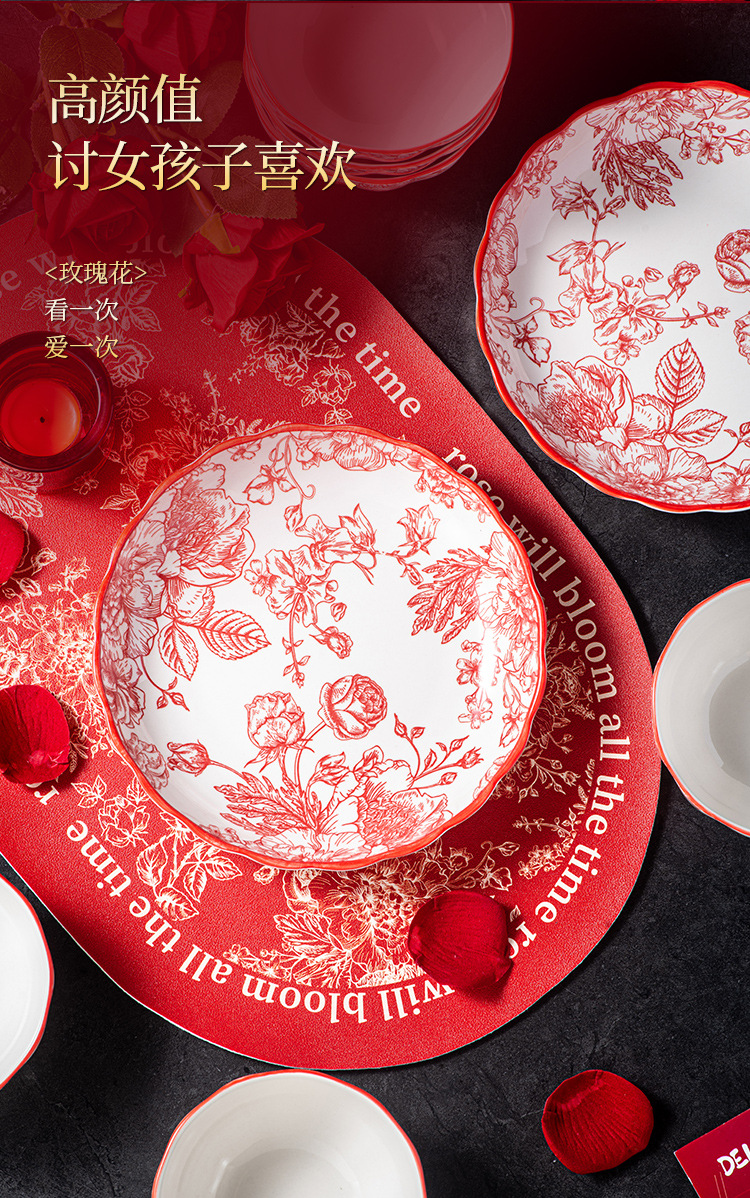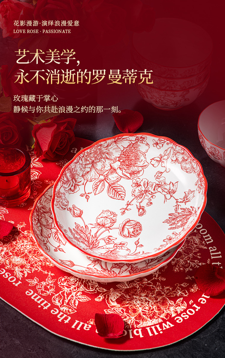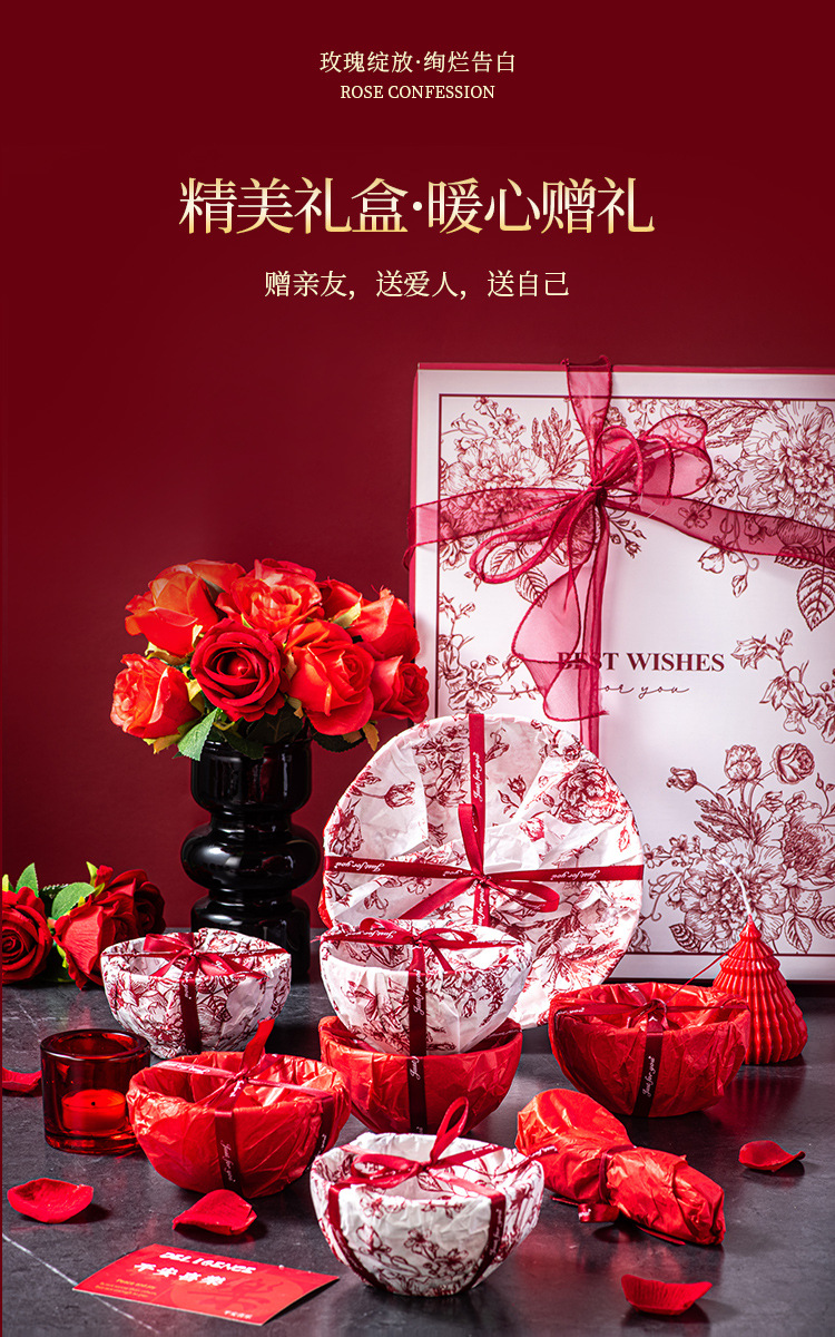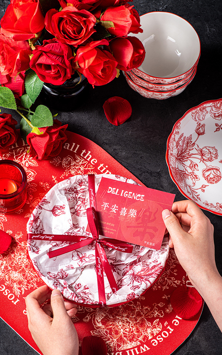【平安喜乐❗️轻奢碗盘勺套装】中式红韵,搭配浪漫玫瑰,情意满满,新年结婚礼盒陶瓷餐具送礼乔迁礼品婚宴伴手礼