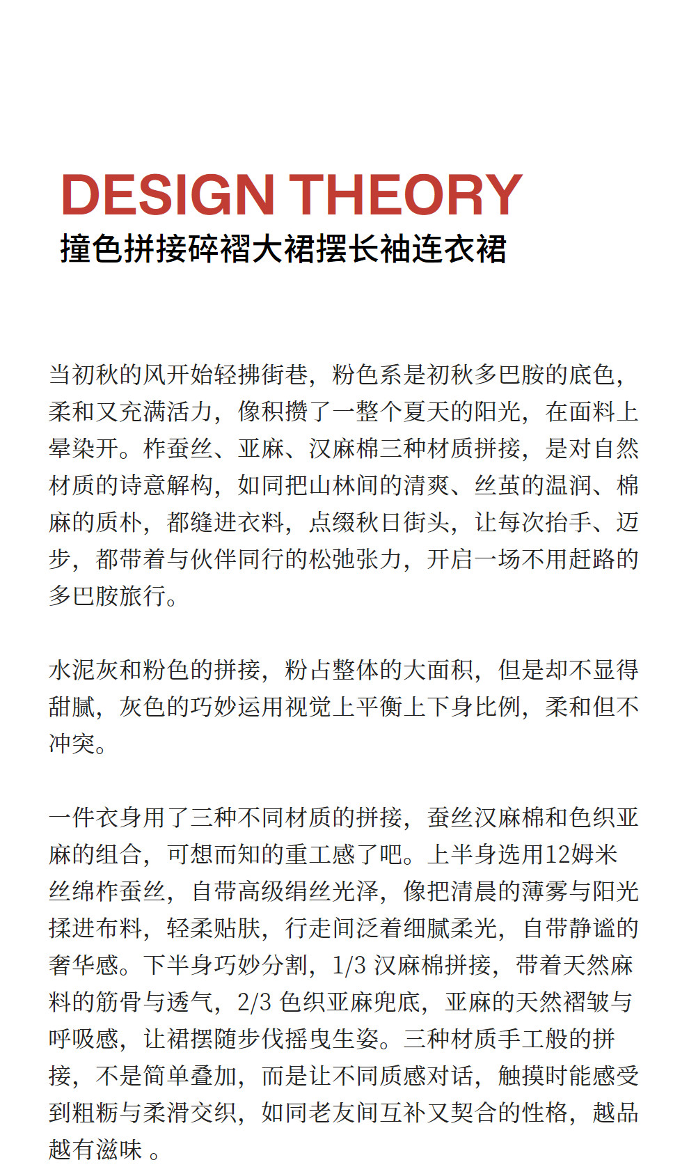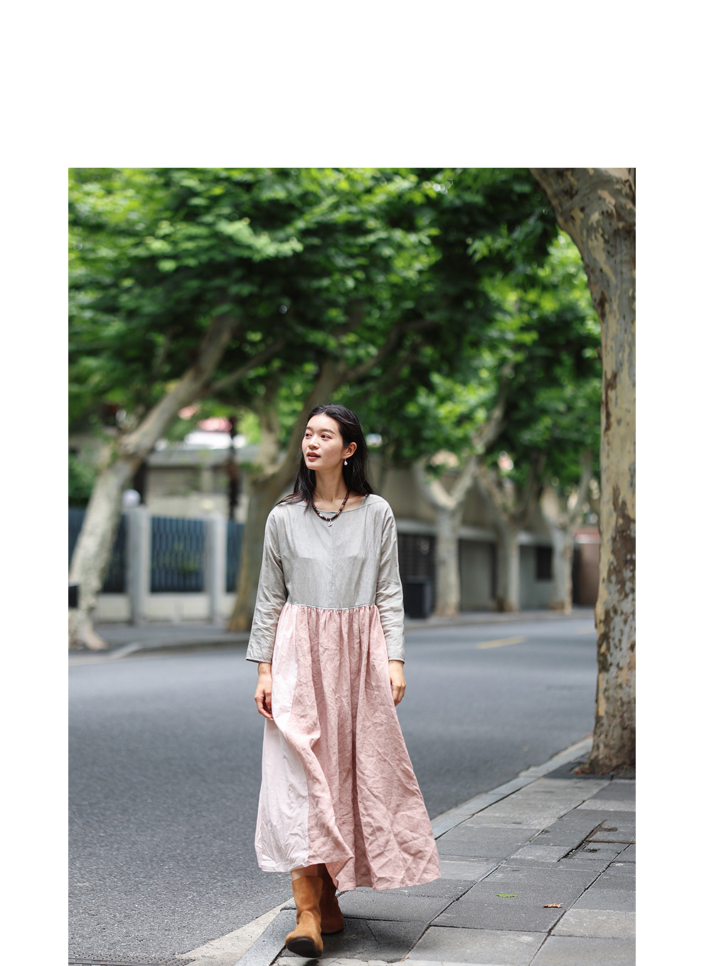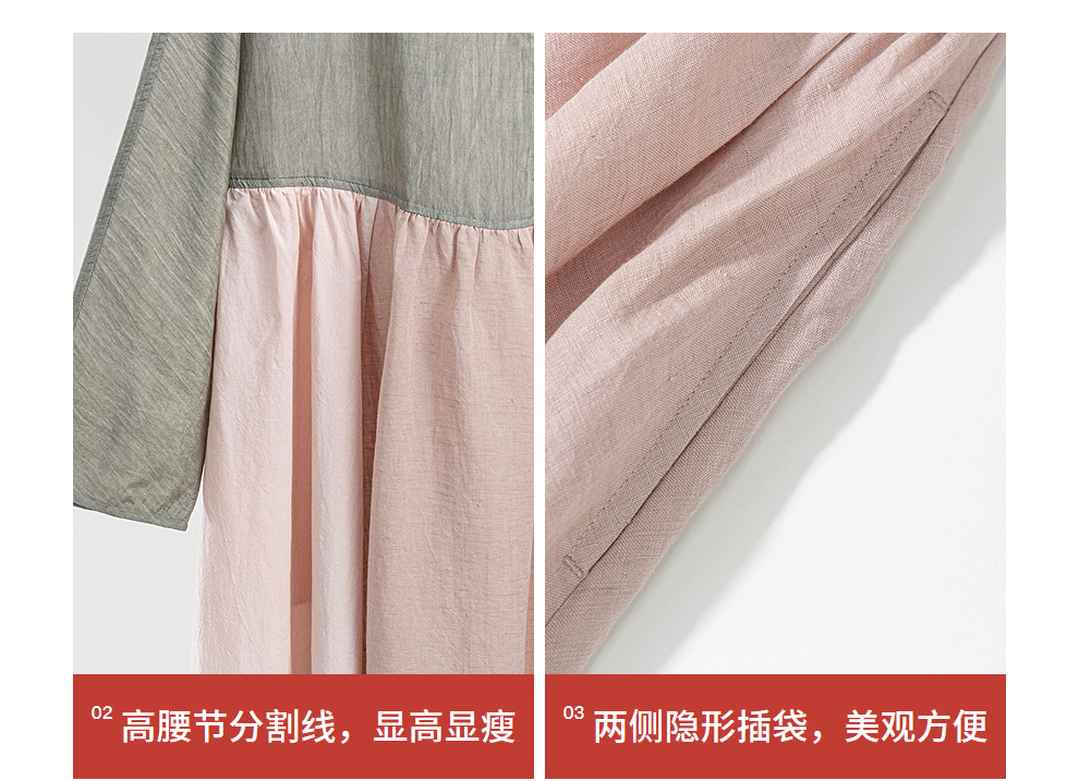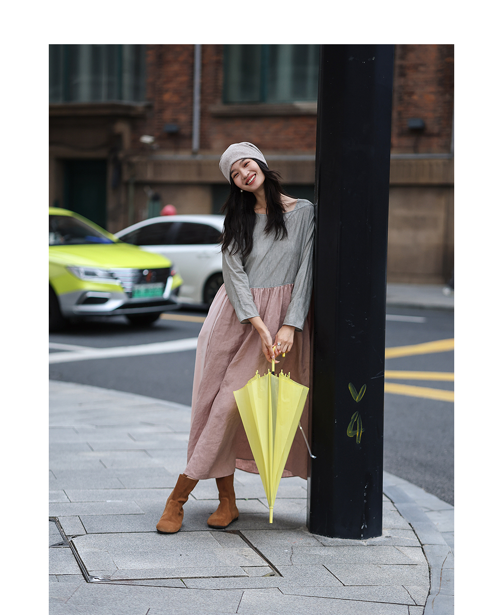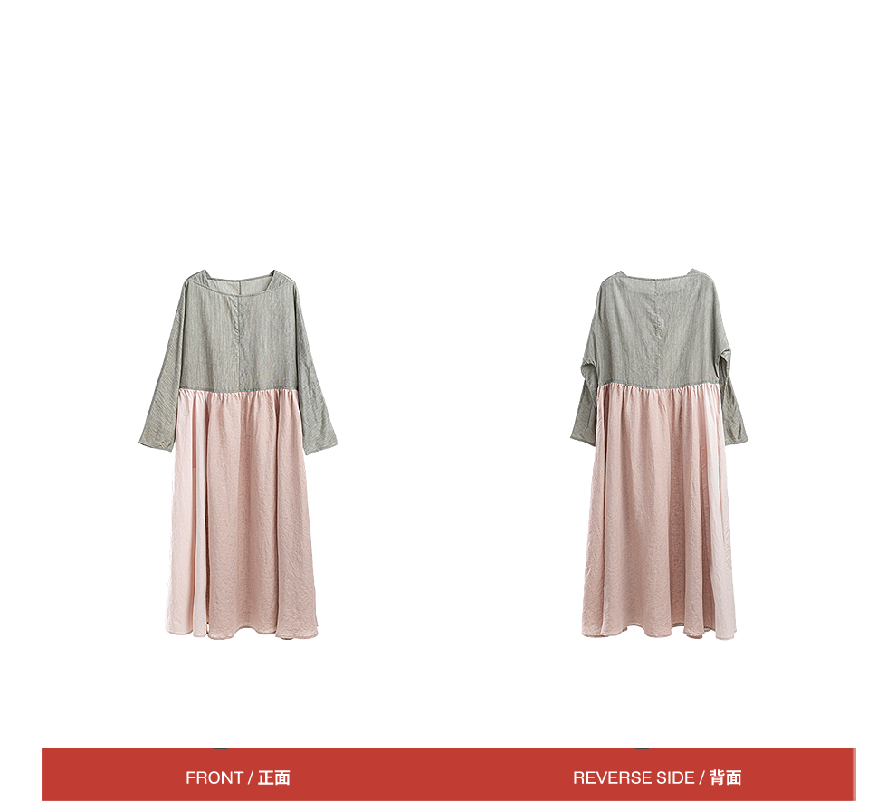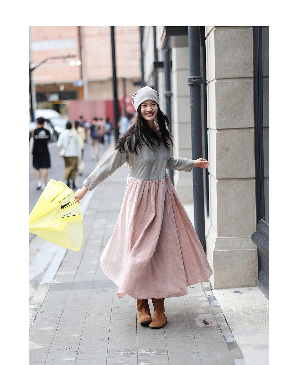 绽放旅行女装470朵/撞色拼接碎褶大裙摆文艺慵懒长袖气质连衣裙女