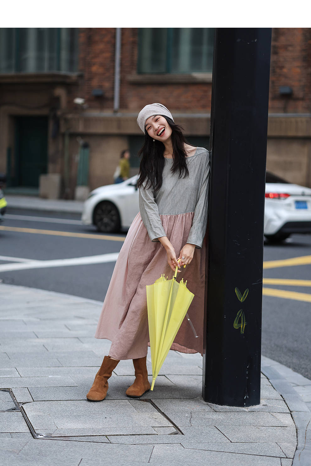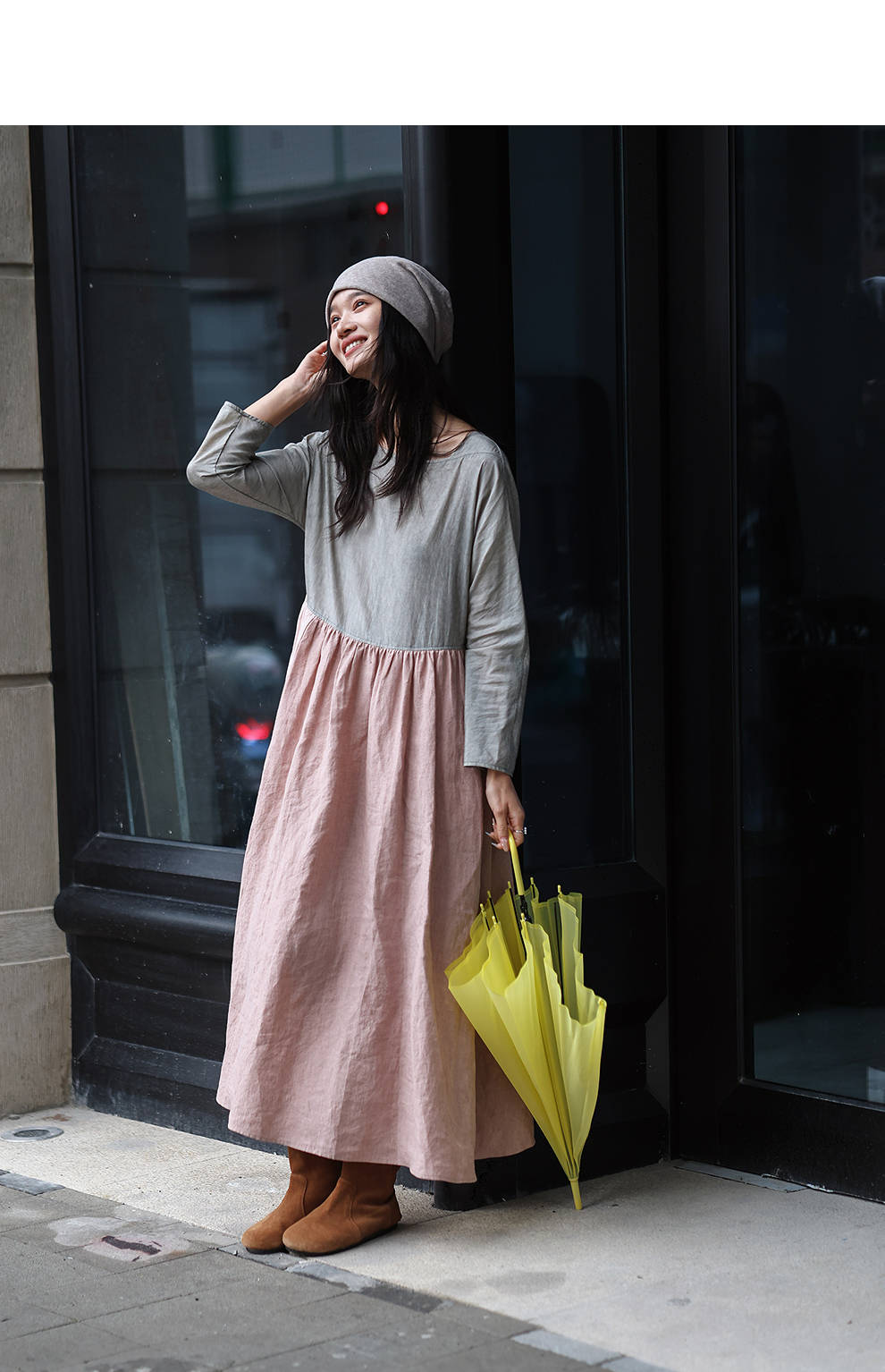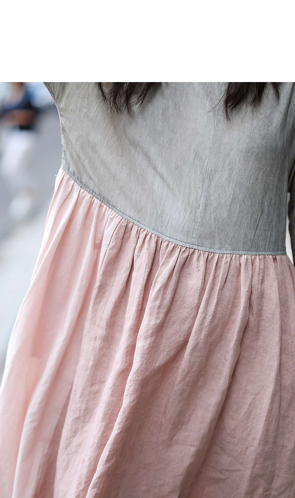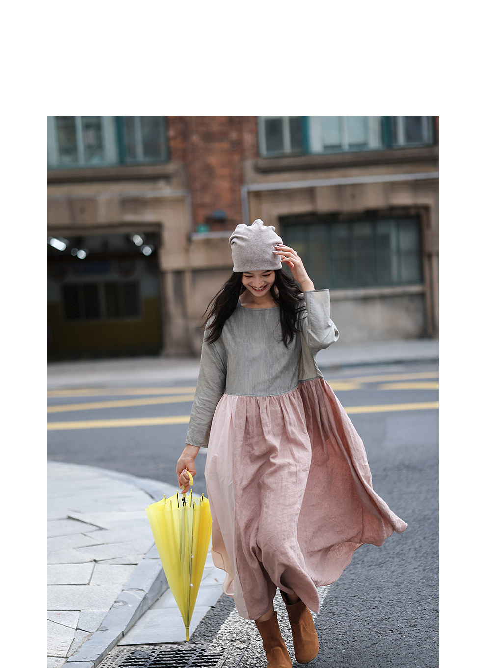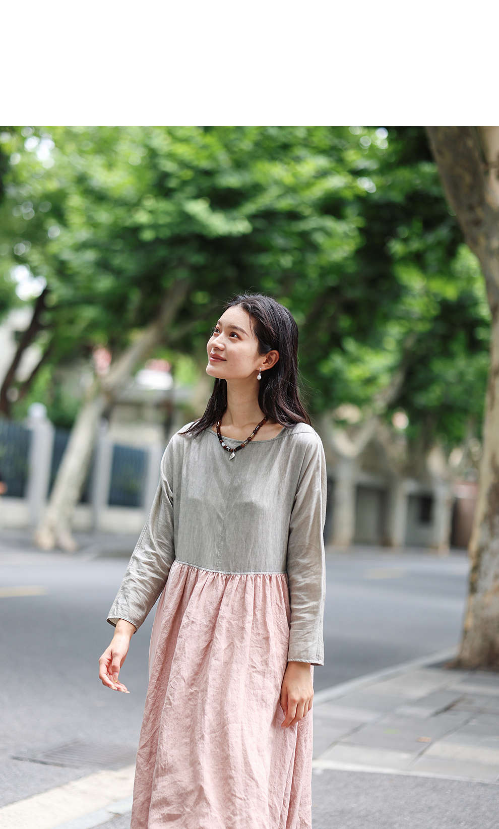 绽放旅行女装470朵/撞色拼接碎褶大裙摆文艺慵懒长袖气质连衣裙女
