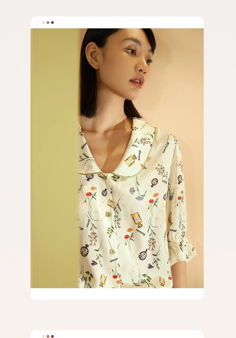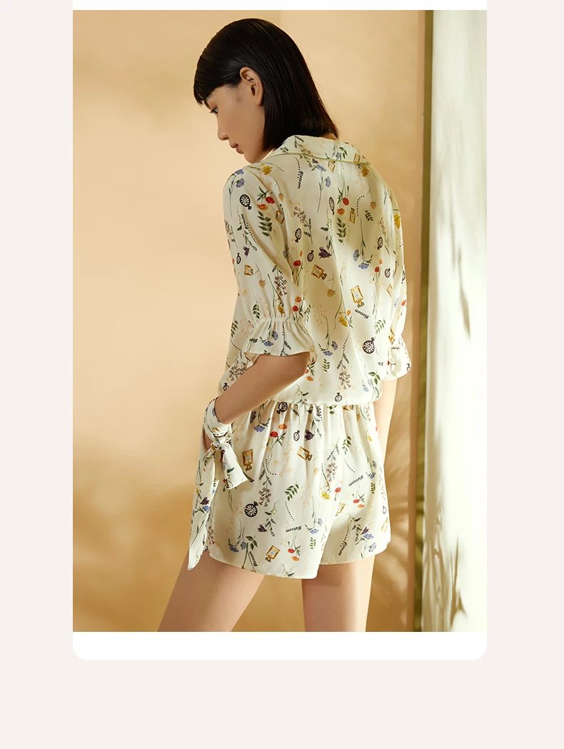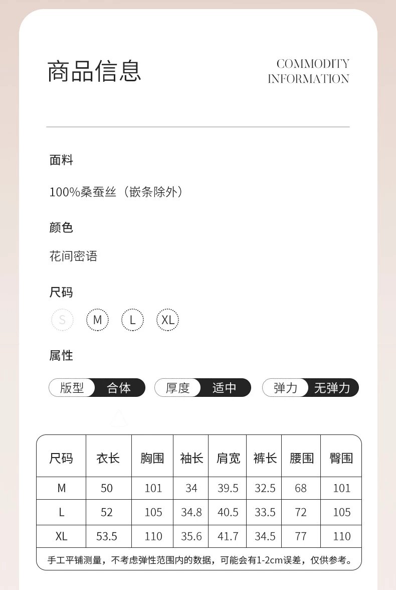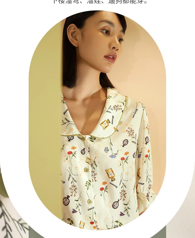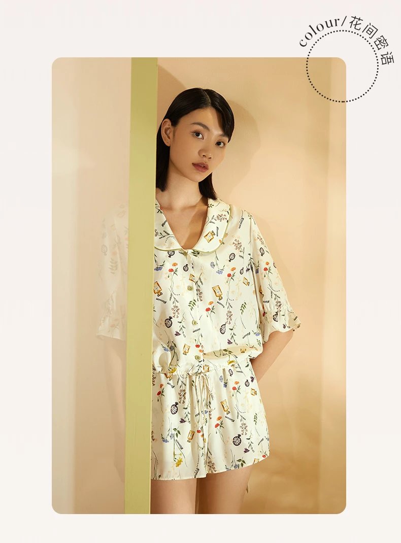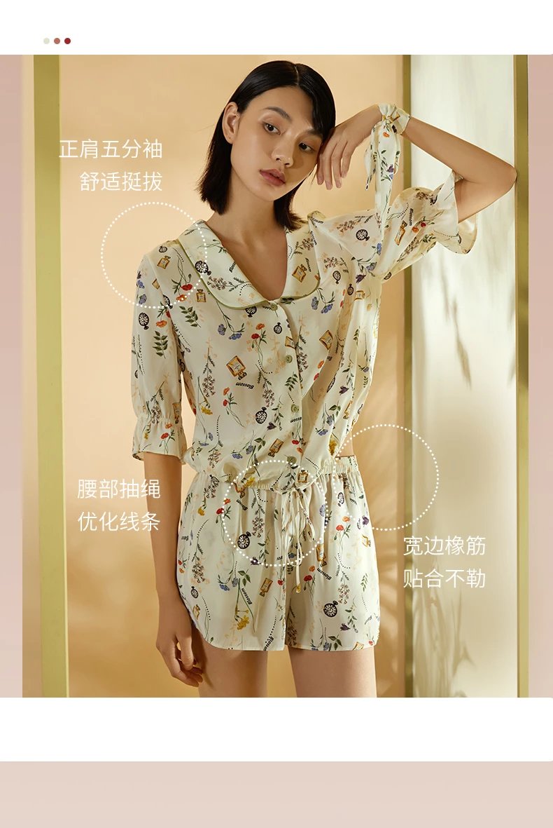 金三塔100%桑蚕丝真丝睡衣女士时尚印花宽松短袖衣裤套家居服 YSFCA408
