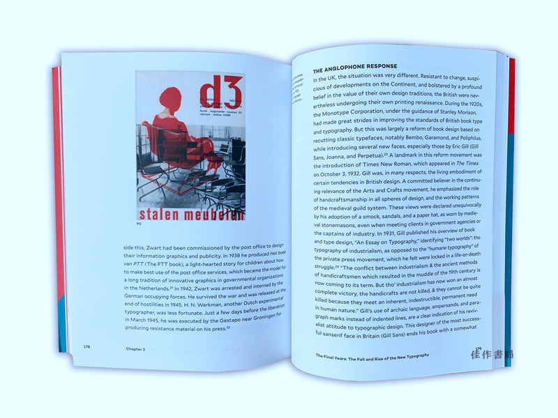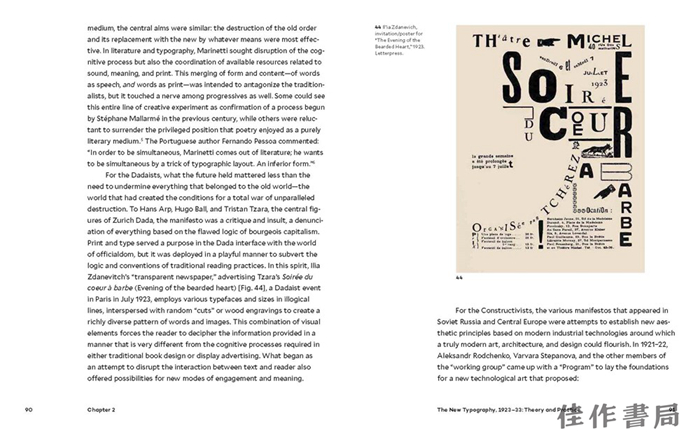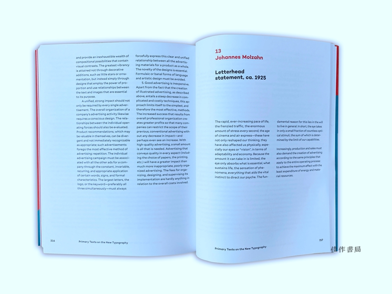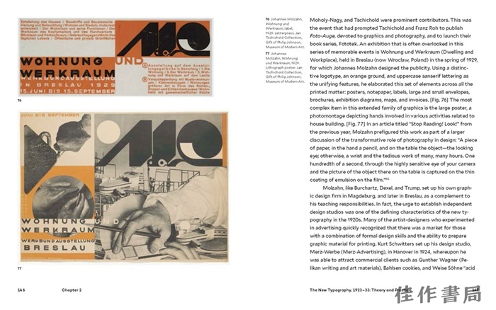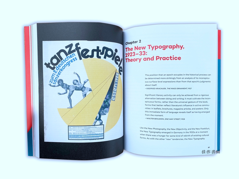 这本书还描绘了新排印术(New Typography)的发展,这是一场横跨中欧影响广泛的运动,其中包括施威特斯在1927年成立的“指环” (the Ring) 团体。奇肖尔德在定义这一运动中发挥了至关重要的作用,在他的著作《新字体版式》(1928)中记录了理论和实践,该著作至今仍被视为平面设计的开创性文本。