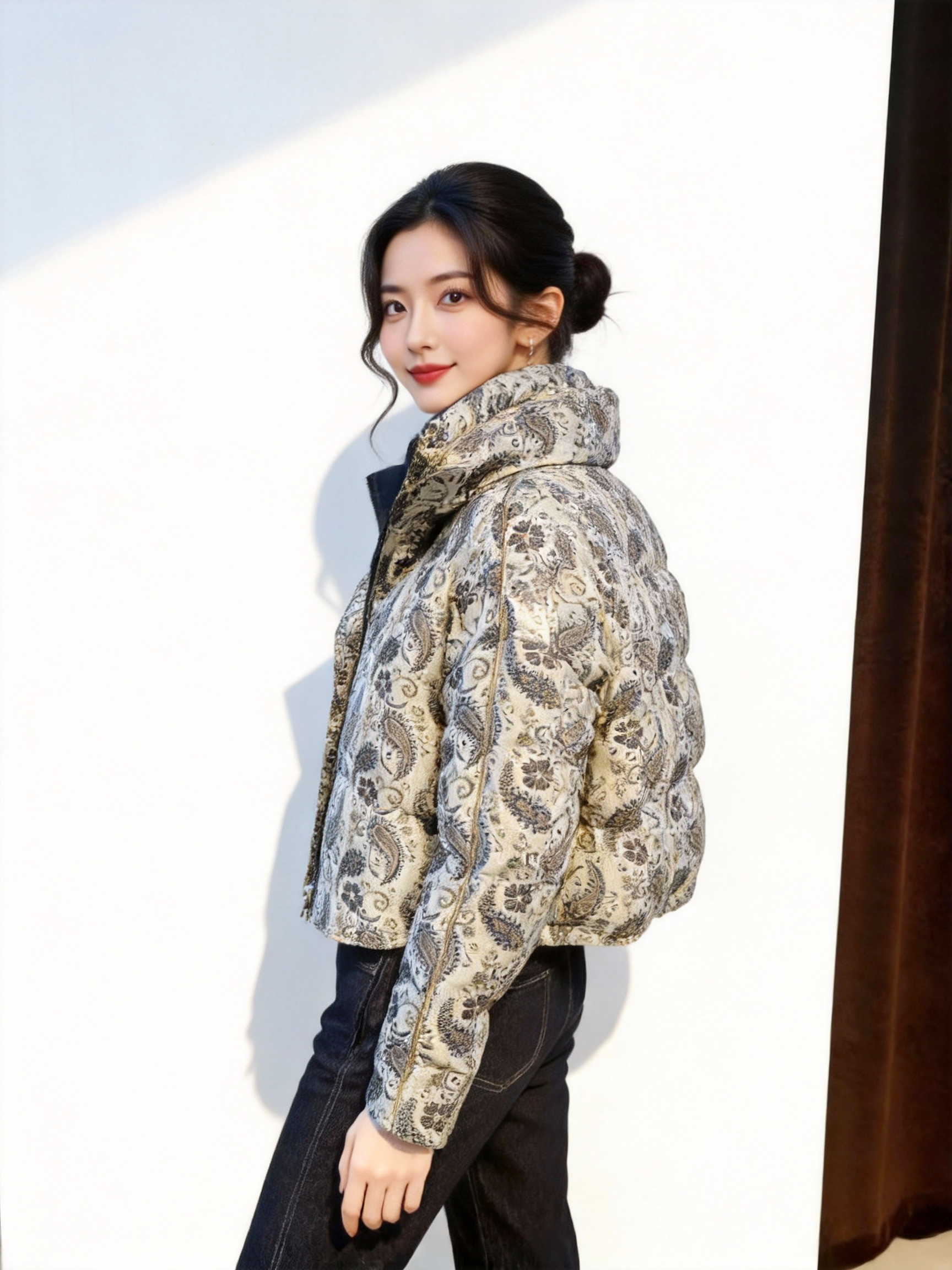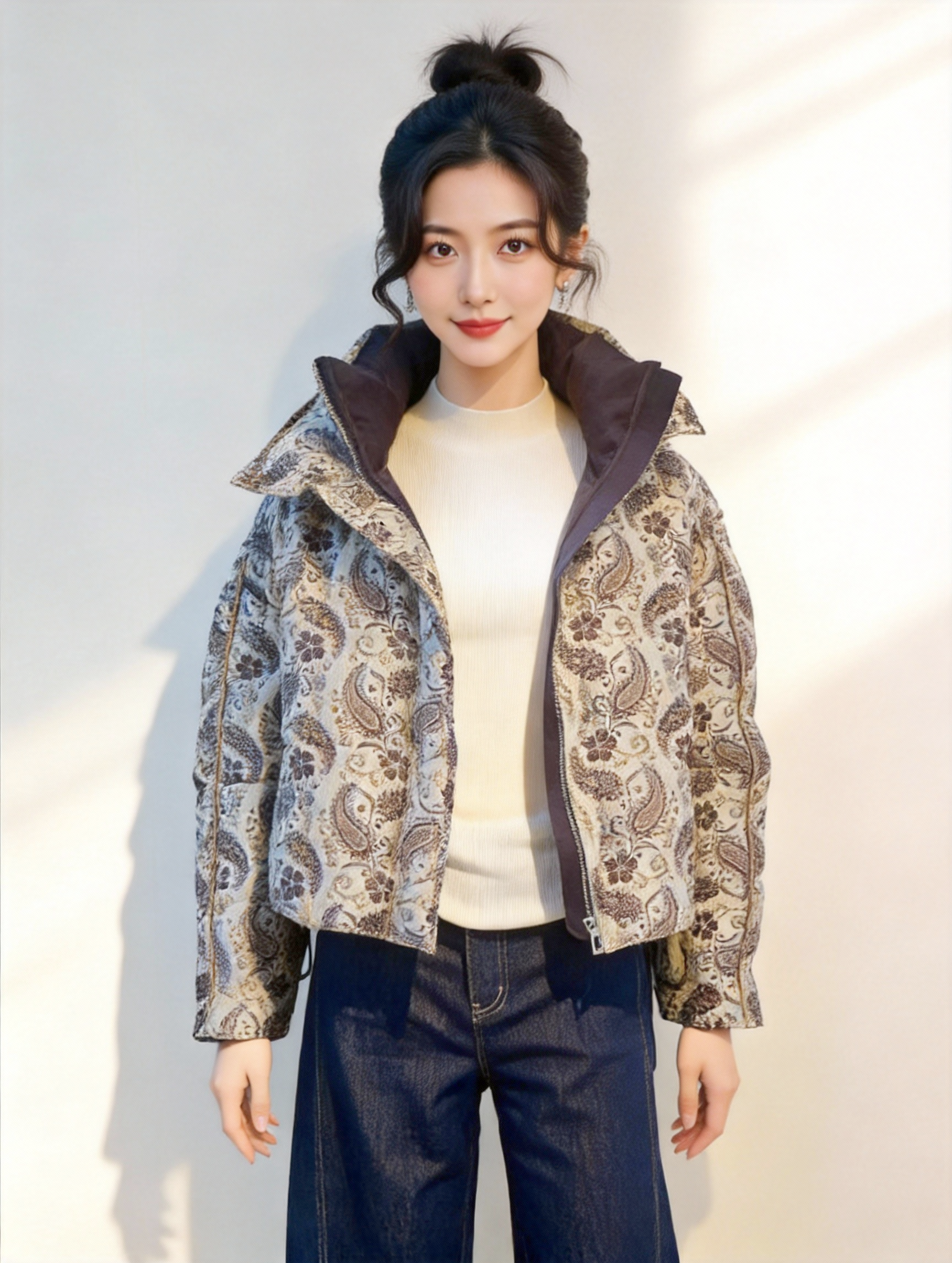 SZ6R27_银灰色_羽绒服_冬季_立领复古腰果花提花镶边短款_高级女装_BERNIEELEN 伯妮斯茵