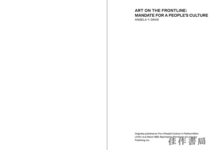Originally published in Political Affairs, a radical Marxist magazine, in 1985, the essay calls into question the role of art in the pursuit of social and racial liberation, and asserts the inequities exacerbated by the art world. Looking to the cultural and artistic forms born of Afro-American struggles, Davis insists that we attempt to understand, reclaim and glean insight from this history in preparing a political offensive against the racial oppression endemic to capitalism.