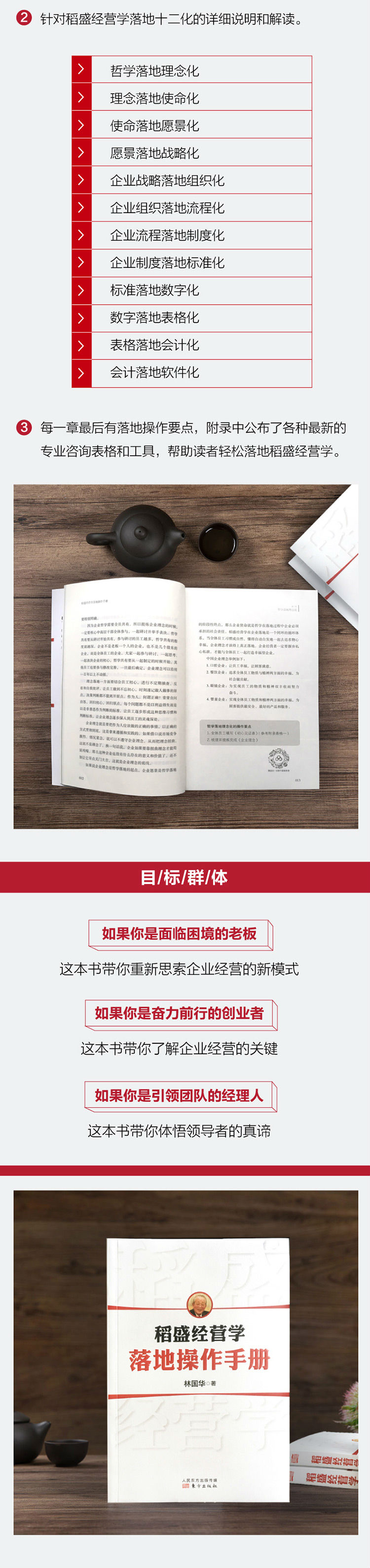 第一章到第十二章是稻盛经营学落地十二化的详细说明和解读,每一章最后有落地操作要点,还按照落地需要毫无保留地在书后附录并公布了各种专业咨询表格和工具。第十三章是稻盛经营学落地操作手册的说明书,普通的读者或者中小微企业老板和高管都可以看明白,就算他们按图索骥地导入稻盛经营体系,一步一个脚印,也能取得不同程度的成功。