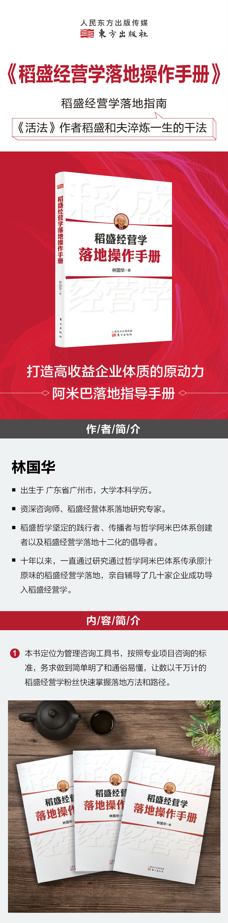林国华 广东广州人,大学本科学历,资深咨询师,稻盛经营体系落地研究专家,稻盛哲学坚定的践行者、传播者与哲学阿米巴体系创建者、稻盛经营学落地十二化的倡导者。十年以来,一直孜孜不倦地研究通过哲学阿米巴体系传承原汁原味的稻盛经营学落地,亲自辅导了几十家企业成功导入稻盛经营学。