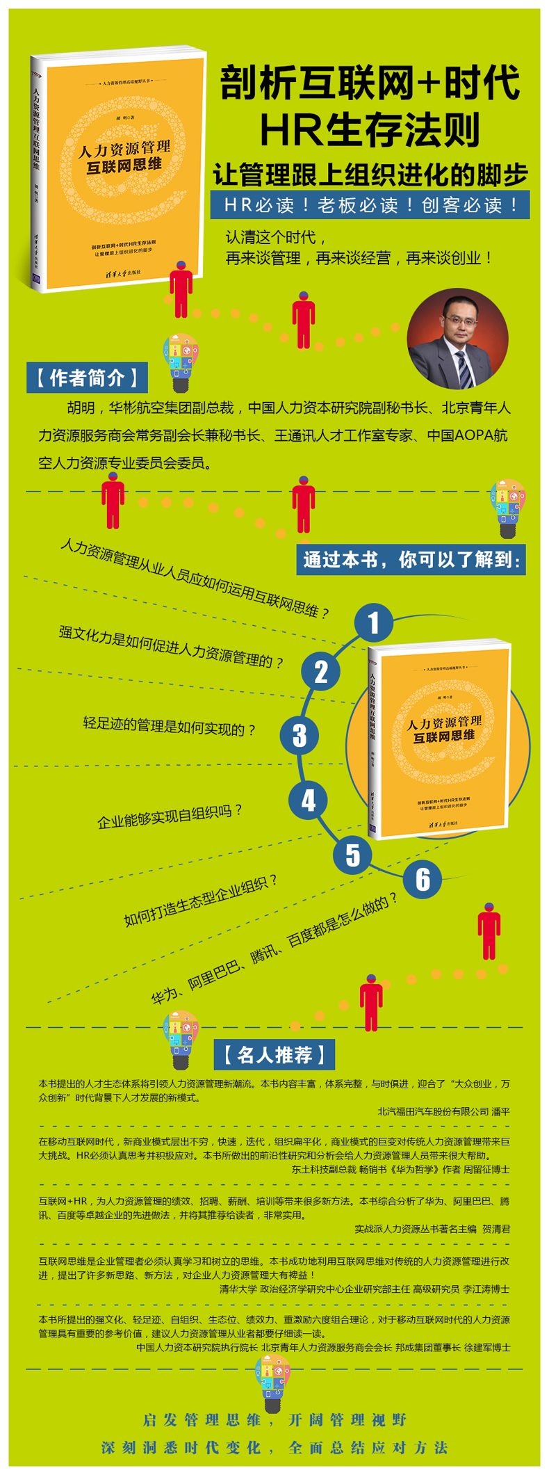 更好践行互联网思维的人力资源管理 林泽炎 为他人图书作序,常有好为人师之嫌。为避免此类嫌疑,每当有朋友给我布置相关任务时,我都会慎之又慎。要给人力资源管理类图书作序,对于多年没有从事相关具体研究的我来说,更是难上加难。还好胡明同志是我相识多年的人力资源管理实战派专家,又有中国人力资本研究院执行院长徐建军同志的多次举荐,我就应承下来了,只好在确实比较繁忙的间歇认真研读胡明同志的多年思考和实践之作——《人力资源管理互联网思维》,以求为作“不太恰当”的序言备点必要的思想材料。 焦虑不是我们应对互联网的态度。人类面对任何新鲜事物,都会焦虑,甚至会出现挫败感。唯有在漫长的实践中,认识掌握了新鲜事物的机理,并能驾驭它时,才会显得轻松愉悦。这是任何人都会经历的学习规律。也正是这一规律的存在,推动了人本身的发展进步,也让我们明白,学习、掌握新鲜事物的同时伴随诸如焦虑、挫败感也是正常的。当下面对大数据、云计算、互联网等新技术、新思维,在我们许多企业中亦出现了一些诸如焦虑、不适应,乃至恐惧的心态。有的企业因为无法学习、适应、掌握诸如互联网、大数据等新思维,出现了发展停滞,甚至转型失败。这不能不引起我们的关注。我一年要看很多企业、创客空间或经济技术开发园区,也会和很多创业者或企业家面谈。在和他们交流的过程中,我一直都想弄明白,面对来势迅猛的移动互联网大潮,像大数据、云计算、移动互联网等,这些新技术(姑且称之为新技术)并因此而出现的新业态、新商业模式到底会给企业管理,特别是人力资源管理会带来哪些影响?这些影响的逻辑及其路径是什么?企业到底应该如何应对?不停地看,不停地阅读和思考,几年下来,我的总体感觉并不像一些人所想像的那样玄乎,只是觉得:一是面对大数据新技术、互联网新思维,焦虑不该是我们的应取之态;二是新技术的应用只会让企业人力资源管理更科学、更有效;三是新技术有可能改变我们的思维,创造新的商业模式,这就要求我们不断调整,乃至改造、创新我们的人力资源管理方式和手段;四是那些成功将互联网思维实践于人力资源管理之中的企业或组织毫无焦虑之感,反而得心应手。 “认识人”依然是互联网时代“管理人”的基础。既然谈人力资源管理,就离不开管理的对象——“人”这个主体,所有新技术、新业态、新产业、新商业模式等,尽管可能会对“人”造成这样那样的影响,但都不过是“人”这个主体创造、完成的。从管理者的角度来看,似乎被管理者是客体,管理者才是主体。但是,在实践中真正有成效的人力资源管理,却是永远把被管理的人当做主体来对待。 “人”这个主体才是我们开展人力资源管理工作的主要矛盾、内因载体,而新技术、新业态、新产业、新商业模式等,都是我们开展人力资源管理工作的次要矛盾、外因载体,是我们开展人力资源管理工作的工具和手段。因此,要做好人力资源管理工作的关键还是要把“人”这个主体搞清楚、弄明白。我在很多场合都讲过,人力资源管理其实是一门既简单又复杂的学问。之所以说简单,是因为只要把人搞明白了,在纷繁复杂的组织体系中做好人的管理,也就顺理成章了。之所以说复杂,是因为要把人认识清楚,并把对人的认识和复杂的组织环境及新技术、新商业模式等嫁接起来,形成一套行之有效的管理制度、措施并严格执行,通常又难以作到,就更谈不上取得好的成效了。看来,要把人力资源管理工作做好,首要还是把人的本性、特点及各种行为规律认识透彻。或许是为了管理工作开展的便利,国外有著名管理学家沙因将人分为“经济人”“社会人”“复杂人”和“自我实现人”等,并据此对人的认识假设提出了相应的管理措施。我国自古至今,亦有圣人先哲就“性善”“性恶”争得不亦乐乎,现实中对世俗的人们来说,这些争论无足轻重,重要的是在治国理政、带兵打仗、组织管理实践中,特别是在我中华民族原生态文明“百家争鸣”时代,基于对人的认识并提出系统教化人或管理社会(组织)的理论,确实涌现出了诸如“儒家”“法家”“兵家”“墨家”等流派,并且在不同朝代这些理论都得到了相应的践行,有的甚至居于统治地位,成为社会的主流学说。实际上,明眼人根本不需要争论或明确地贴上某一理论的标签,都会知晓各种理论学说实践背后存在着相应的关于人的认识假定。因此,我一直在人力资源管理中坚持有个通俗的公理:“认识人=管理人”。认识人并据此采取相应措施管理人是为了什么?小到一个家庭,中到一个企业组织,大到一个国家,不管管理者对人如何认识,作出什么假定,并据此认识和假定对人的管理设计相应制度,采取相应措施,其出发点和落脚点,即人力资源管理的根本目的就是要千方百计地把人“激活”了。就其根本意义来说,“激活人”,就是要通过制度设计,使人感到前面有动力,后面有压力,同时施以相应的规矩约束,确保人的所思所想所求,即个人的价值追求是与组织的发展目标相一致的。只有在这样一个系统制度的激励和约束下,才能真正把人“激活”,让人开发潜能,发挥才干,创造价值,实现个人追求的同时达成组织的目标。 互联网等技术对人力资源管理的影响逻辑。一般的新技术应用是难以对企业管理,特别是