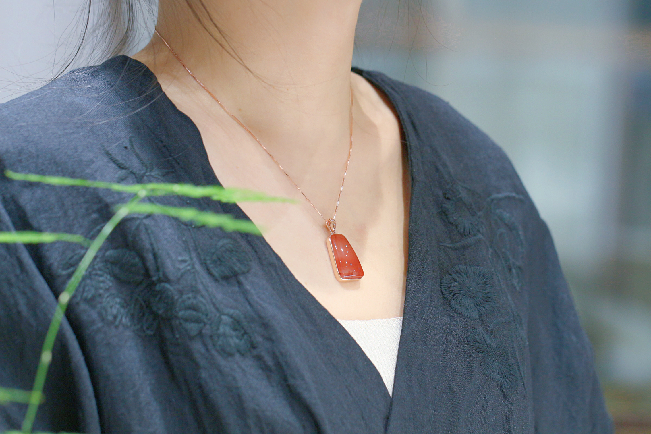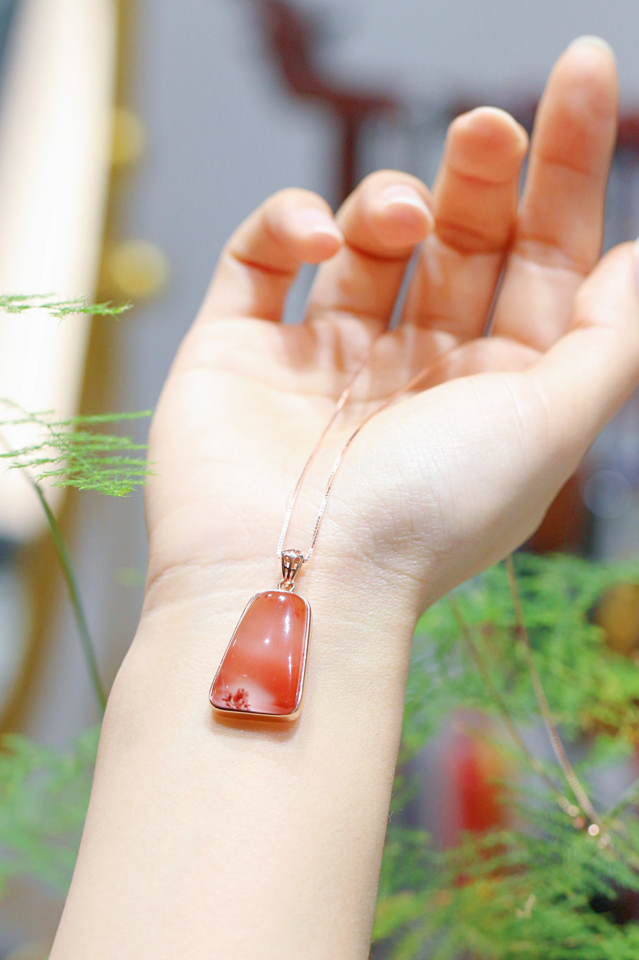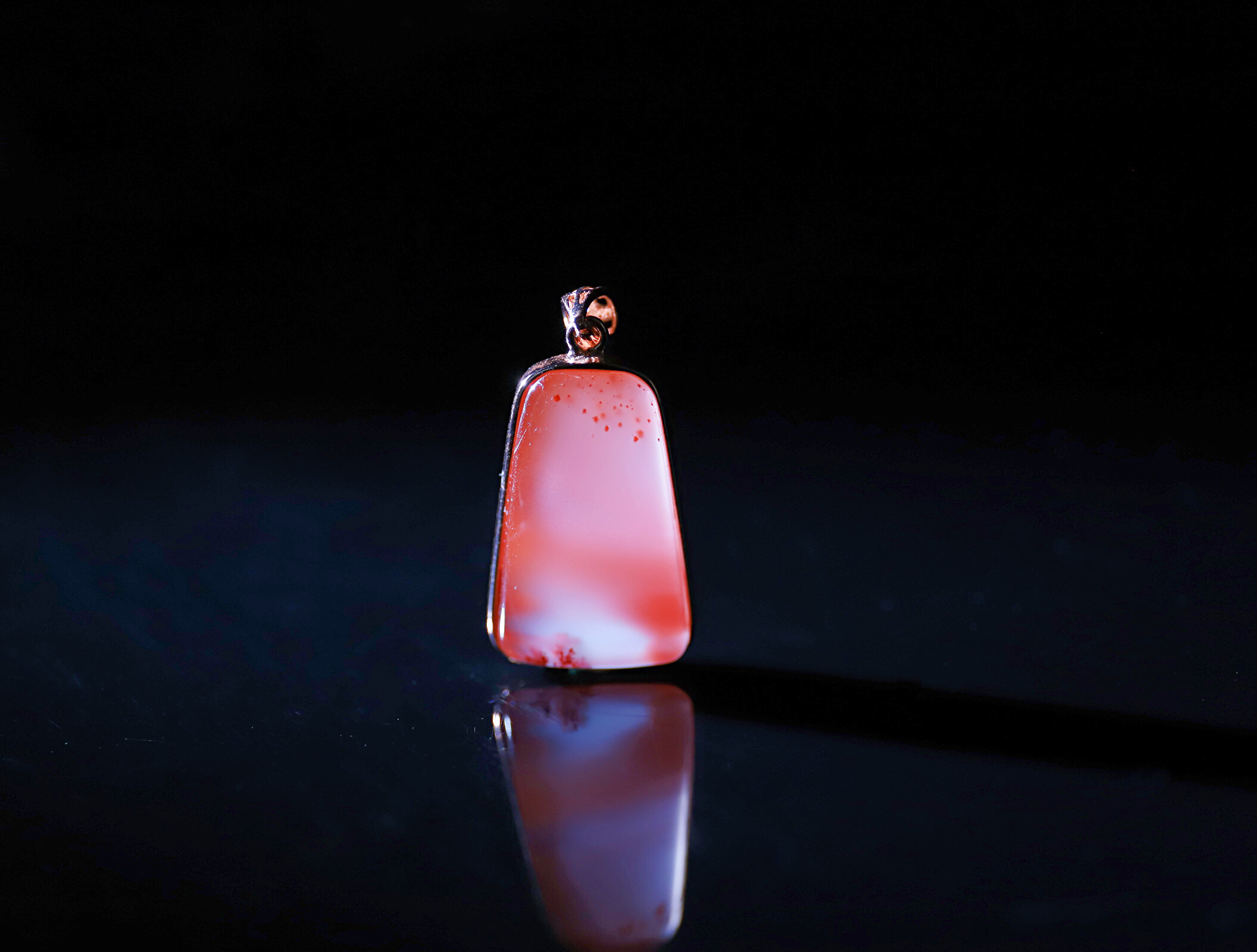 南红冰飘吊坠,冰透水润,晶莹透亮,飘红分布很有特色,梦幻朦胧,很有意境,色泽鲜艳红润,925银镶,精致优雅。