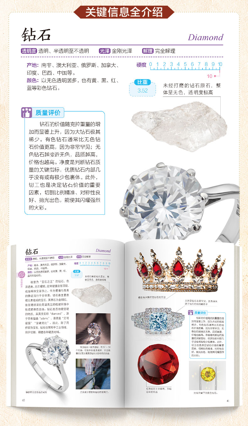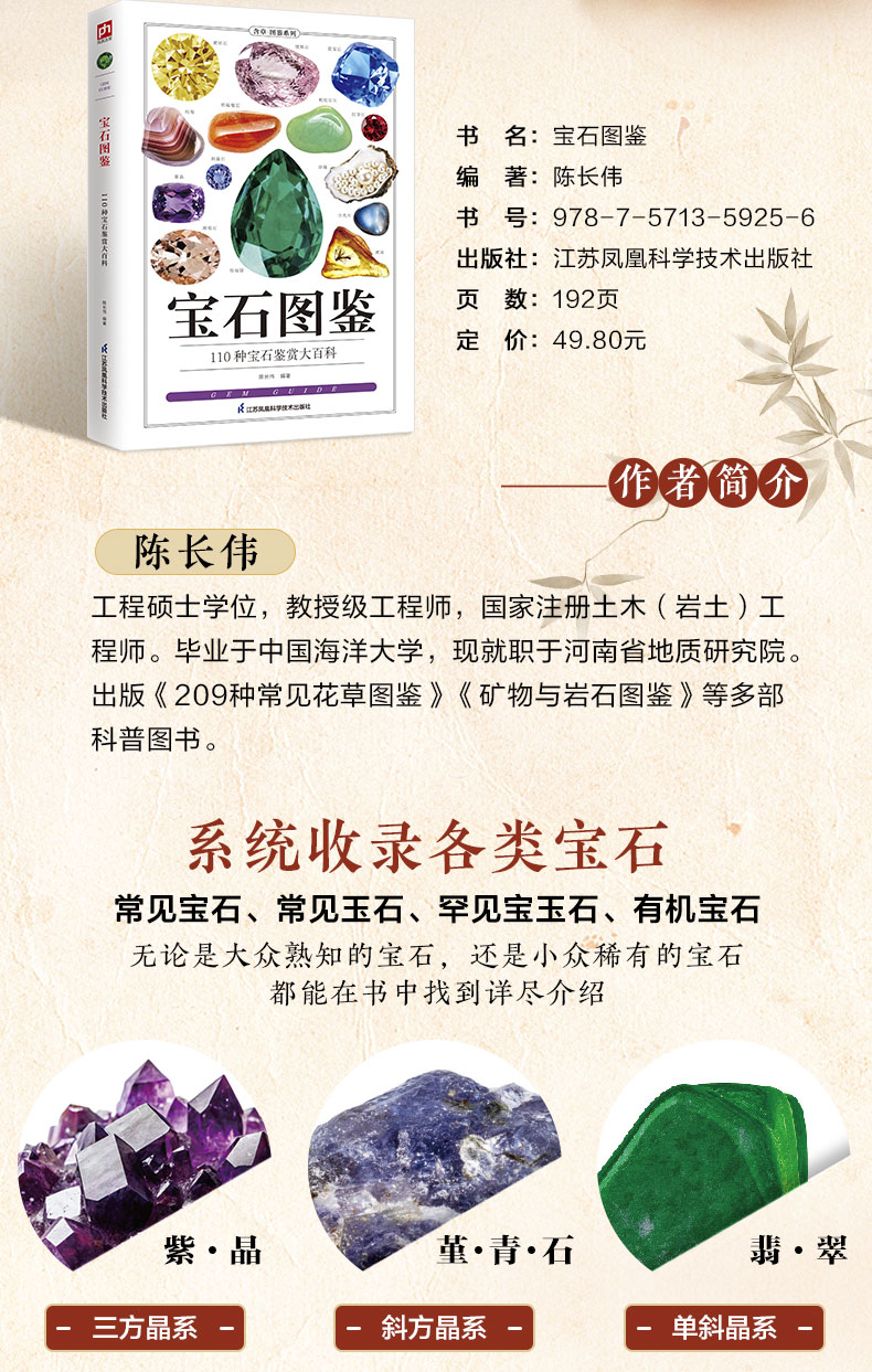 ●从宝石基础理论到品类细分全覆盖,既详解形成、结构、鉴定等专业知识,又分门别类梳理常见宝石、玉石、罕见宝玉石与有机宝石,为读者搭建系统化的宝石知识框架。●收录36种常见宝石、14种常见玉石、52种罕见宝玉石及8种有机宝石,无论是大众熟知的钻石、翡翠,还是小众稀有的蓝锥矿、苏纪石,都能在书中找到详尽介绍。●每种宝玉石均标注英文名、透明度、光泽、硬度等核心参数,辅以产地、特征、质量评价等实用内容,专业度拉满,堪称宝石爱好者与从业者的实用指南。●搭配多幅高清图片,涵盖宝石原始矿物形态、晶体结构、精密切割刻面与镶嵌首饰,直观展现宝玉石的自然之美与工艺之巧,兼具科学性与艺术性。