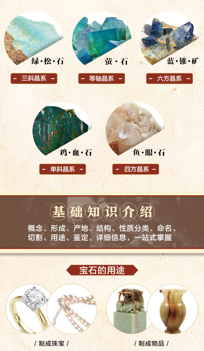 本书是一本全面介绍宝石知识的精美图鉴,旨在为读者提供丰富的宝石鉴赏与收藏指南。本书首先从宝石的基础知识入手,详细讲解了宝石的形成、分类、力学性质、光学性质、用途、鉴定仪器等,为读者打下坚实的理论基础。接着,本书介绍了一系列常见宝石,如钻石、红宝石、蓝宝石等;常见玉石,如翡翠、软玉、绿松石等;罕见宝玉石,如黑曜石、萤石、葡萄石等,以及有机宝石,如珍珠、珊瑚、琥珀等。每一种宝石都介绍了其英文名、透明度、光泽、解理、产地、颜色、硬度、比重、晶系等知识,并配有多幅高清图片,涵盖宝石的原始矿物形态、天然晶体结构、精密切割刻面,以及华丽镶嵌的珠宝首饰和精美加工的艺术品等。本书图文并茂,兼具科学性与艺术性,是宝石爱好者、收藏家及从业者的绝佳参考书。