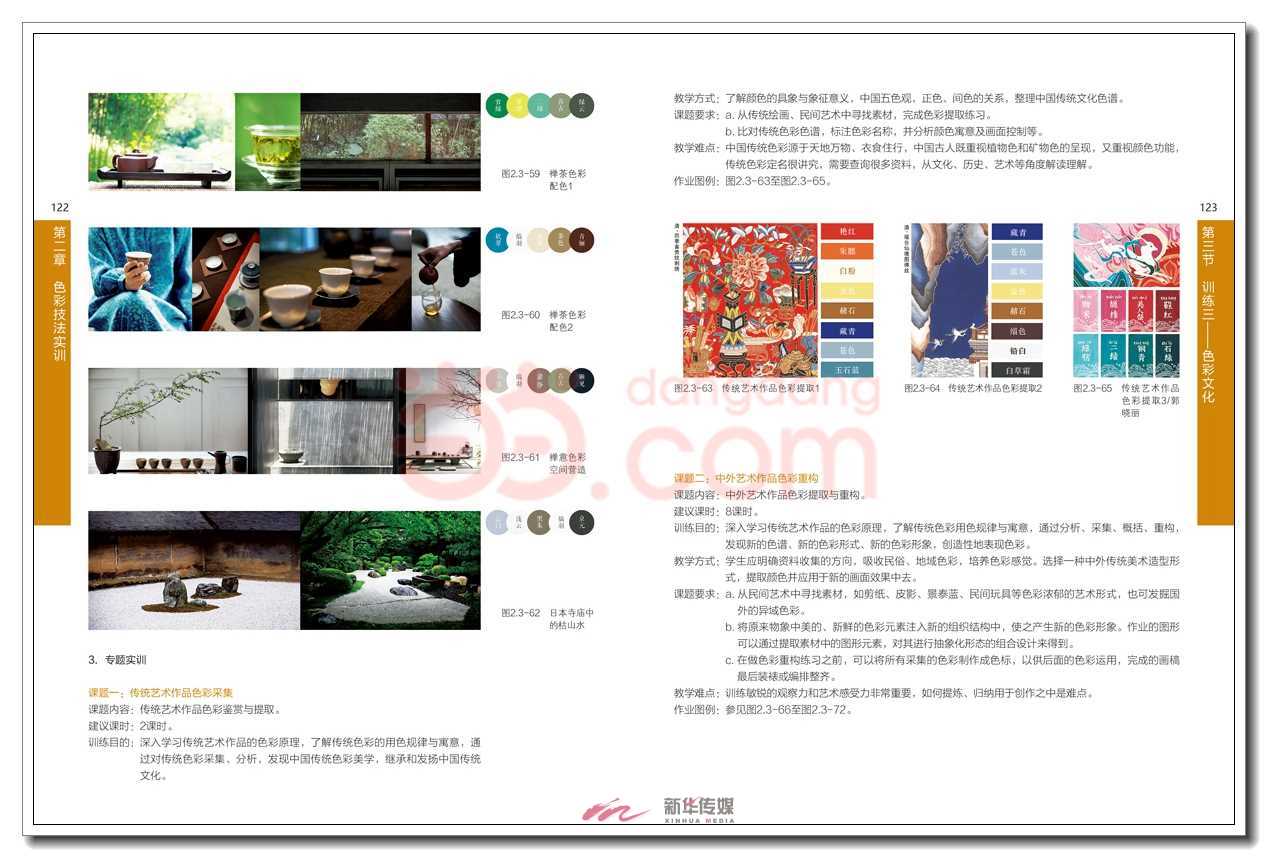 第二章 色彩技法实训第一节 训练一名画鉴赏与色彩表现1.知识链接(1)分散的光色印象派(2)释放的纯色野兽派 (3)高级的灰色莫兰迪(4)呐喊的天色表现主义(5)纯粹的块色抽象主义(6)神秘的金色克里姆特(7)明朗的原色波普艺术2.知识拓展(1)色彩形式语言的转化(2)装饰色彩与形式(3)装饰色彩与构色 (4)装饰色彩与材质 3.专题实训课题一:色彩的观察、分析与再现课题二:色彩印象切片训练课题三:大师作品临摹与解构性再创 课题四:肌理和材质的色彩综合表现课题五:色彩写生的装饰化表现 第二节 训练二色彩搭配技巧1.知识链接(1)色彩对比配色规律(2)色彩调和配色规律(3)色彩意象配色特征2.知识拓展(1)色彩体系奥斯特瓦尔德、NCS、孟塞尔、PCCS(2)色彩量化色彩形象坐标分析法(3)色彩健康与功效3.专题实训与作品展示课题一:色彩构成基础练习课题二:色彩采集寻找生活中的色彩课题三:;速感情绪色彩练习课题四:色调控制能力训练课题五:主题色彩配色训练第三节 训练三色彩文化1.知识链接(1)中国传统色彩审美(2)外国传统色彩审美2.知识拓展8(1)民间色彩(2)壁?色彩 (3)禅意色彩 3.专题实训课题一:传统艺术作品色彩采集课题二:中外艺术作品色彩重构课题三:意象主题色彩创意课题四:立体空间的色彩创意课题五:传统色彩应用配色分析