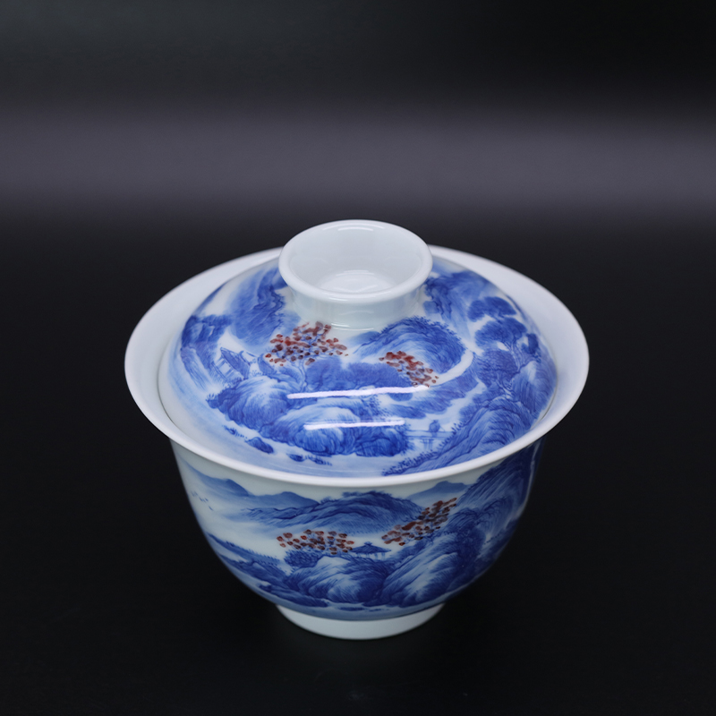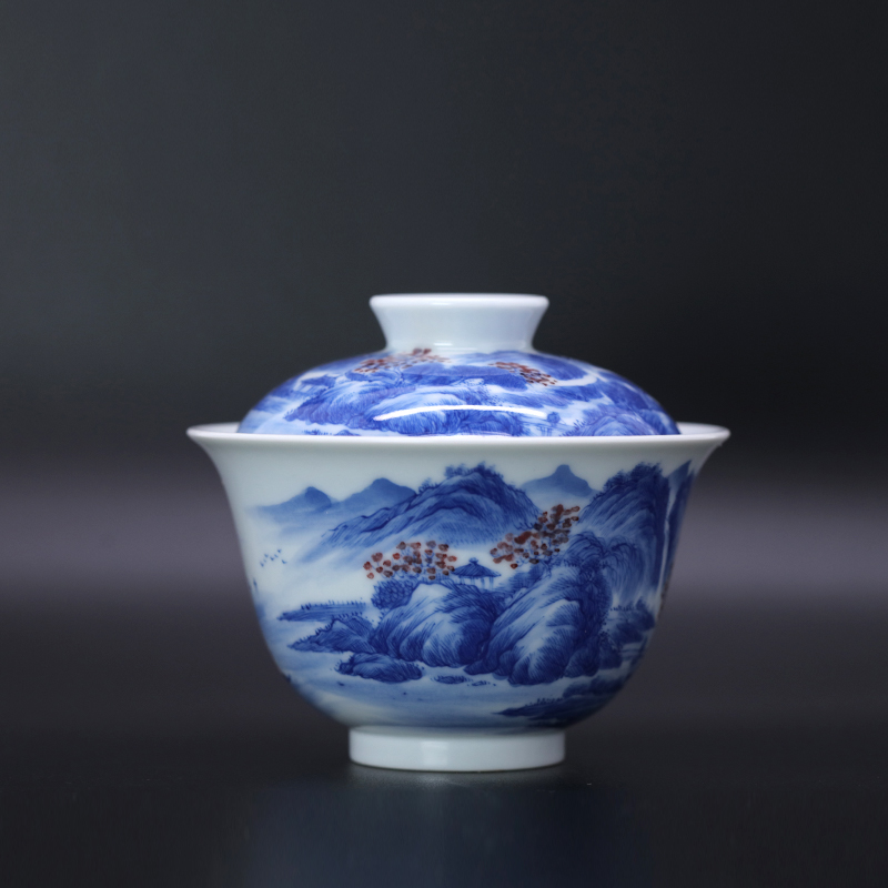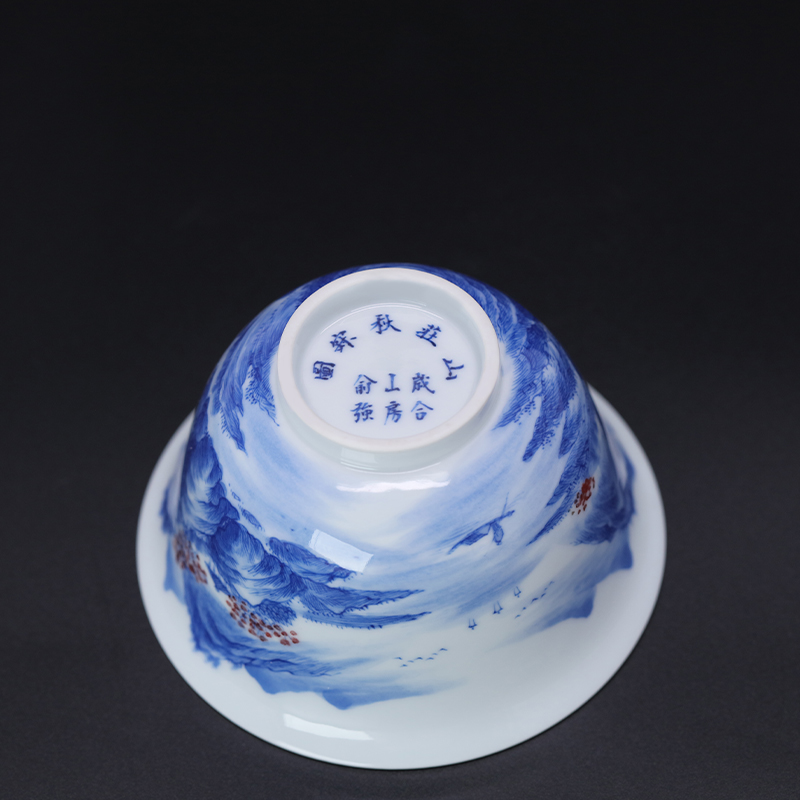 歳合山房俞强款青花山庄秋林图二才盖碗