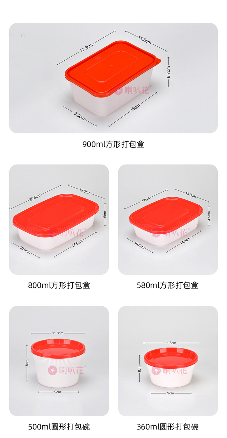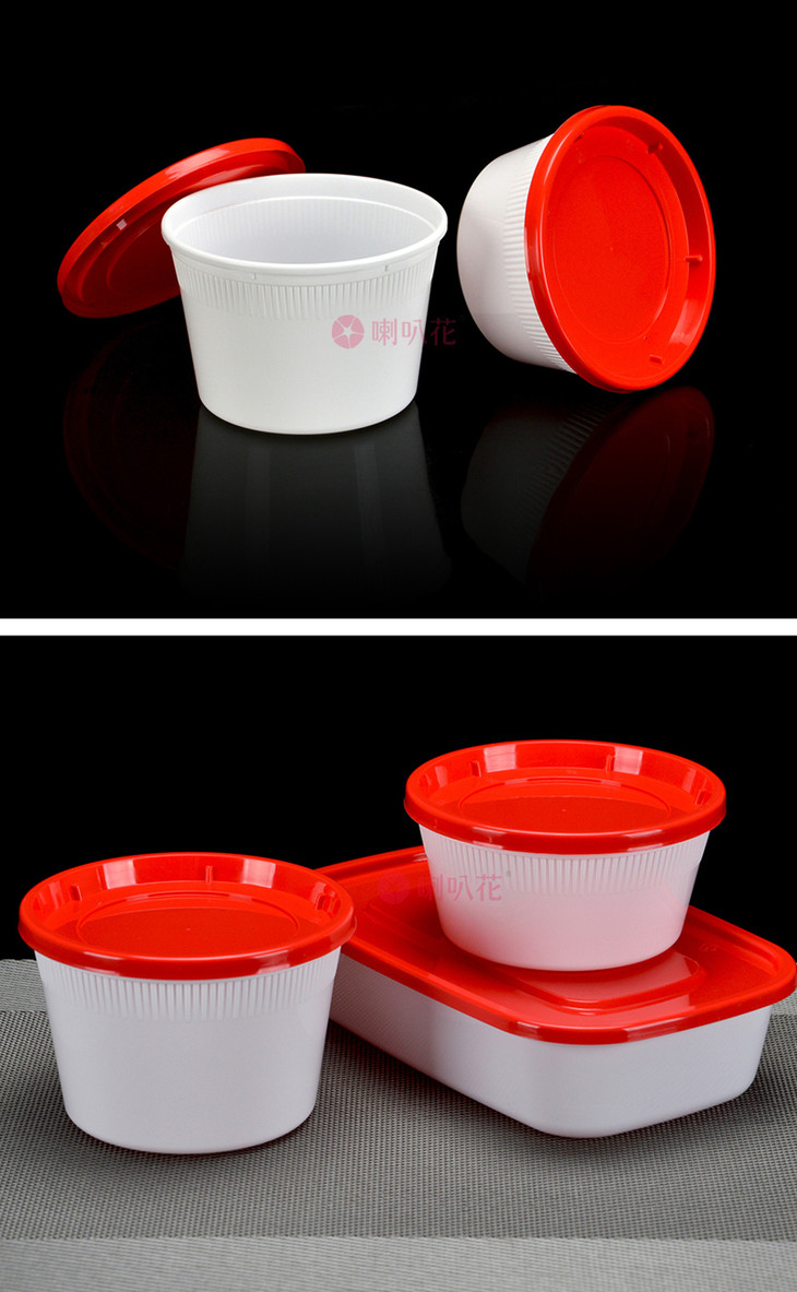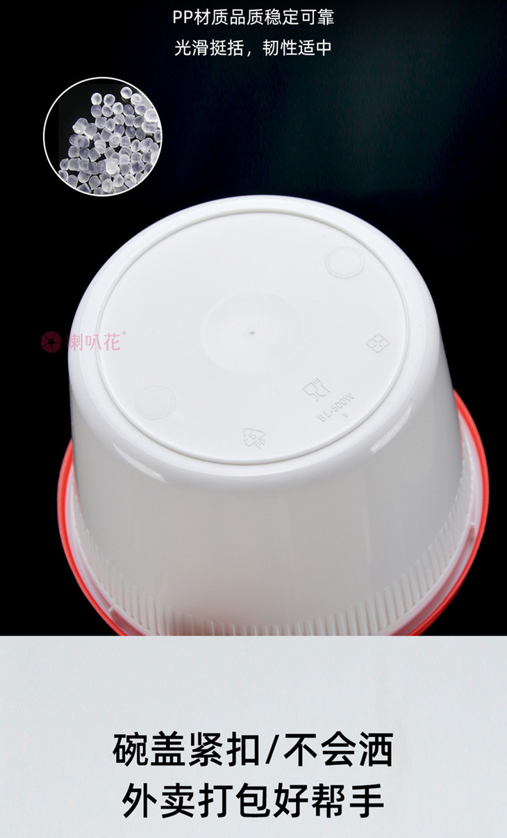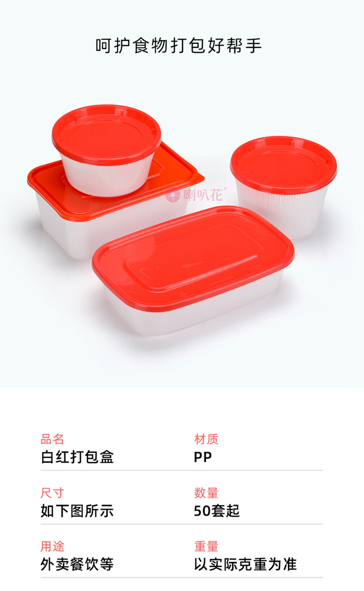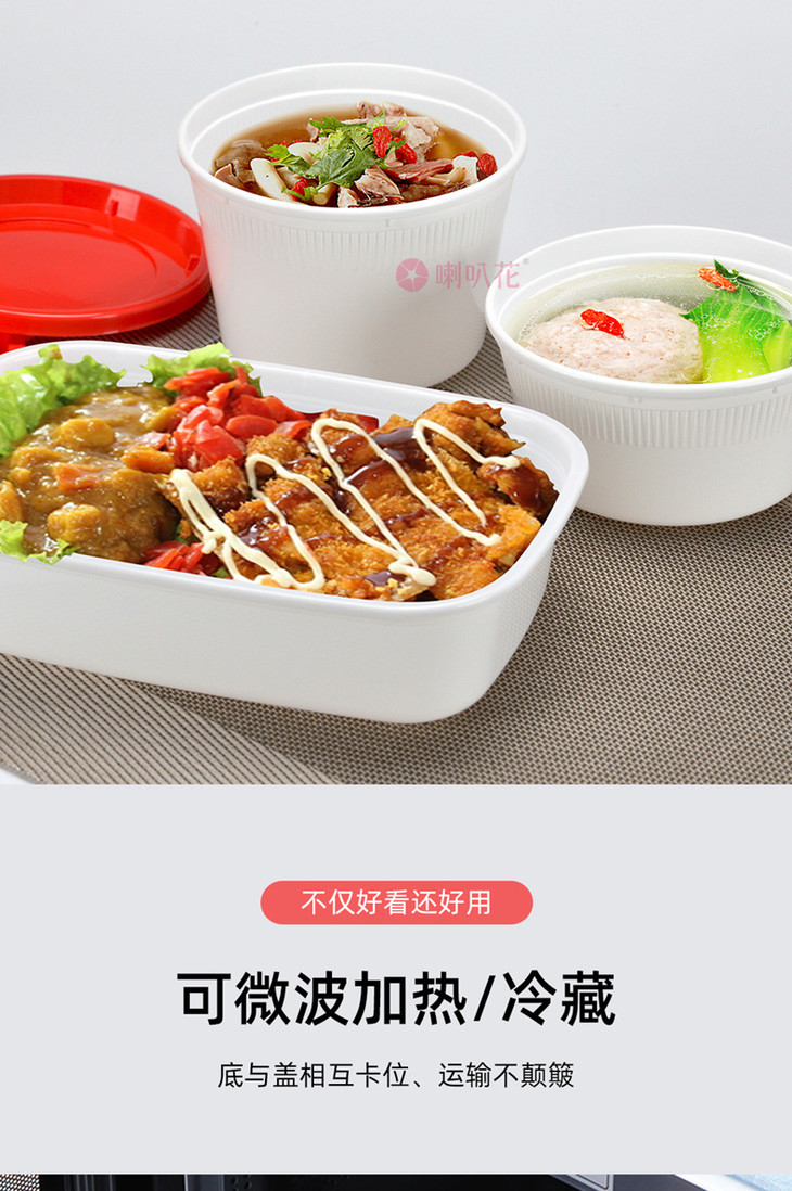 喇叭花圆形一次性餐盒白底红盖方盒塑料打包盒外卖快餐饭盒汤碗50套