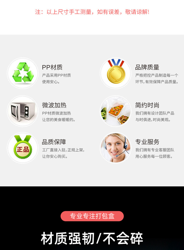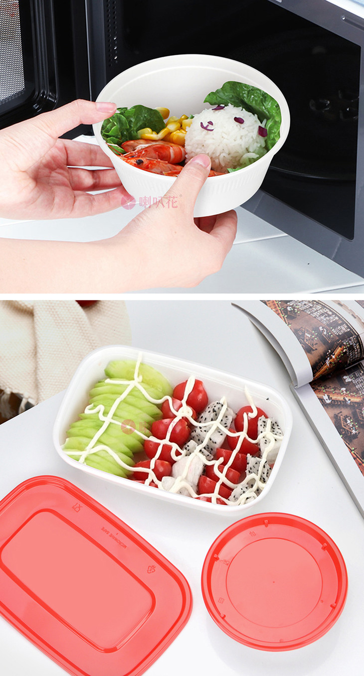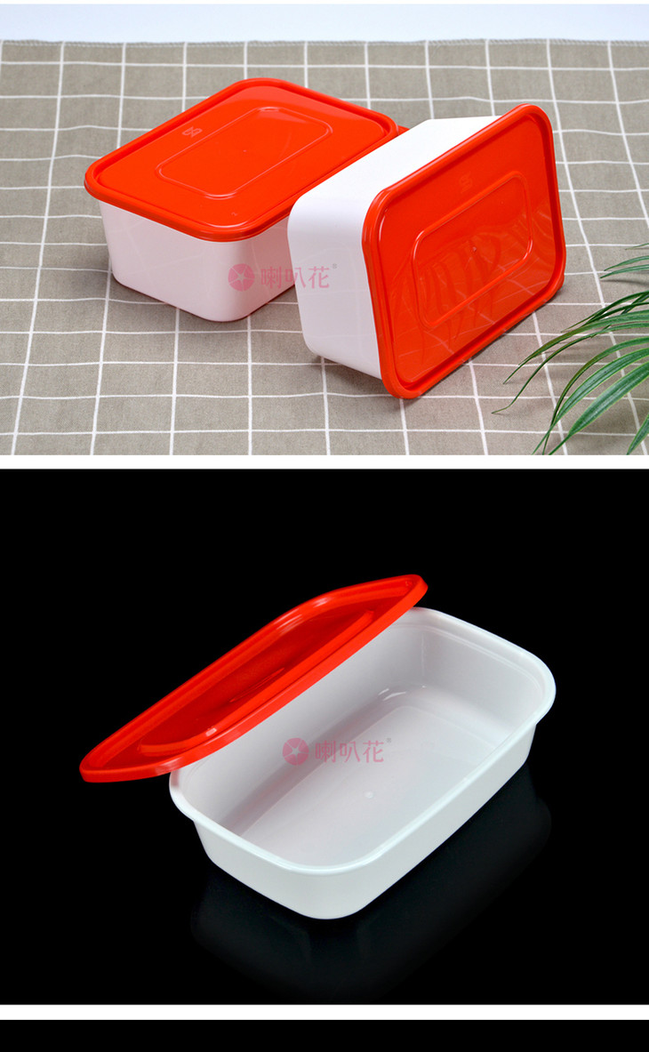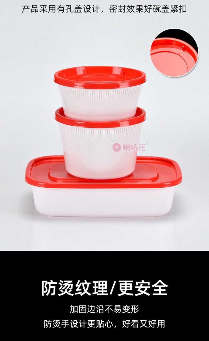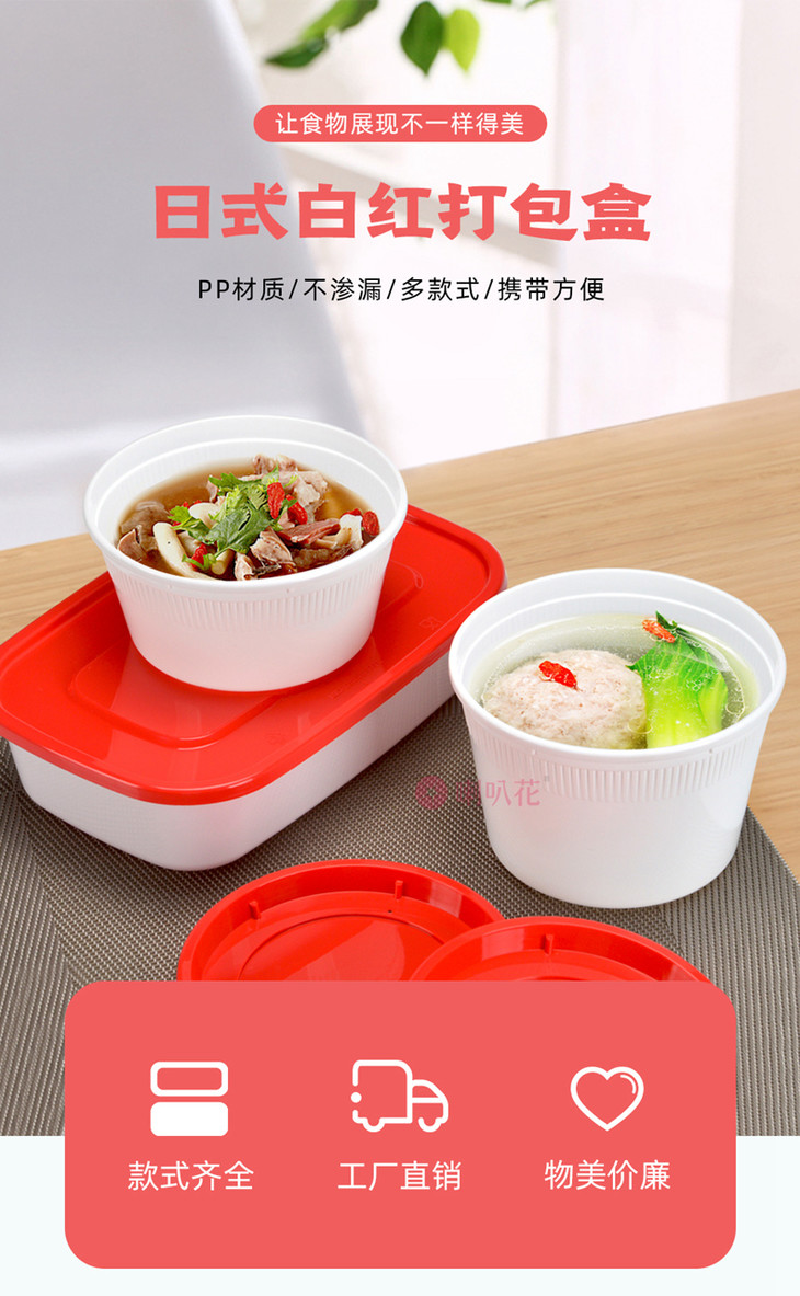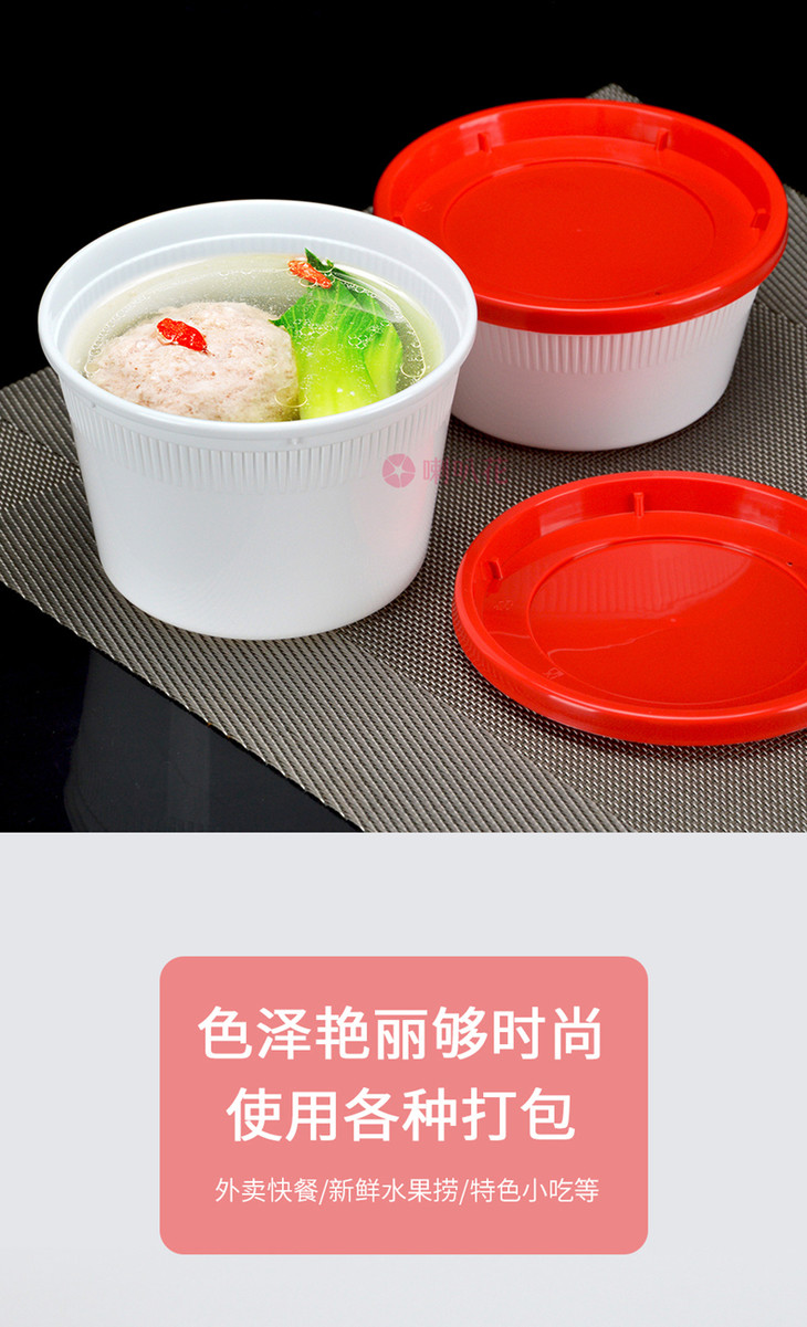喇叭花圆形一次性餐盒白底红盖方盒塑料打包盒外卖快餐饭盒汤碗50套