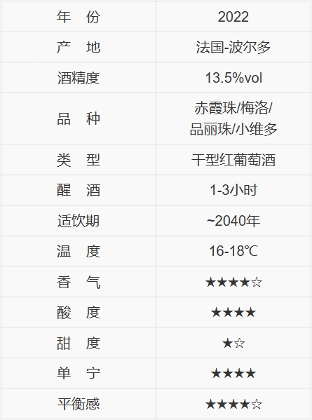| 品 种 | 赤霞珠/梅洛/品丽珠 |