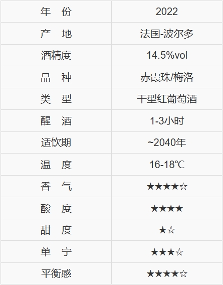 花香、樱桃烟丝、黑覆盆子、薄荷:黑黑加仑和梅子开启了香水的序幕。在味蕾上,这款酒丰富、清新、甜美、辛辣、纯净而浓郁,带有充满活力的、深蓝黑果和烟草的余味。这就是小木桐罗斯柴尔德!