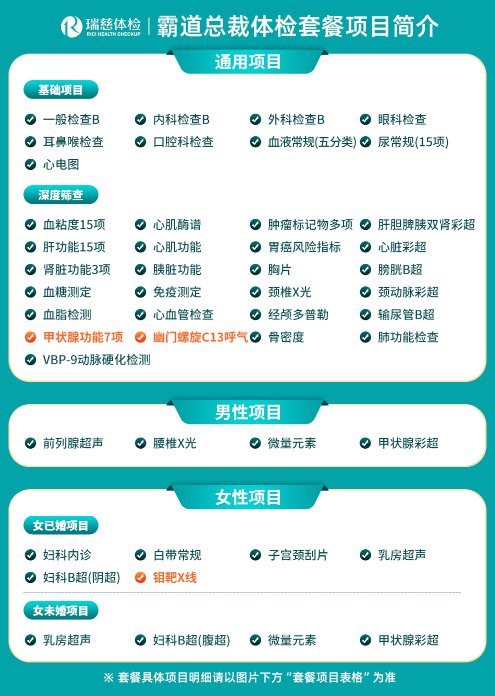 | 肝功能十五项,血脂七项,甲状腺功能七项,多项肿瘤标志物,同型半胱氨酸(HCY),幽门螺旋杆菌检测,颈动脉B超,经颅多普勒,心脏B超等等 |