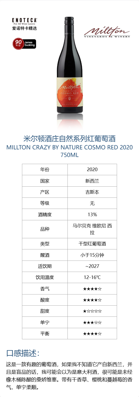 【生物动力混酿高分】Millton Crazy By Nature Cosmo Red 2020 750Ml 米尔顿酒庄自然系列红葡萄酒