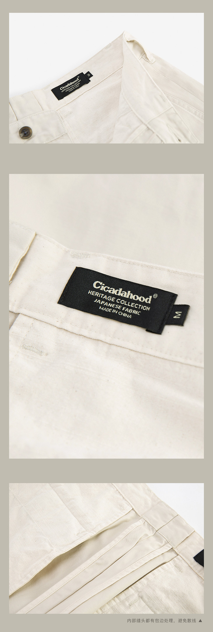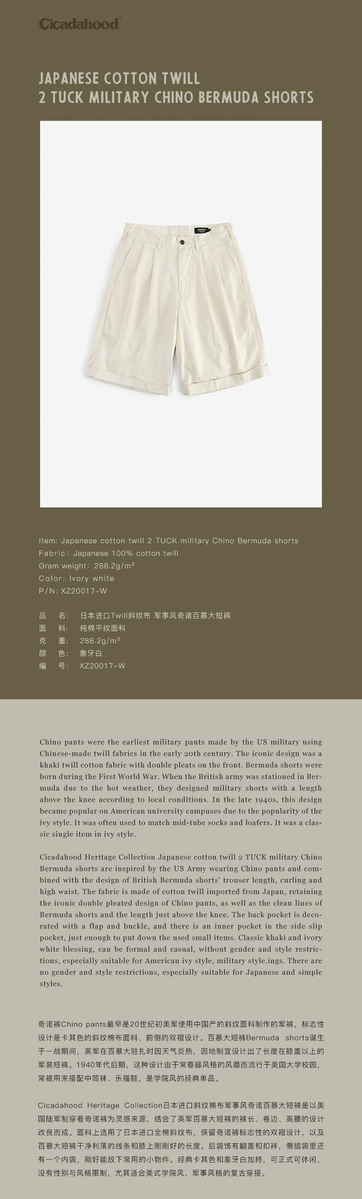 Cicadahood日本进口Twill斜纹棉布军事风奇诺裤百慕大短裤 象牙白