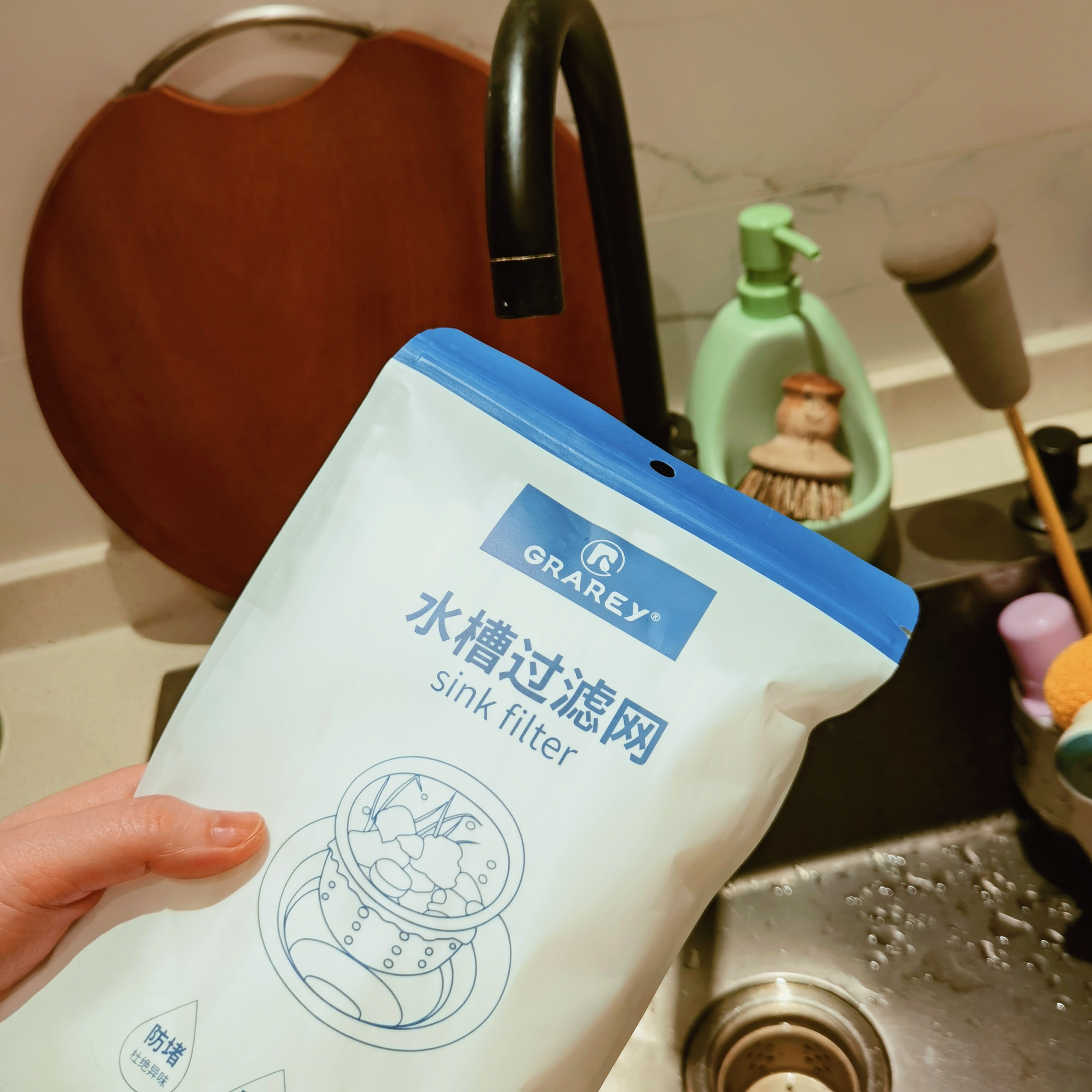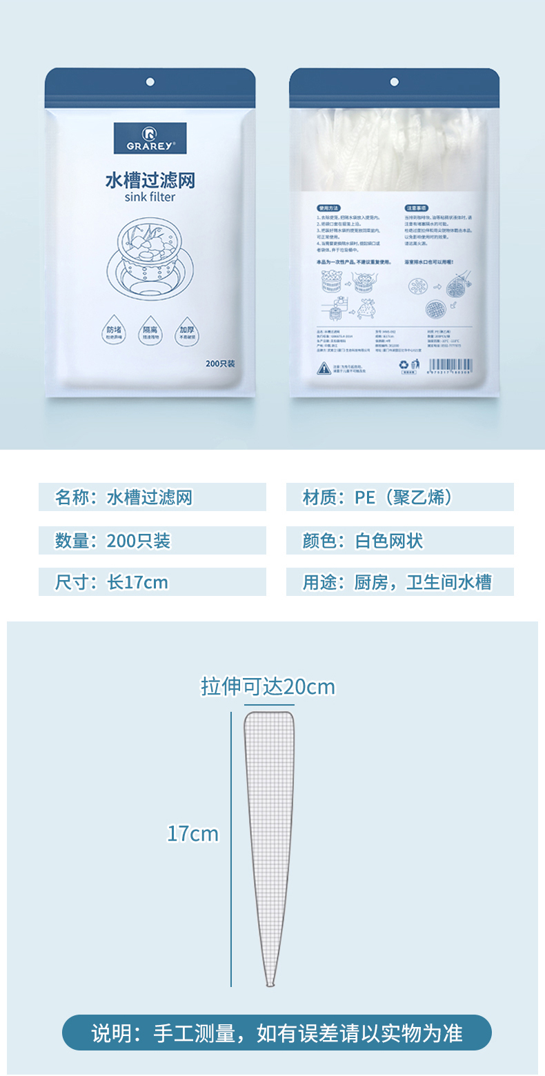 GRAREY 水槽过滤材质是PE不是涤纶,加厚加密,套在水槽里稳稳当当,洗完碗直接把水槽里装满垃圾后的网兜丢进垃圾桶就可以,干干净净,绝对是救星!像我家里猫猫狗狗多,浴室水槽也经常有毛毛堵,很是需要,一套一拎,不用担心管道堵塞,省时,健康,还特便宜!
