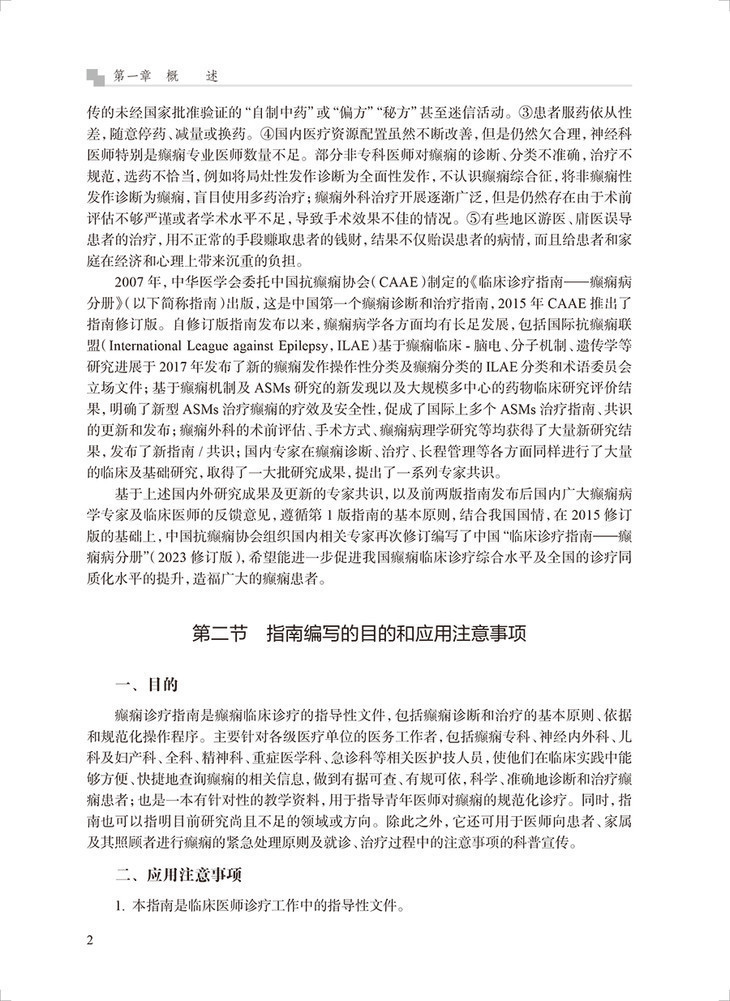 临床诊疗指南——癫痫病分册出版以来,癫痫临床-脑电、分子机制、遗传学等研究取得了较大进展。国际抗癫痫联盟(International League against Epilepsy, ILAE)于2017年发布了新的癫痫发作操作性分类及癫痫病分类的ILAE 分类和术语委员会立场文件;基于癫痫机制及ASM研究的新发现以及大规模多中心的药物临床研究评价结果,明确了新型ASM治疗癫痫的疗效及安全性;对于癫痫外科的术前评估、手术方式、癫痫病灶病理学研究等也有了大量研究结果和新的观点、共识;国内专家在癫痫诊断、治疗、长程管理等各方面同样进行了大量的临床及基础研究,取得了一大批研究成果,提出了一系列专家共识。本指南结合国内外最新的进展从癫痫概念、诊断、病因、内外科治疗、难治性癫痫术前评估、癫痫持续状态、癫痫中医治疗等,给予了详细描写。