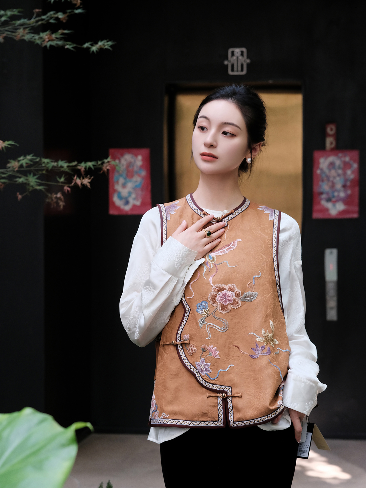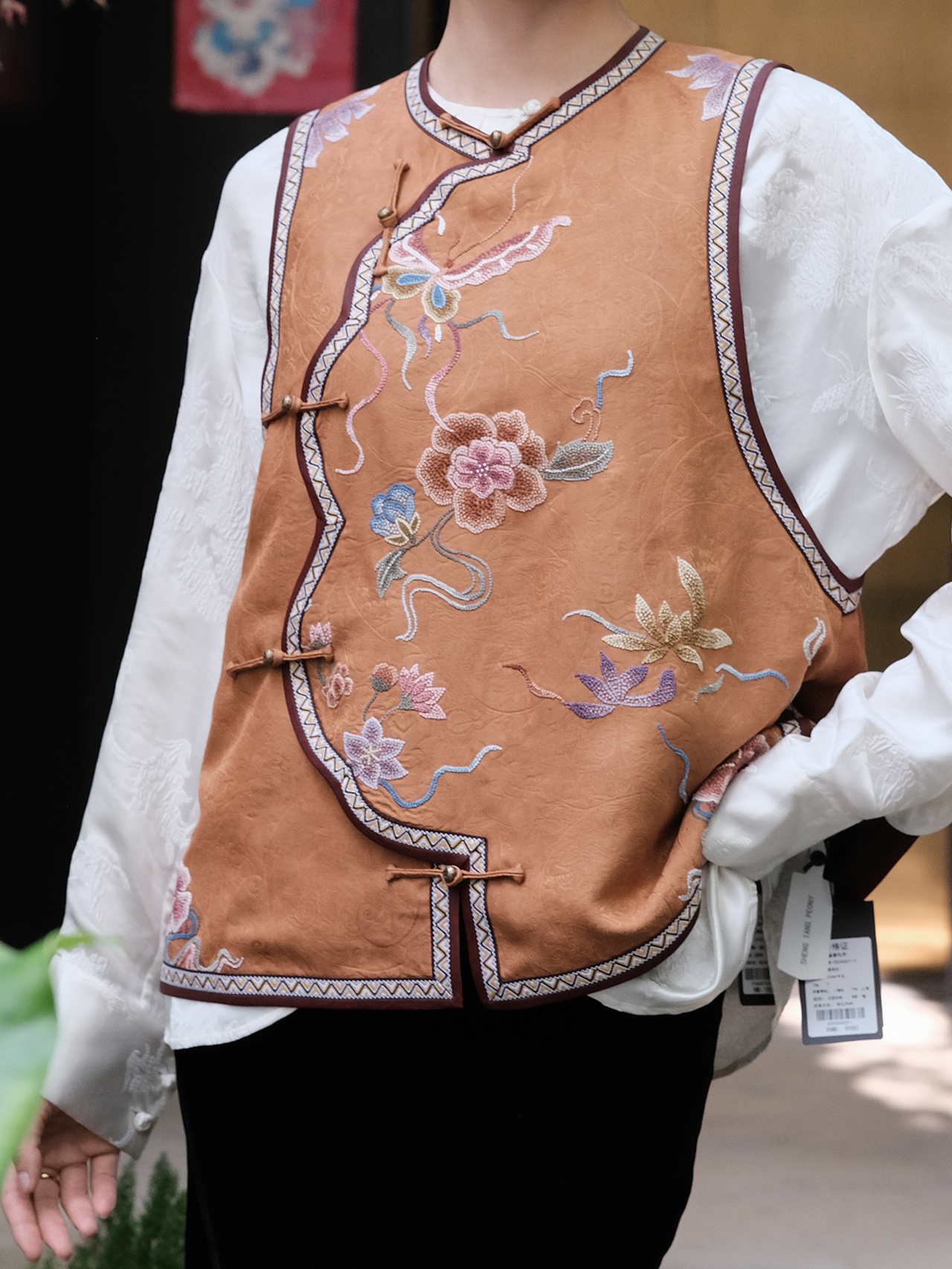 盛唐牡丹盛奢系列|高货-手绣全打籽蝶恋花花瓣马甲深咖色(限量款)