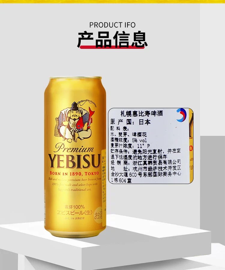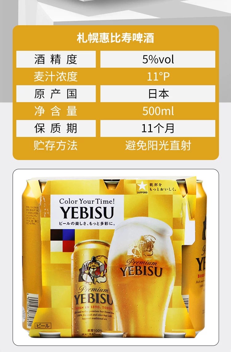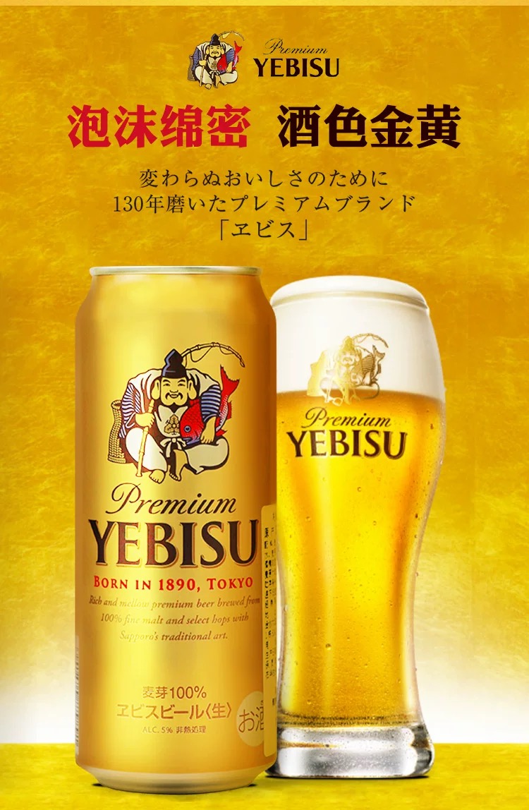 日本进口札幌YEBISU惠比寿100%全麦芽金麦啤酒 5.0%vol 500ml