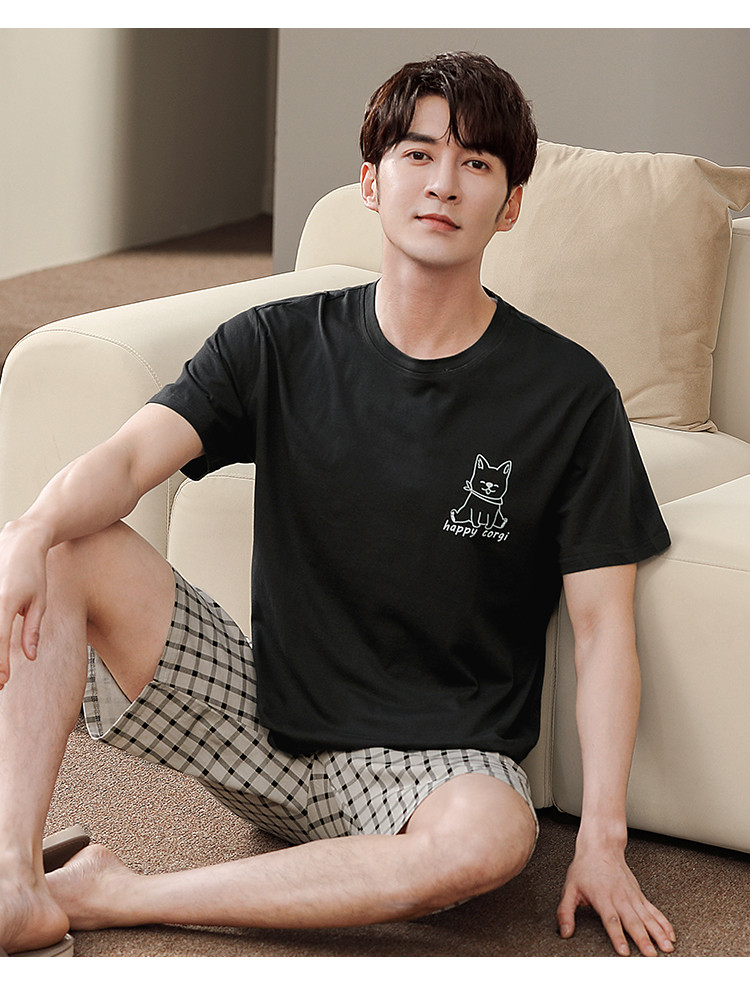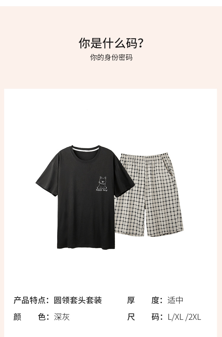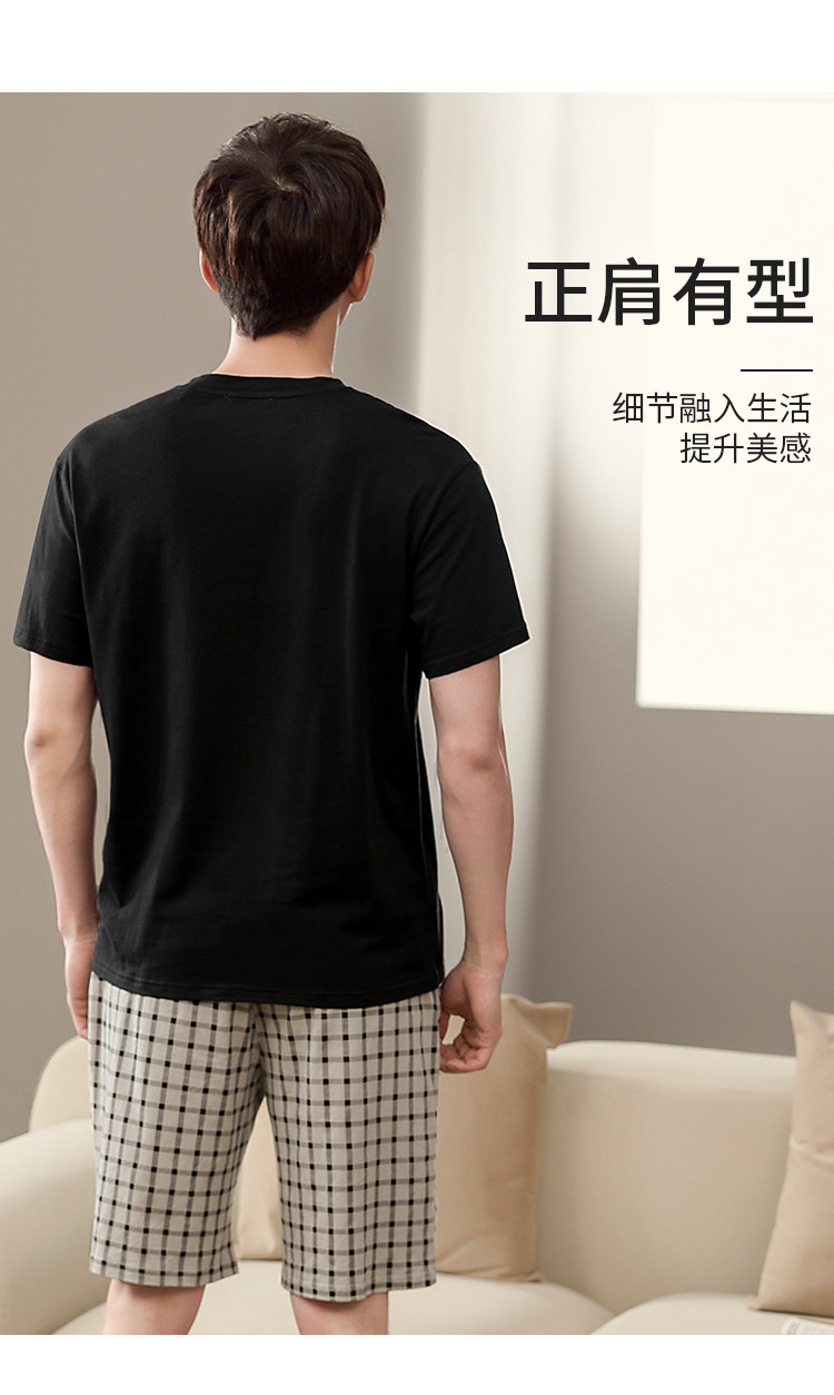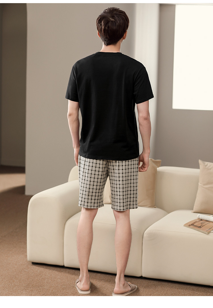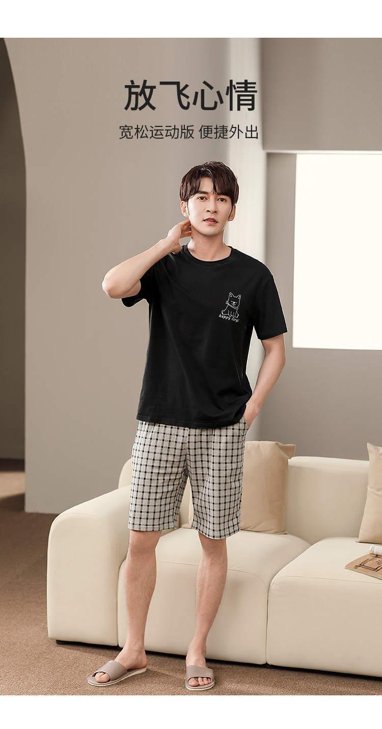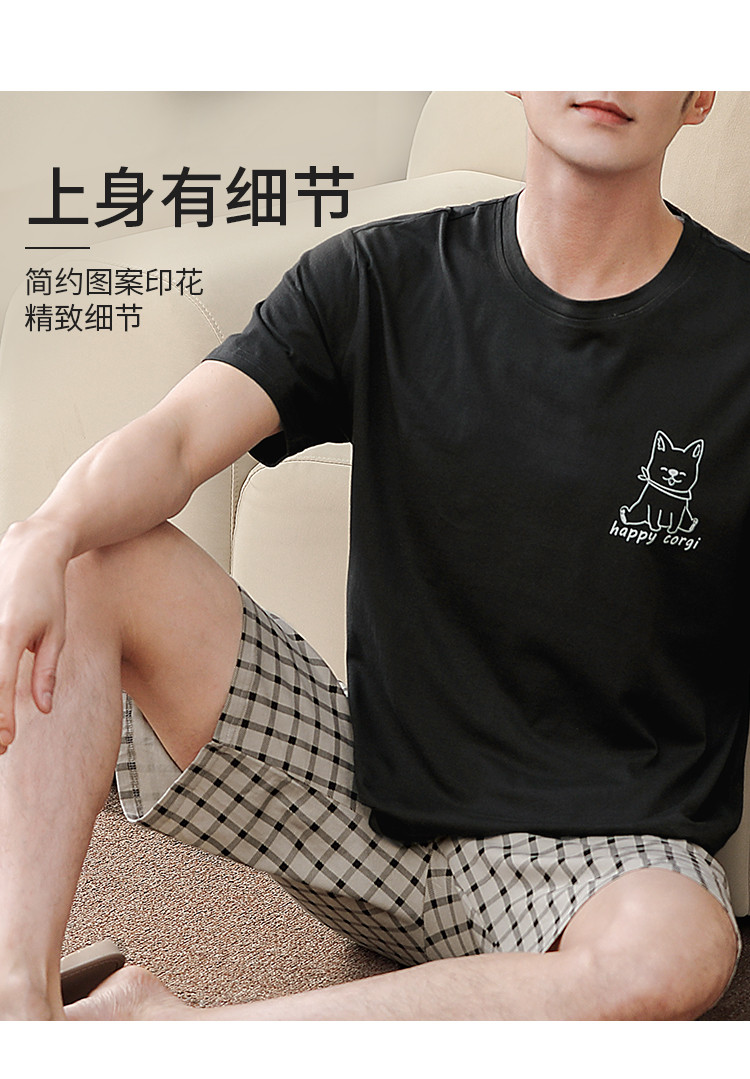 【纯棉舒适】夏季可外穿圆领男士短袖格子短裤睡衣男士家居服套装 清浅时光