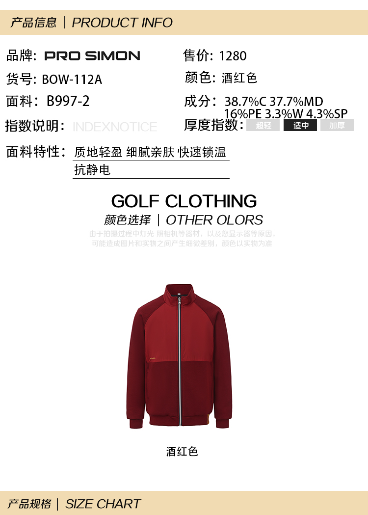 【羊毛空气层】BOW-112A PROSIMON高尔夫秋冬男款运动立领夹克外套