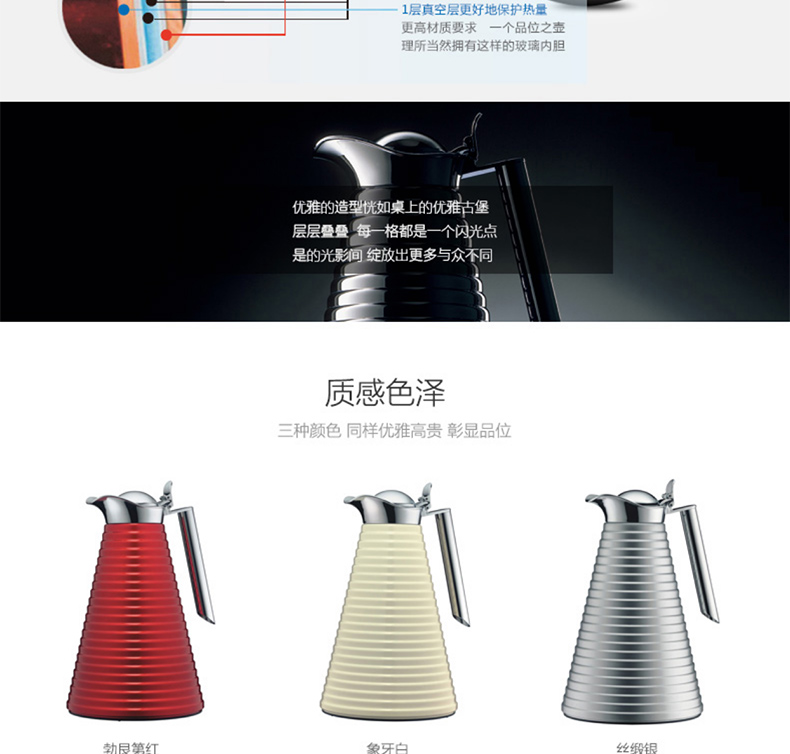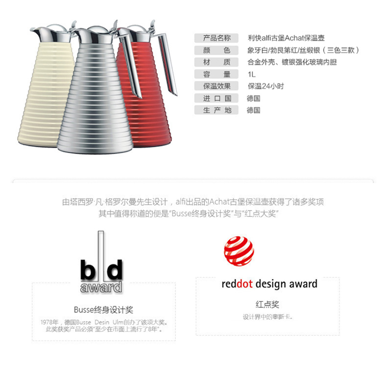 【6F】利快 玻璃内胆古堡保温壶德国进口Alfi家用暖壶热水瓶暖水瓶热水壶暖水壶按压式保温瓶1L 象牙白色1L