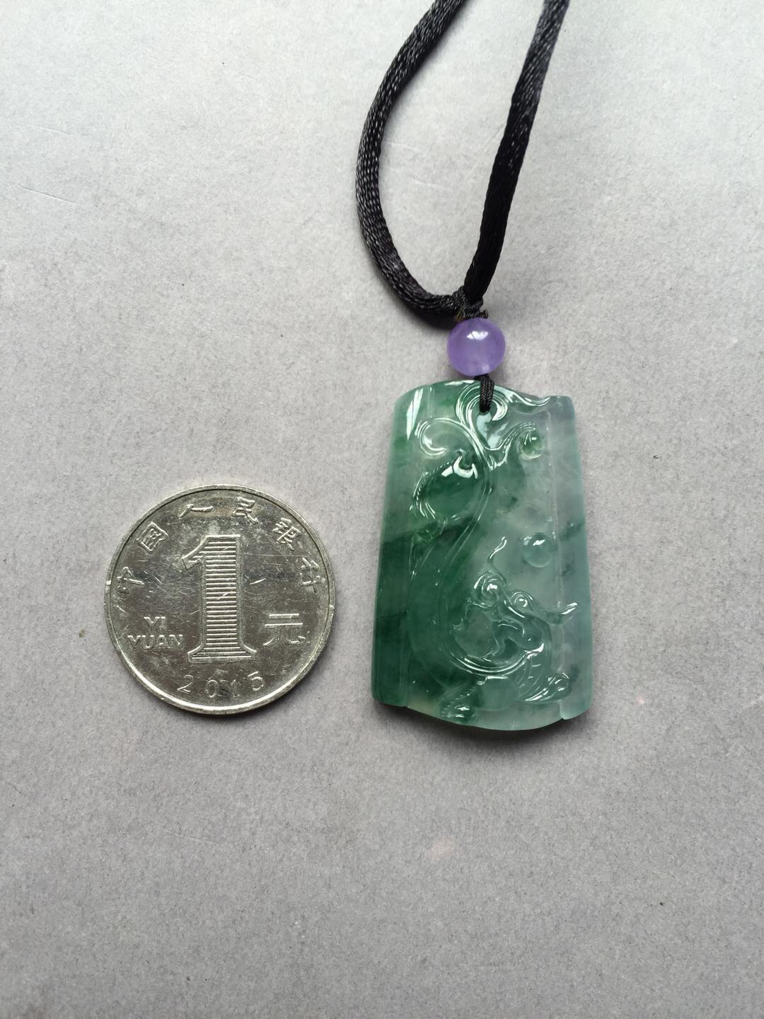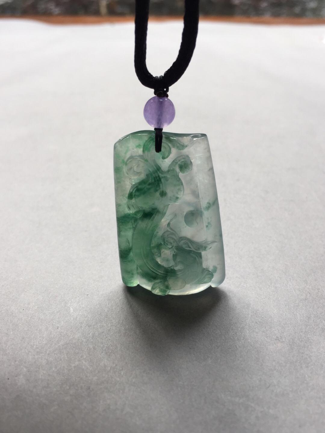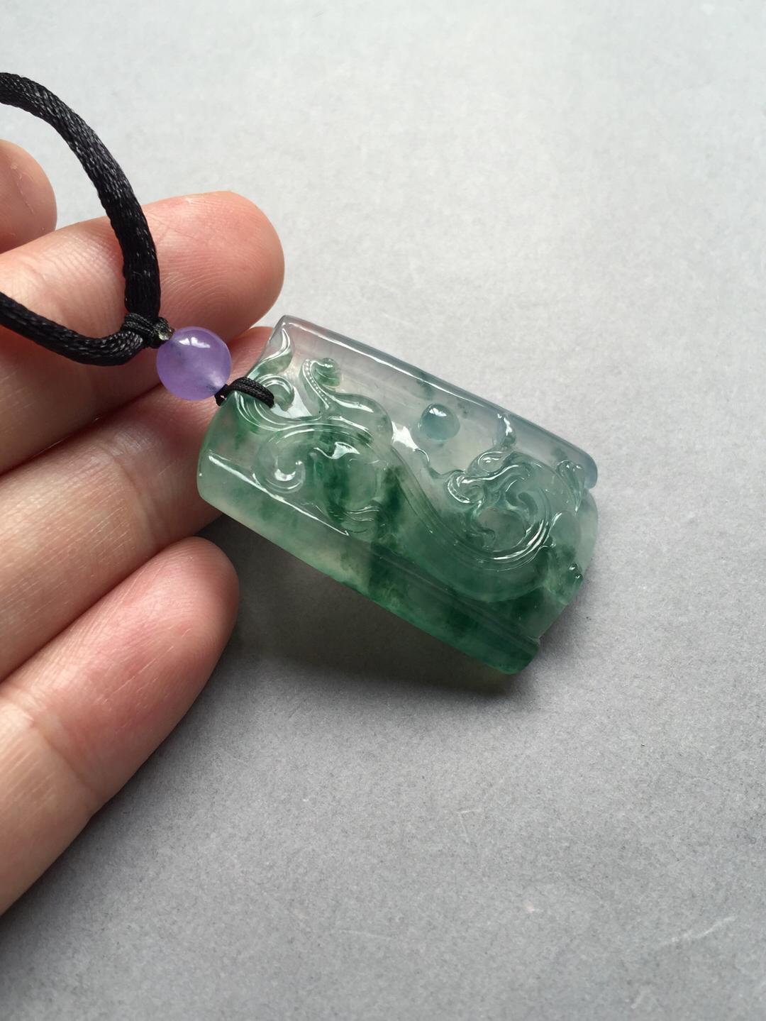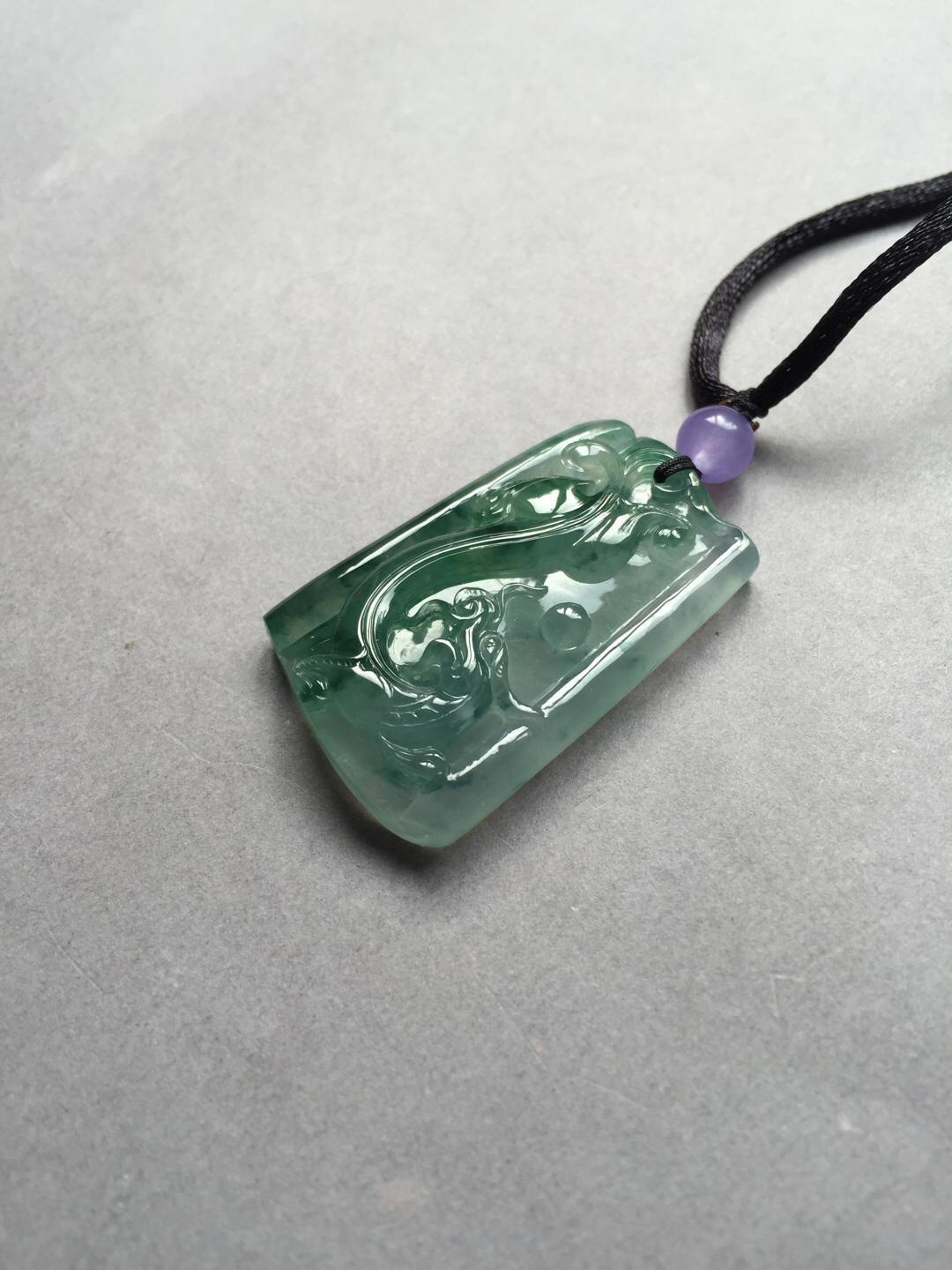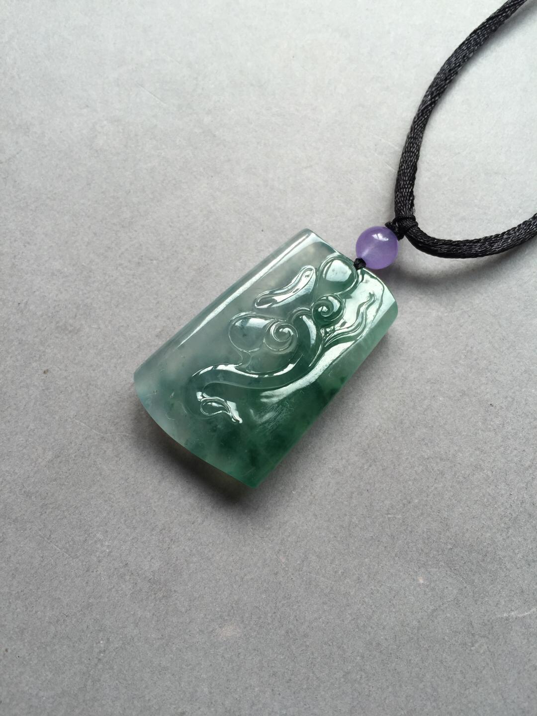 男士精品来一个,翡翠高冰种飘花龙牌,37.5*23.7*7.8mm,尺寸方正,厚实饱满,稀有厚庄尺寸,价值倍增,精雕细刻,充满东方古典意味。种水太棒,荧光四射,灵动的飘花仿佛一幅泼墨山水,气质高雅的一件宝贝,推荐收藏