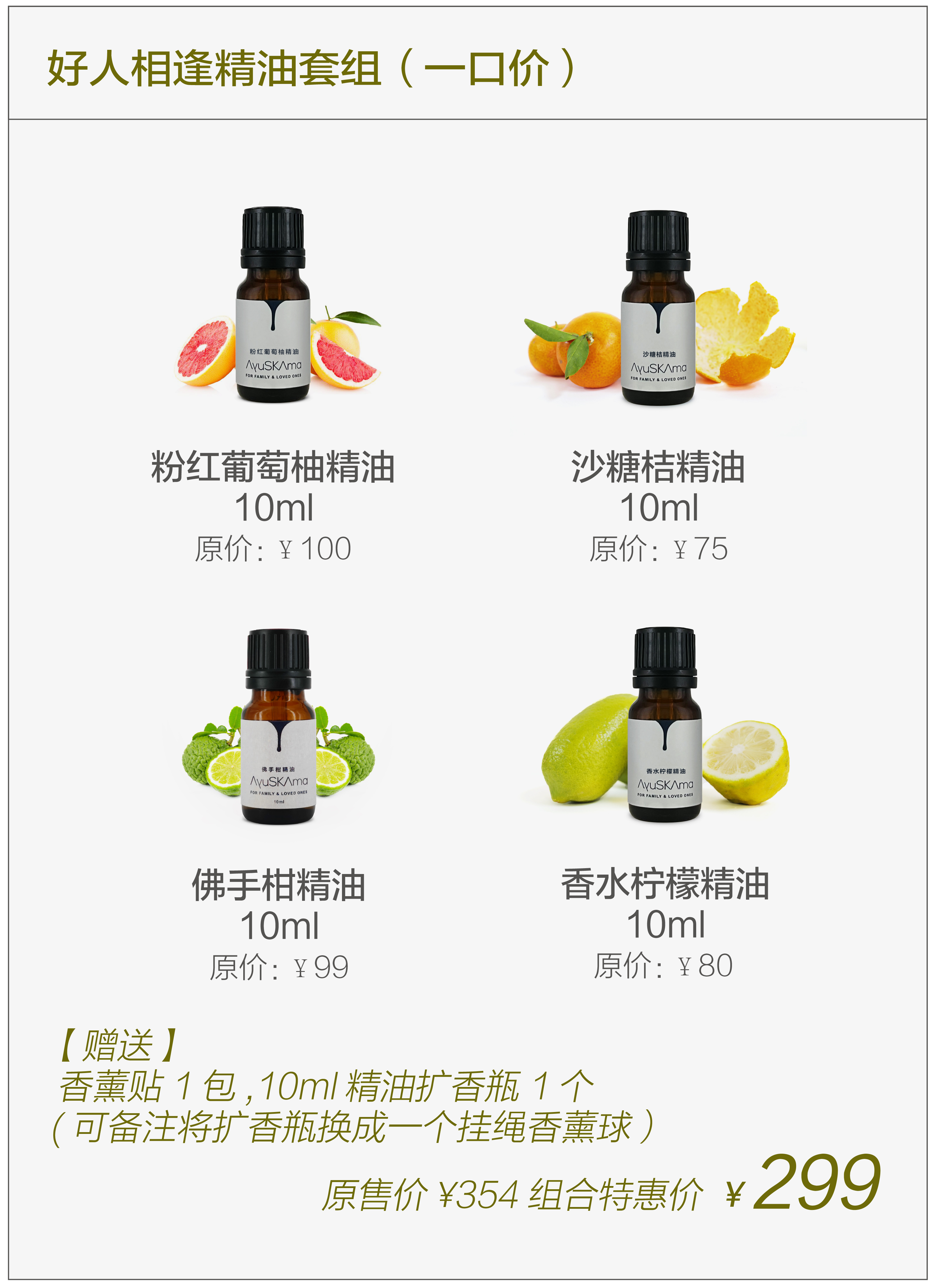 包括:粉红葡萄柚精油1支、沙糖桔精油1支、佛手柑精油1支、香水柠檬精油1支。原售价354元,组合特惠价299元。