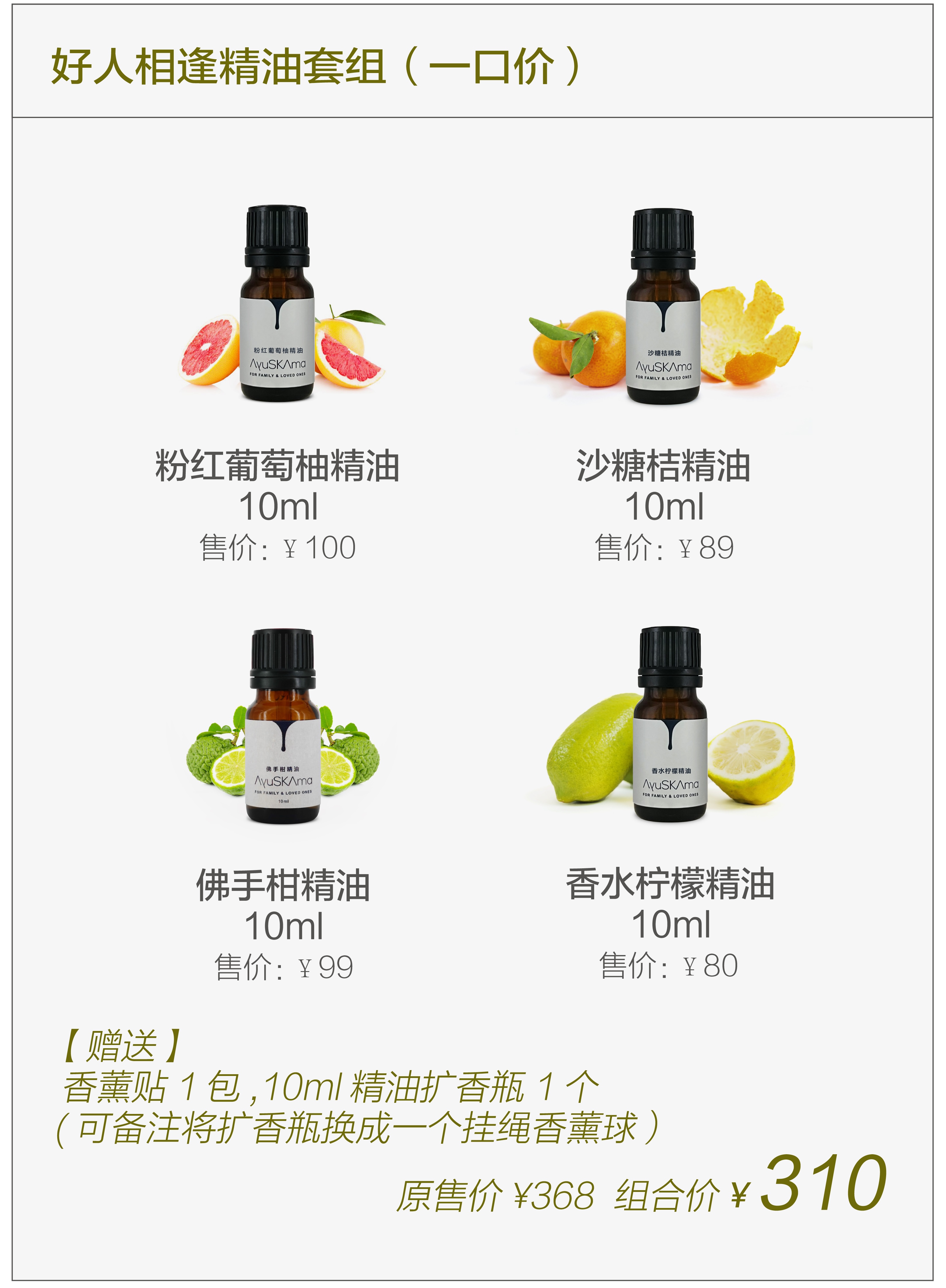 包括:粉红葡萄柚精油1支、沙糖桔精油1支、佛手柑精油1支、香水柠檬精油1支。原售价368元,组合特惠价310元。