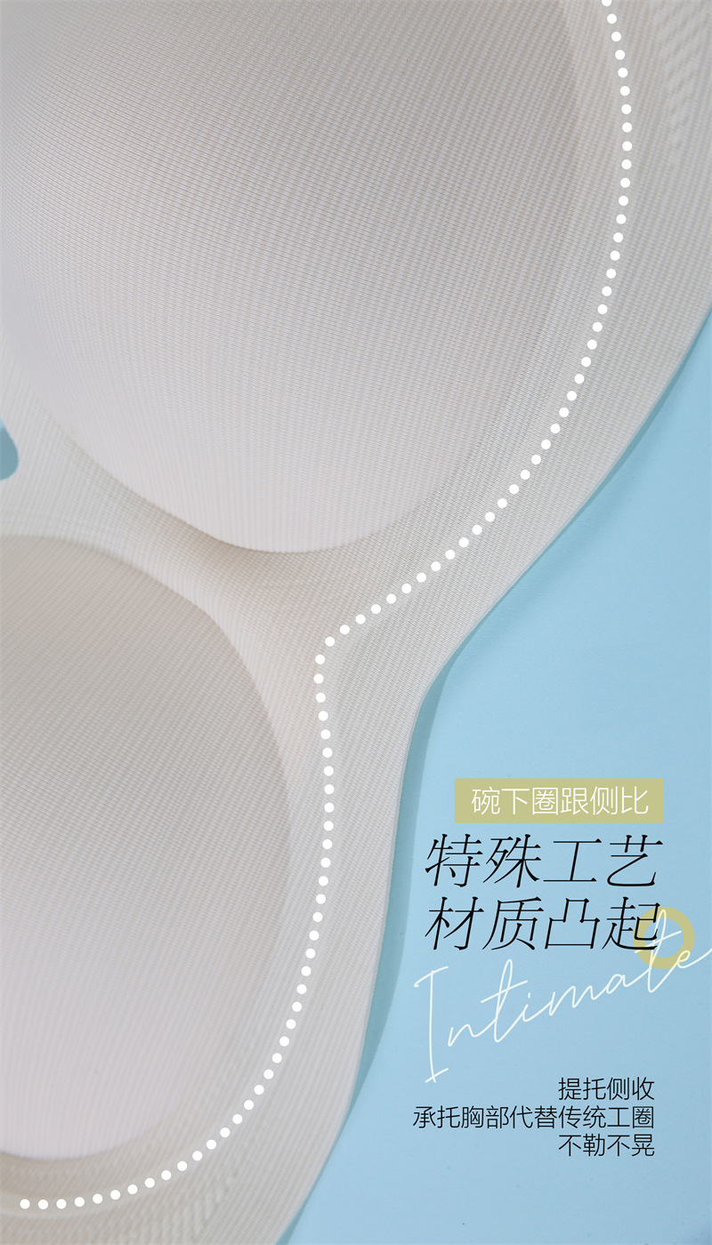 ❹ 下摆跟侧比做特殊工艺材质凸起提托侧收,承托胸部代替传统工圈,不勒不晃。