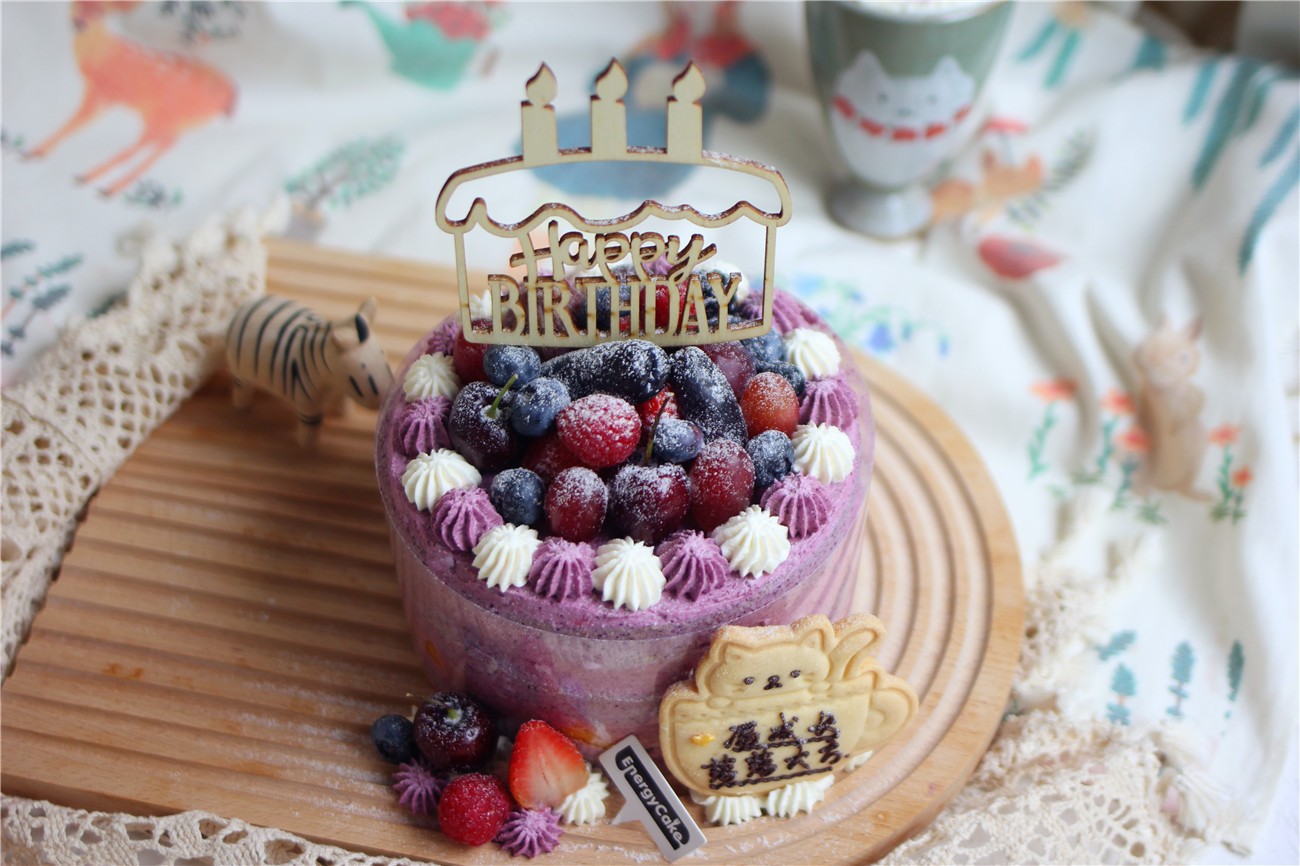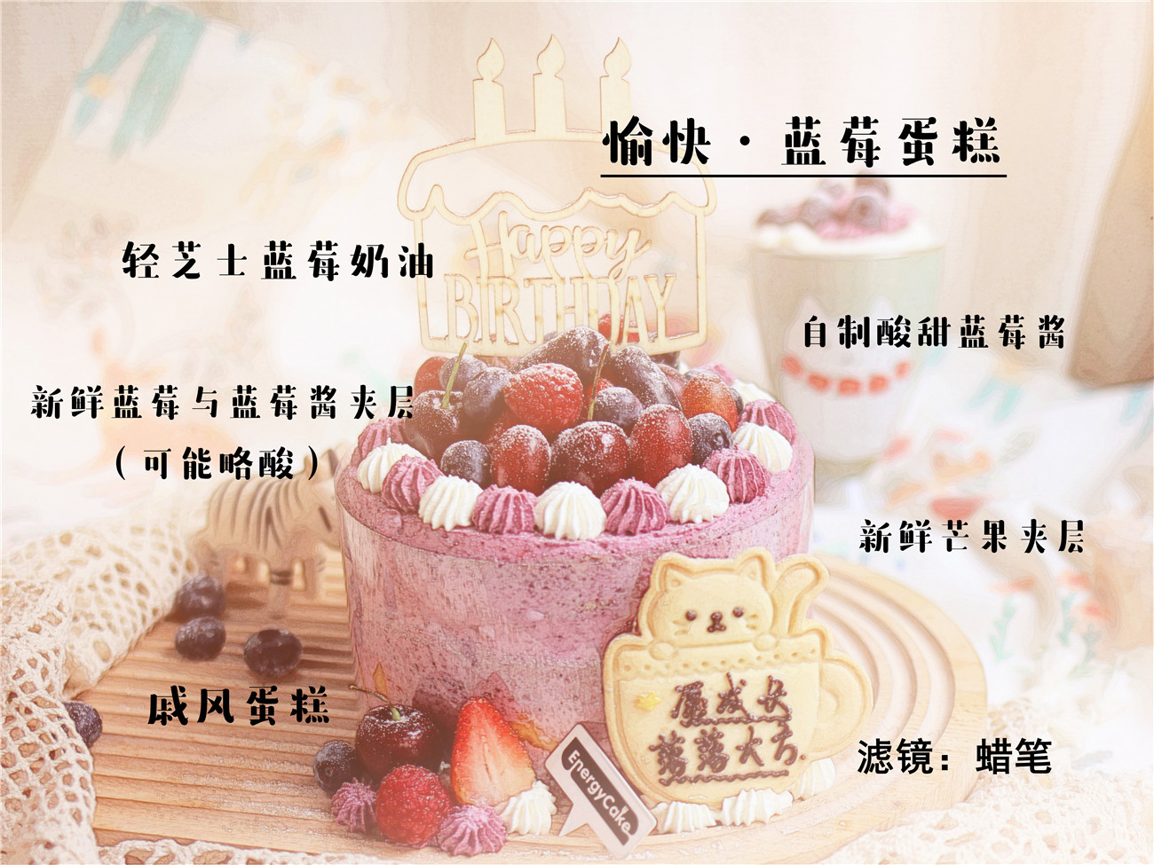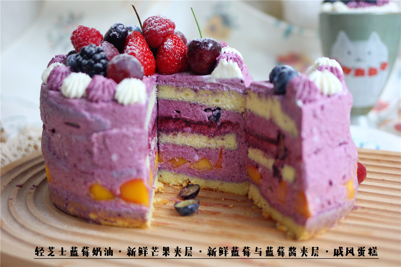 蛋糕部分:自制轻芝士蓝莓奶油、新鲜蓝莓、新鲜芒果、自制浓郁蓝莓酱