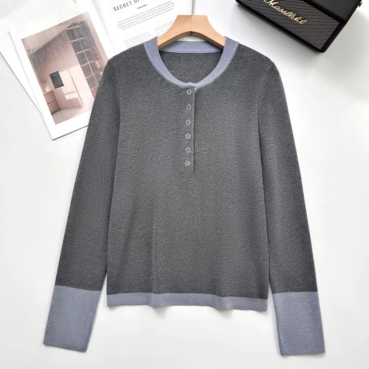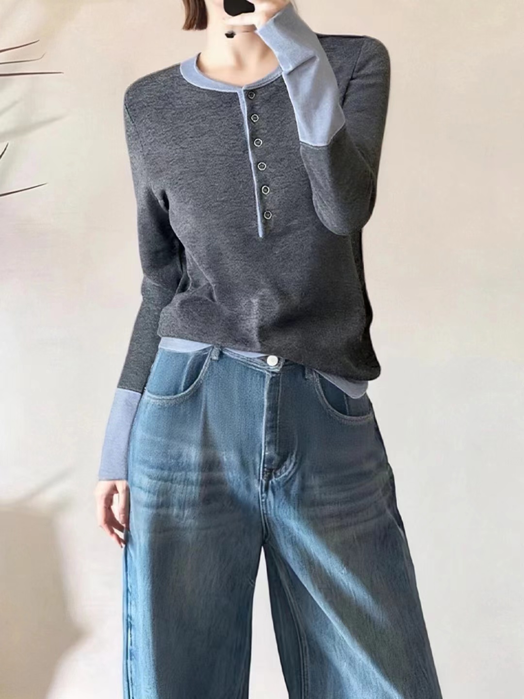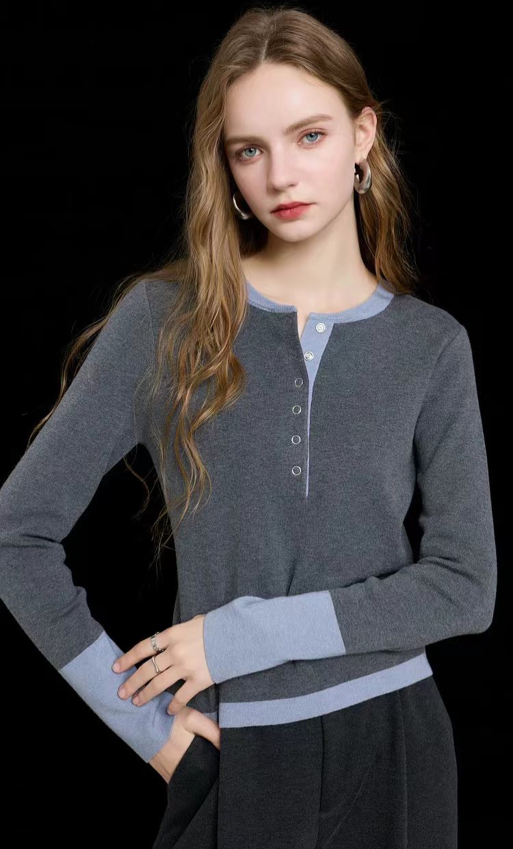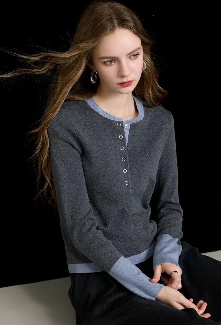 2025秋冬季设计感拼色假两件针织衫毛衣,知识分子撞色针织衫! 假两件撞色设计,主色是羔级深邃灰,显贵不廉价,领口+袖口拼接蓝色,像内搭叠穿的效果,但不用纠结搭配!领口圆领+四合扣设计,可解开扣子但半开领穿,比圆领更显脸小,比V领更内敛,露出一点点锁骨,拉长脖颈线条~ 整体是微宽松的H型版型,修身不紧绷,不贴肉但也不松垮,刚好藏住腰腹和手臂的小肉肉,久坐也不会勒出尴尬的痕迹;下摆是自然垂落的弧度,搭配通勤配西裤塞一点下摆,显高又利落,优雅知性被同事夸像从杂志走出来的文艺女主! 面料是羊毛混纺,高密针织结构,羔级触感,让织物表面细腻平滑柔软贴肤的同时,保持良好回弹性久穿不易变形,不易起球从早八到晚九,依然利落在线!厚度可穿三季,春秋单穿,冬天做内搭,一件承包三季的通勤穿搭!