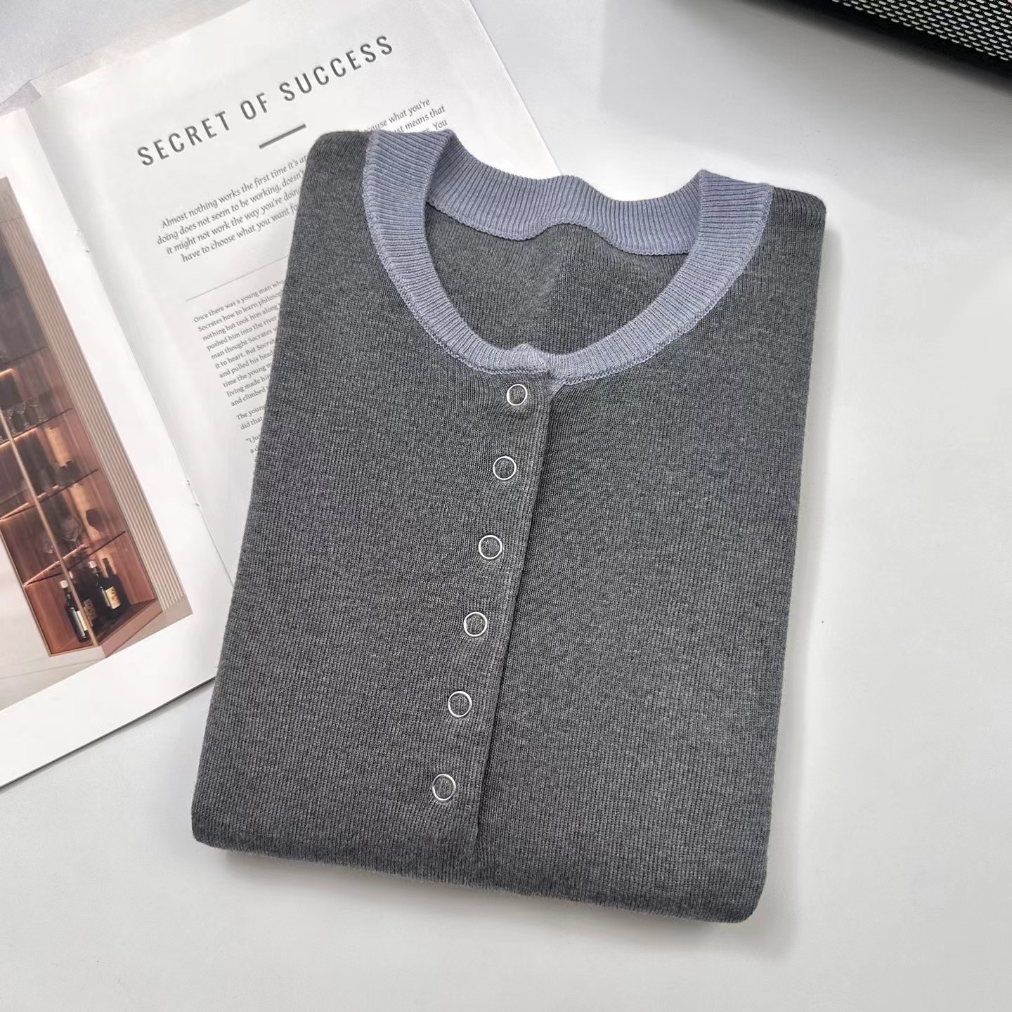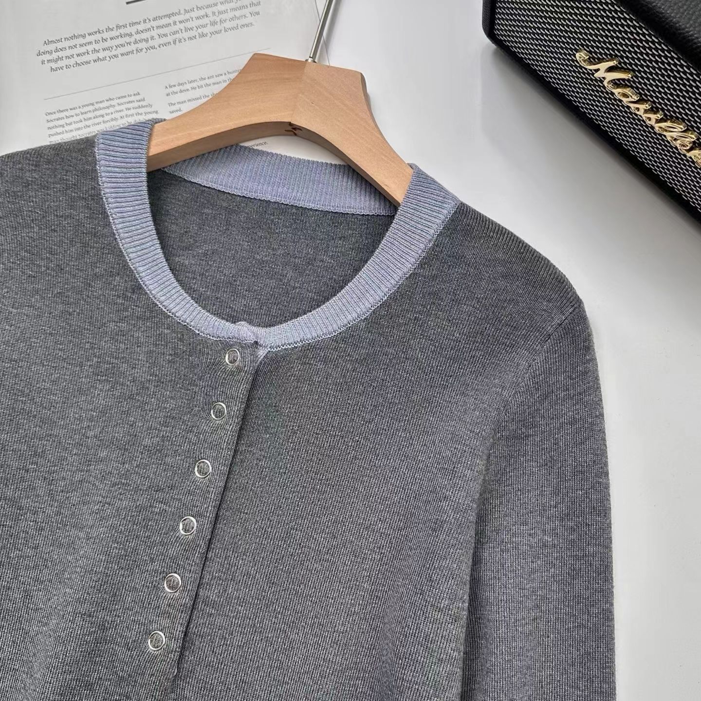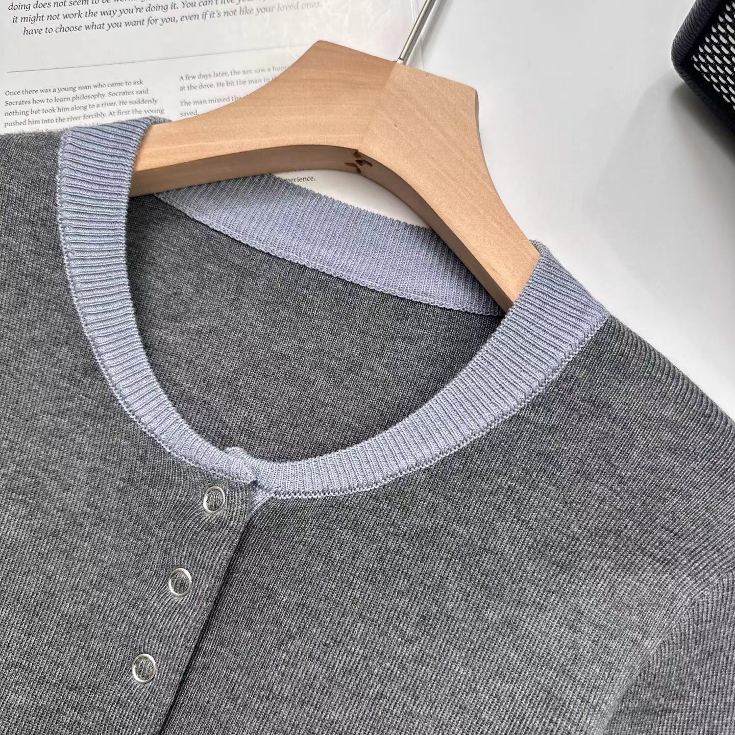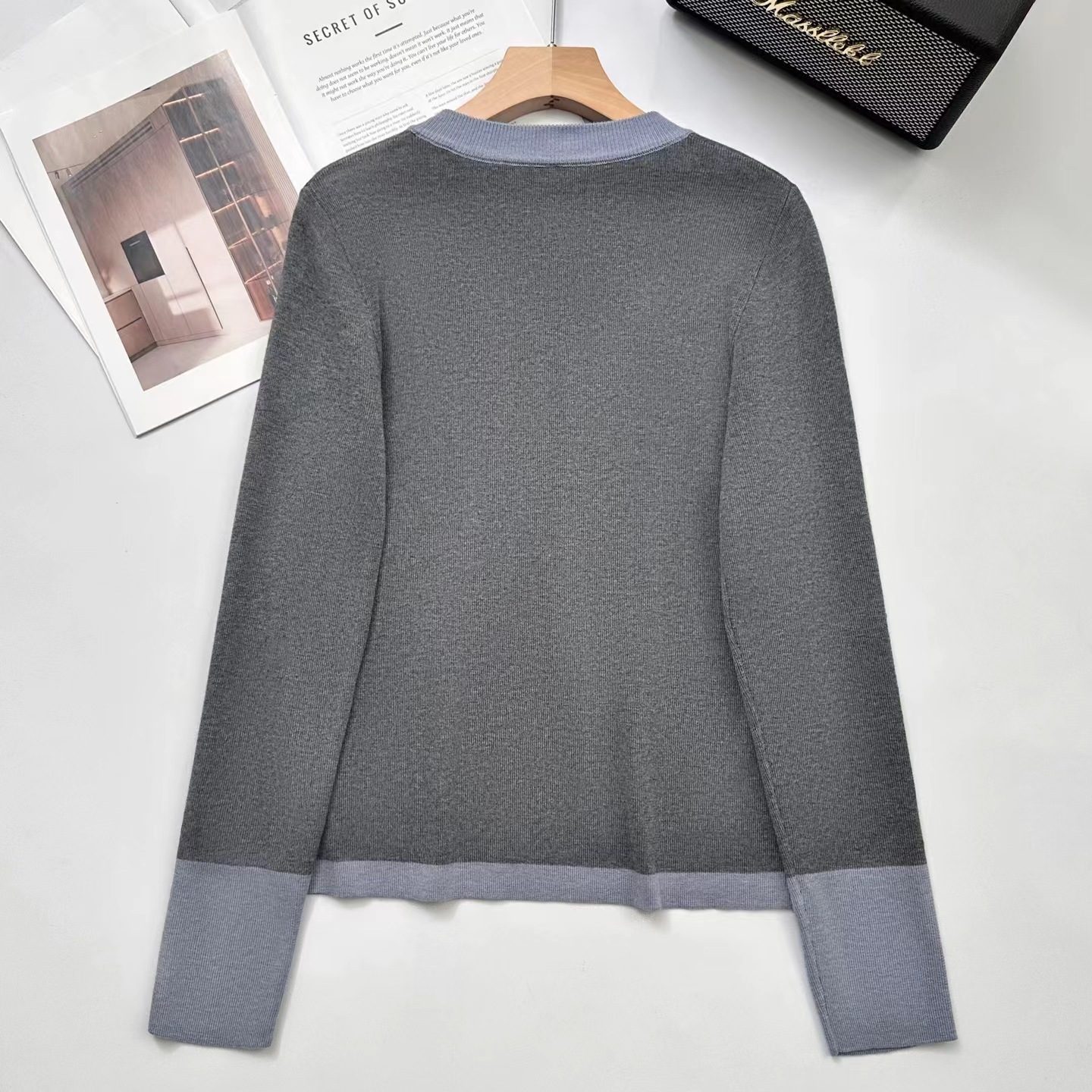 2025秋冬季设计感拼色假两件针织衫毛衣,知识分子撞色针织衫! 假两件撞色设计,主色是羔级深邃灰,显贵不廉价,领口+袖口拼接蓝色,像内搭叠穿的效果,但不用纠结搭配!领口圆领+四合扣设计,可解开扣子但半开领穿,比圆领更显脸小,比V领更内敛,露出一点点锁骨,拉长脖颈线条~ 整体是微宽松的H型版型,修身不紧绷,不贴肉但也不松垮,刚好藏住腰腹和手臂的小肉肉,久坐也不会勒出尴尬的痕迹;下摆是自然垂落的弧度,搭配通勤配西裤塞一点下摆,显高又利落,优雅知性被同事夸像从杂志走出来的文艺女主! 面料是羊毛混纺,高密针织结构,羔级触感,让织物表面细腻平滑柔软贴肤的同时,保持良好回弹性久穿不易变形,不易起球从早八到晚九,依然利落在线!厚度可穿三季,春秋单穿,冬天做内搭,一件承包三季的通勤穿搭!