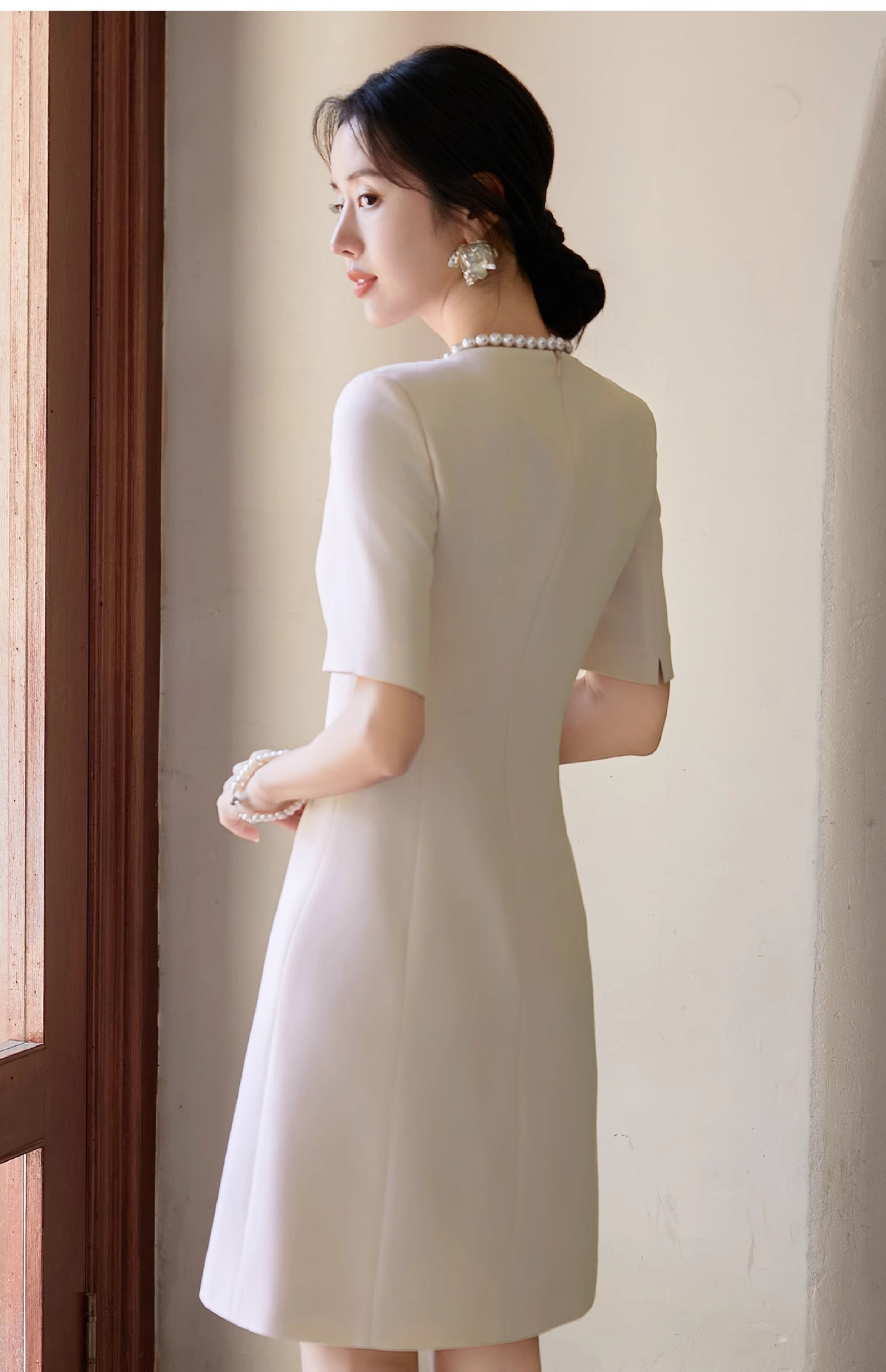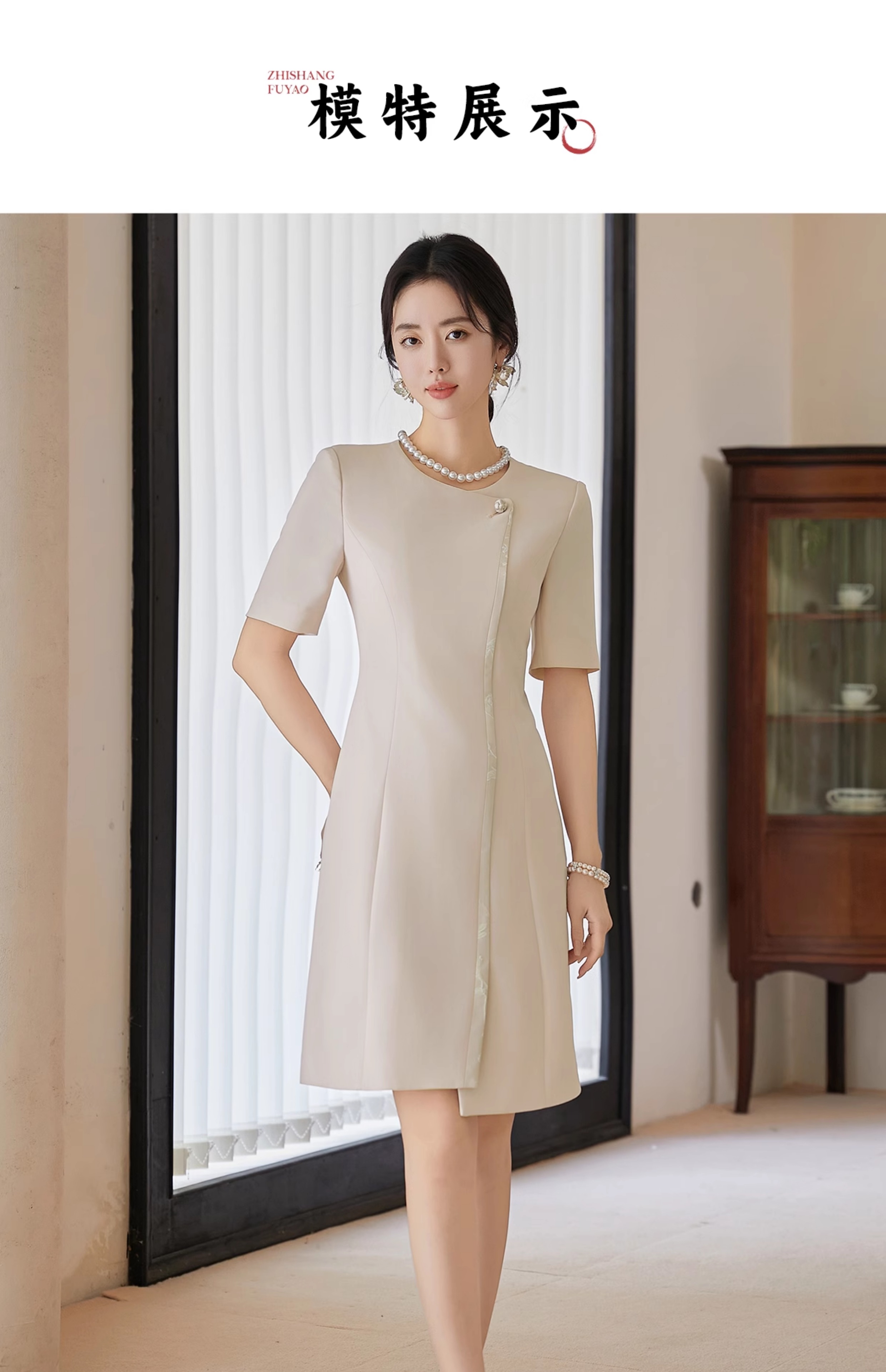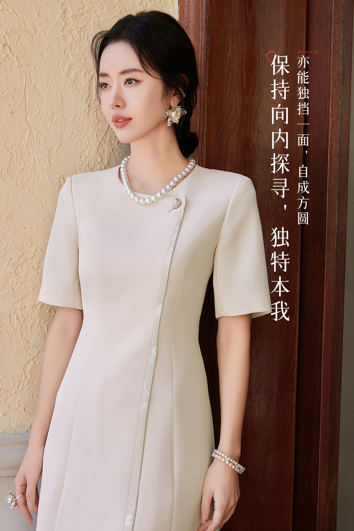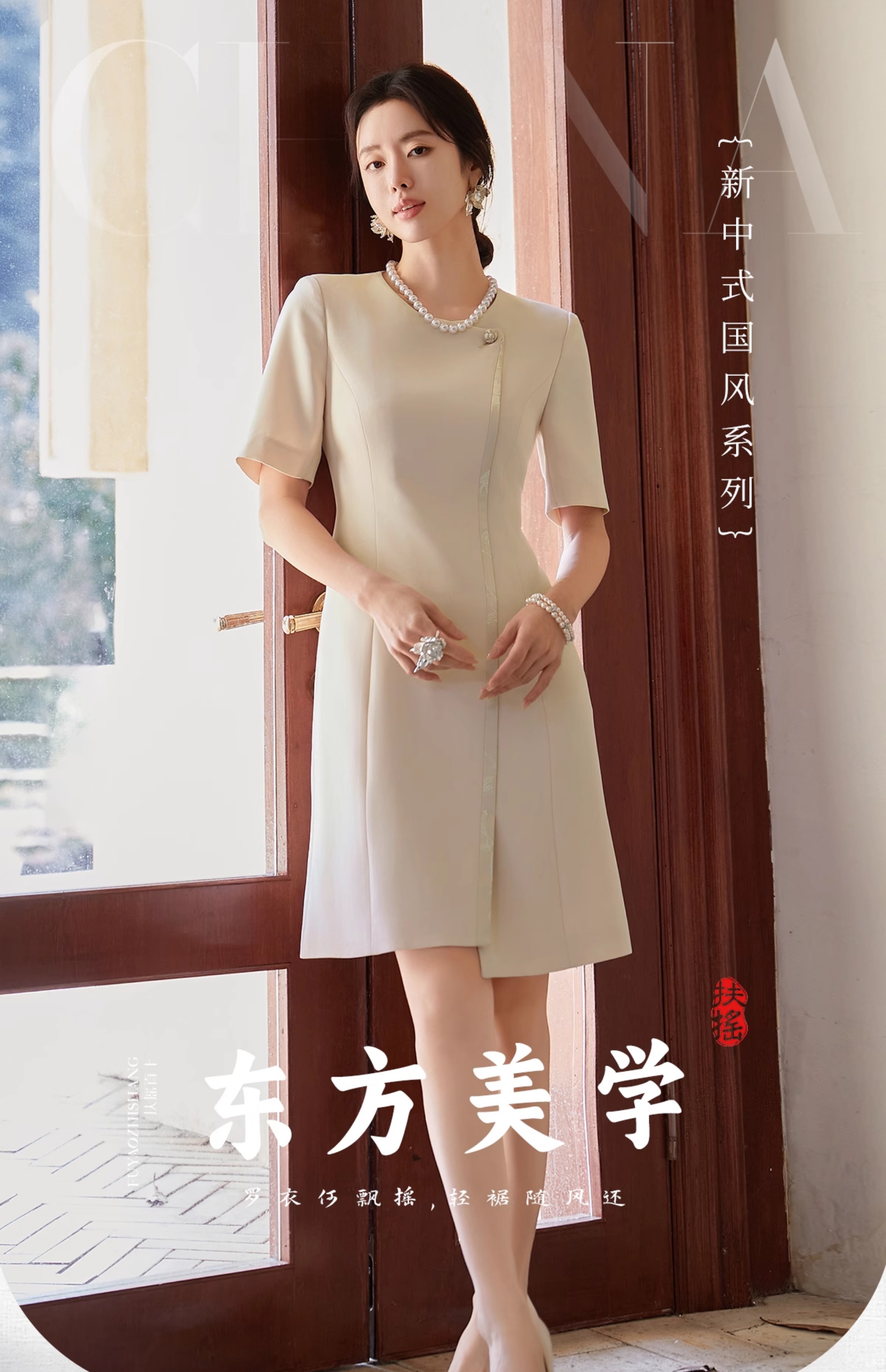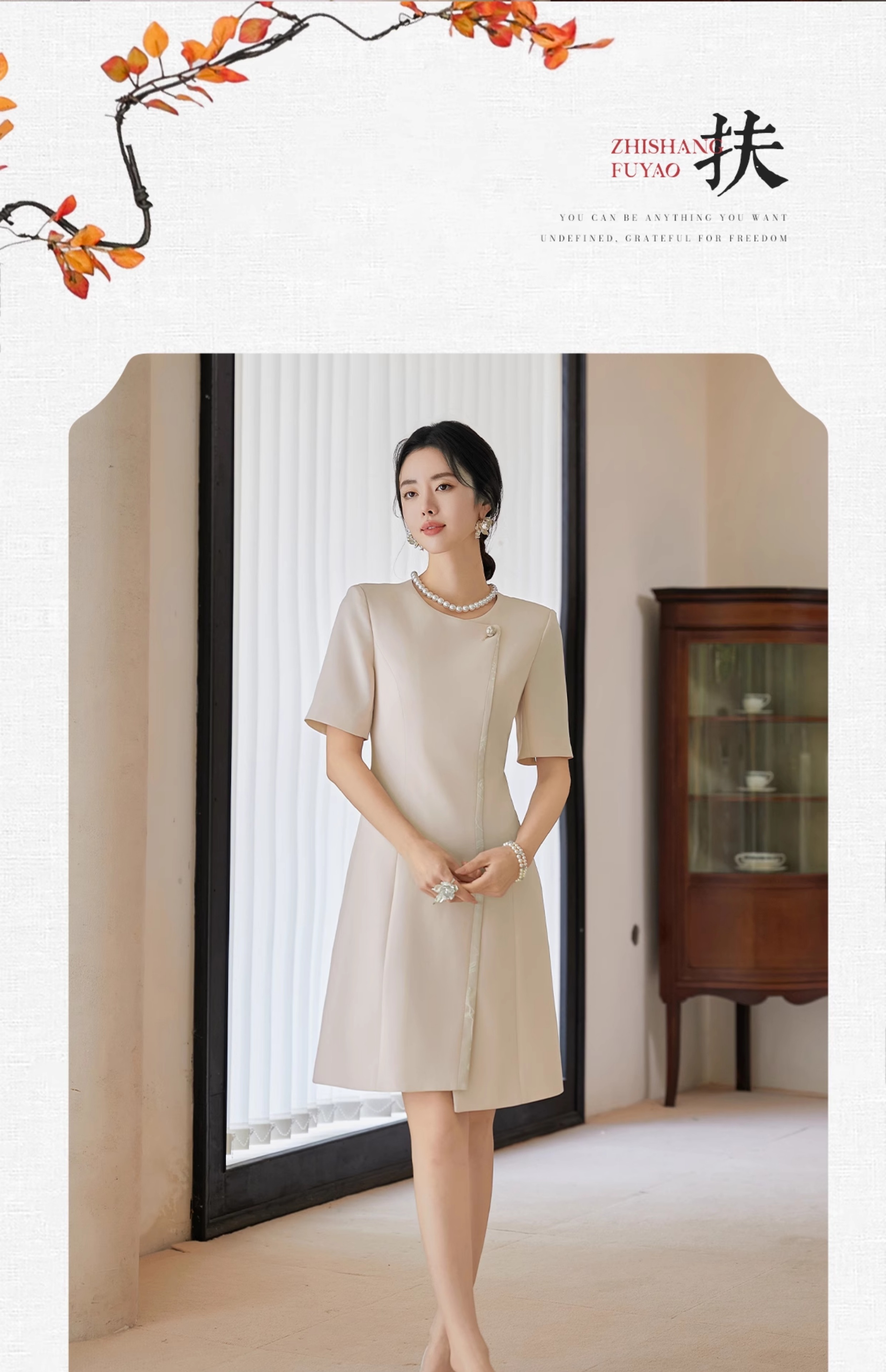 FUYAO扶摇 杏色连衣裙女2025夏季国风盘扣女裙高级感醋酸圆领裙子