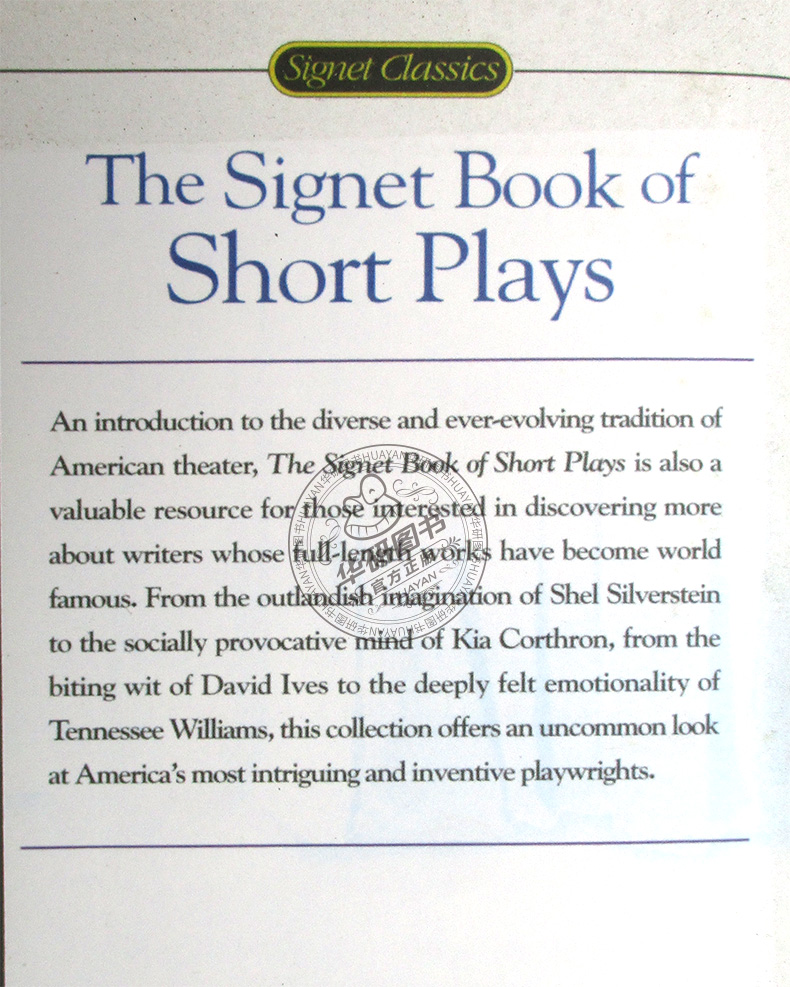 The Signet Book of Short Plays《美国短篇戏剧集》收录了田纳西·威廉斯(Tennessee Williams)、霍顿·福特(Horton Foote)、温迪•华瑟斯廷(Wendy Wasserstein)等美国知名剧作家的12部短篇戏剧,包括The Case of the Crushed Petunias: A Lyrical Fantasy、Blind Date、Tender Offer等。
