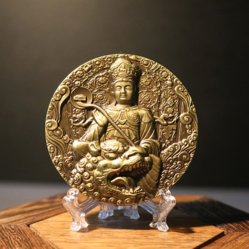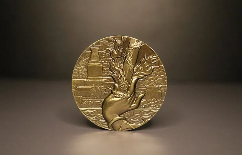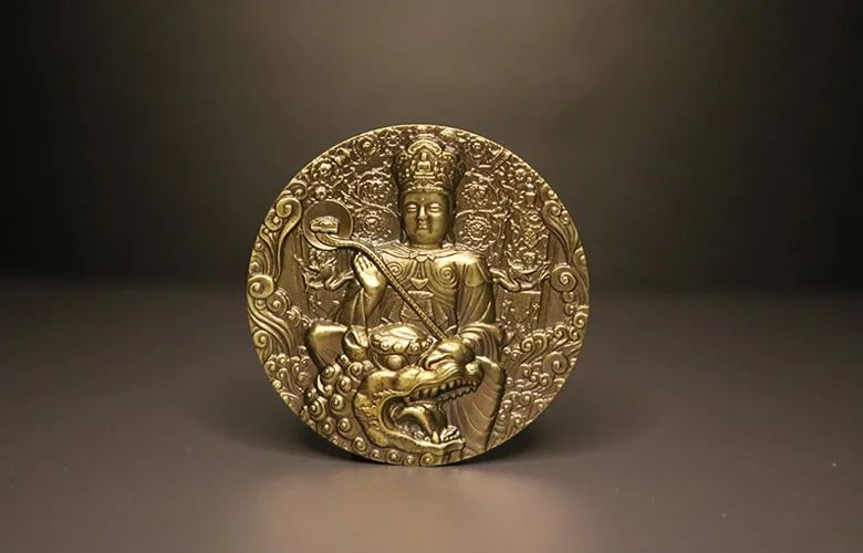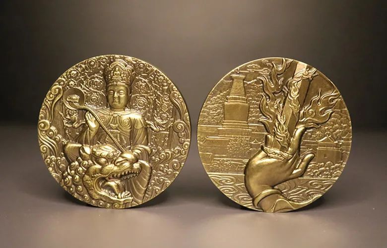 大铜章背面为文殊手持慧剑斩断众生烦怨。背景为五台山大白塔,寺庙殿院,气魄雄旷;禅堂僧舍,香火缭绕。